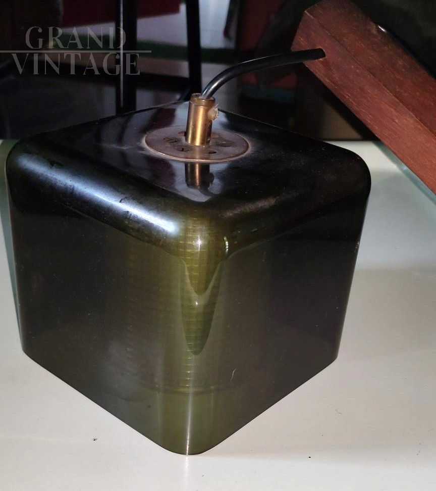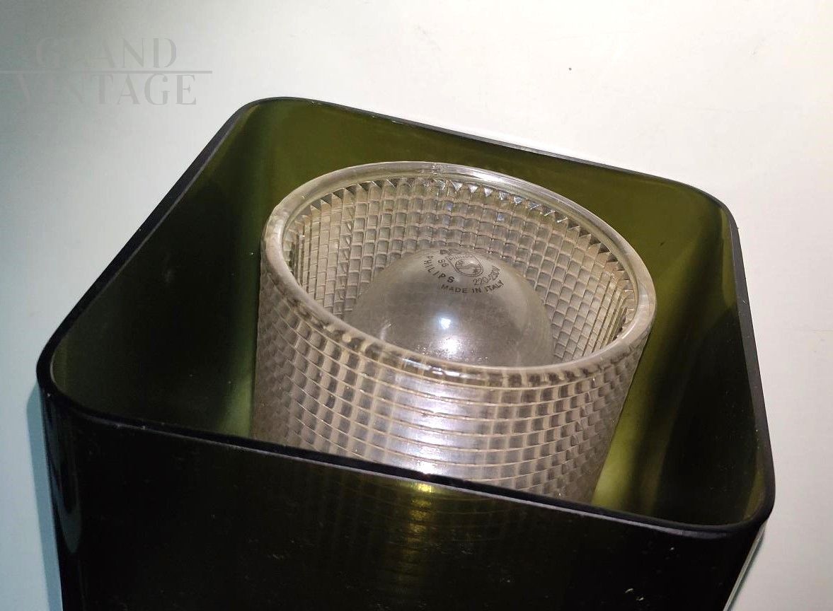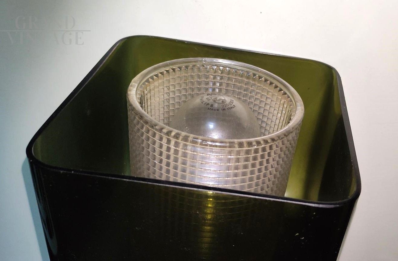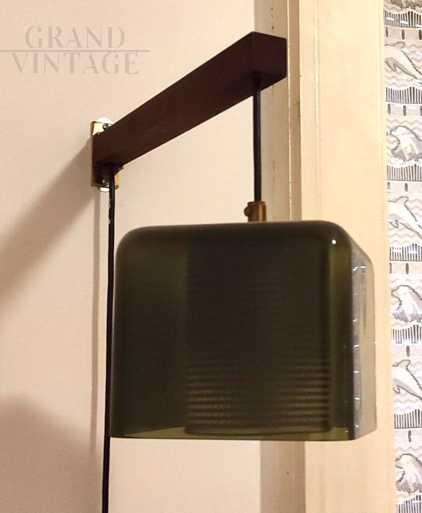 Scandinavian hanging wall lamp or pendant lamp, design by Carl Fagerlund for Orrefors glassworks, in dark green artistic glass, Sweden, 1960s. The lamp is characterized by a square-shaped dark green glass, and has a transparent knurled glass core, which gives a very special light effect. The lamp can be applied to the wall using a teak bracket, or used without a bracket applied directly to the ceiling.