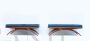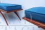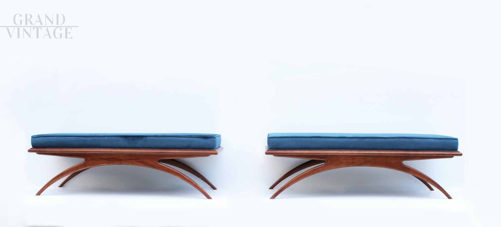Particular indoor benches in Art Deco style with original structure entirely in mahogany and upholstery in petrol blue velvet, Italy from the 1990s. Pairs available, price refers to the single piece. Dimensions: Width 150 cm, depth 47 cm, height 45 cm.