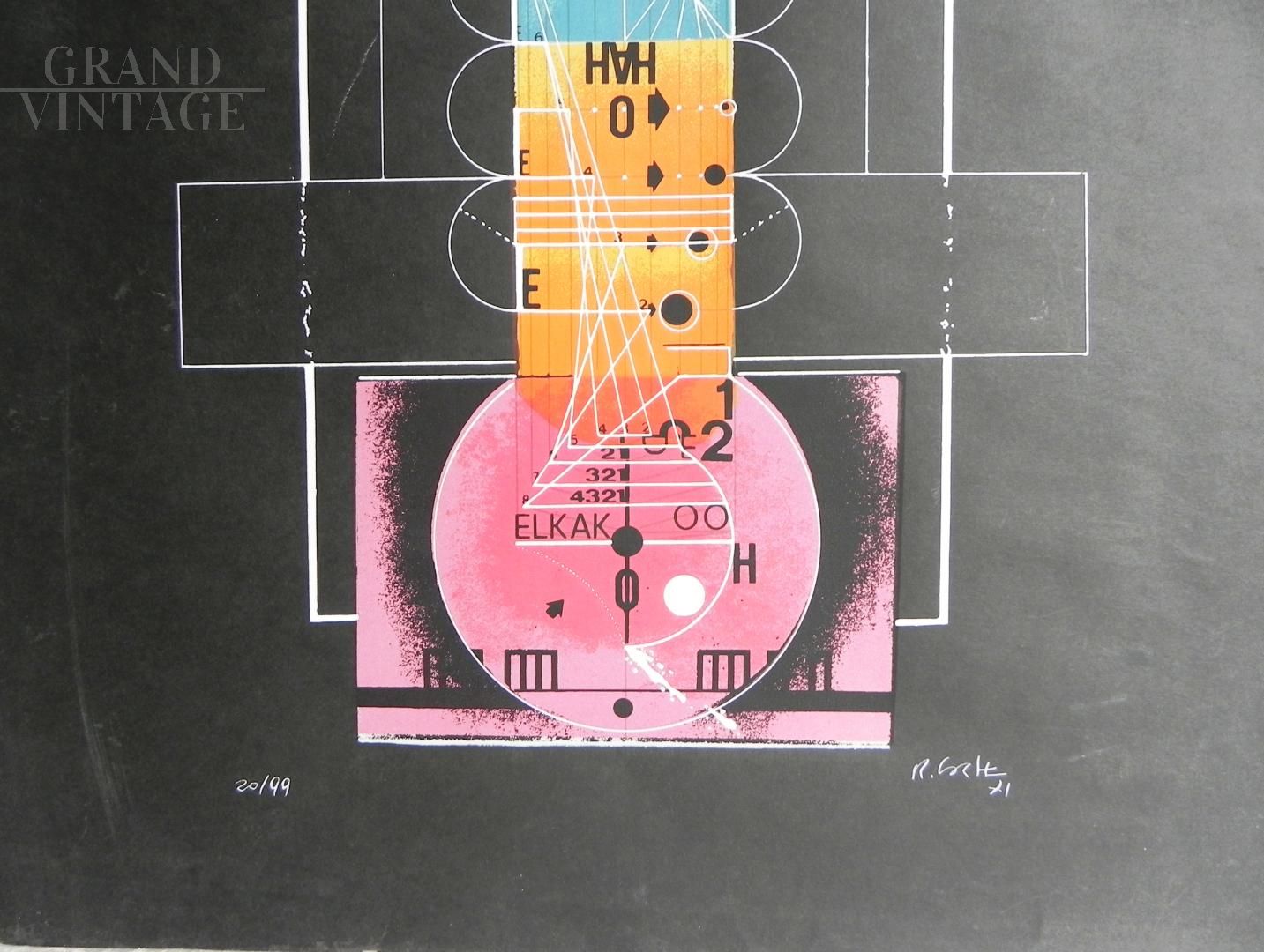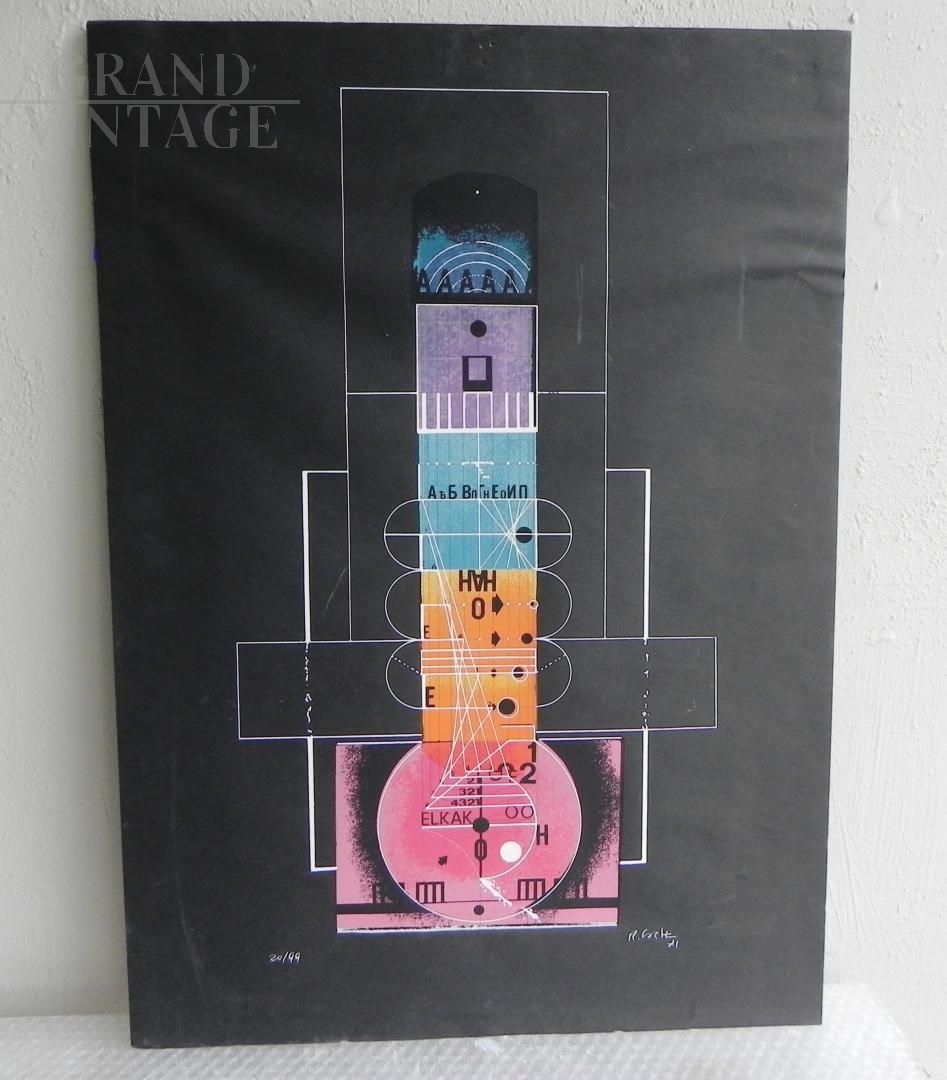 Silkscreen with subject Phallic Geometries, signed, dated 1971 and numbered 20/99, print on black cardboard glued to a picoglass type support, without glass. The signature is at the bottom right. In good condition.