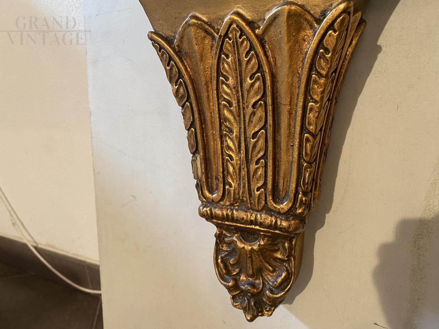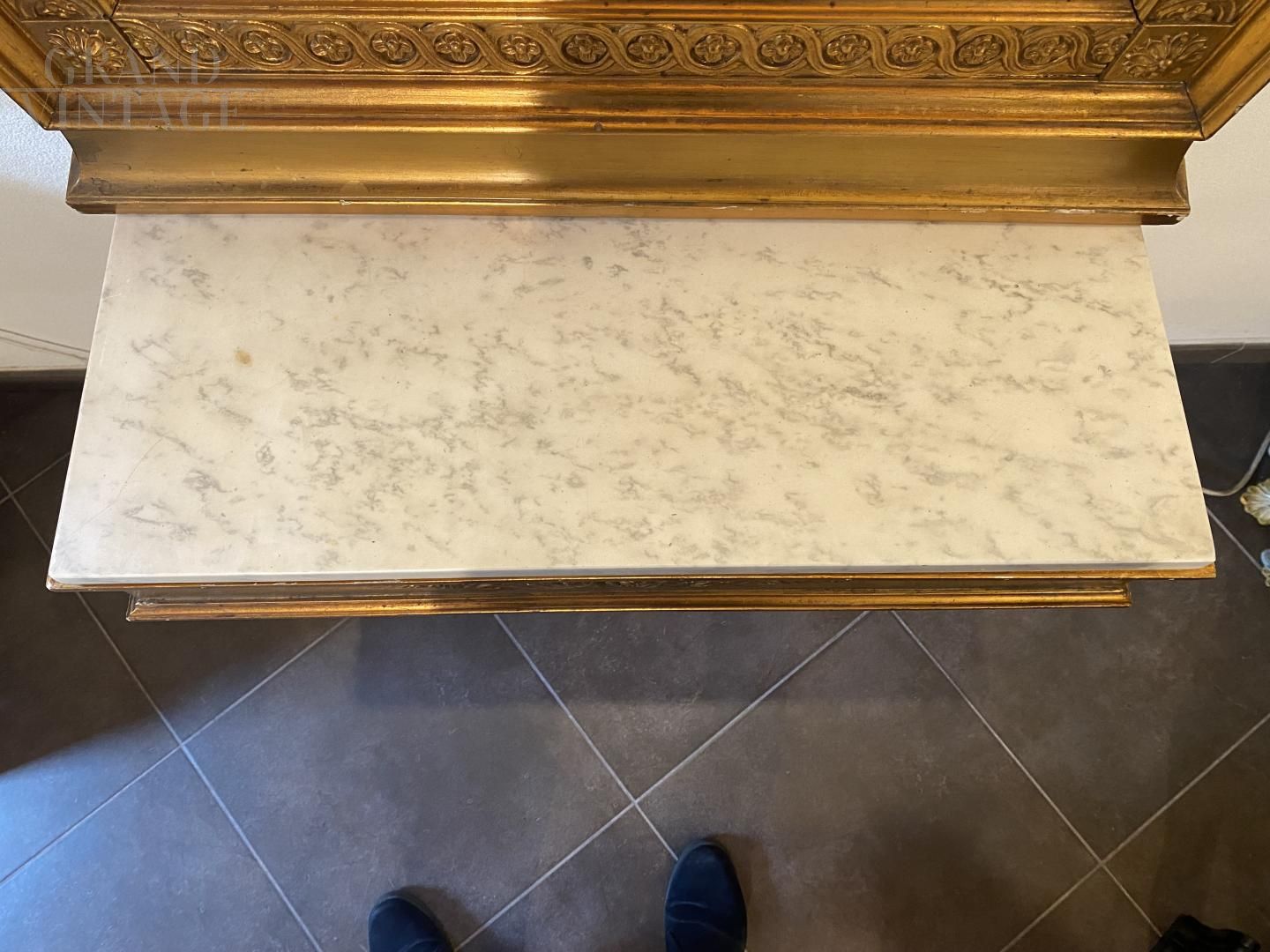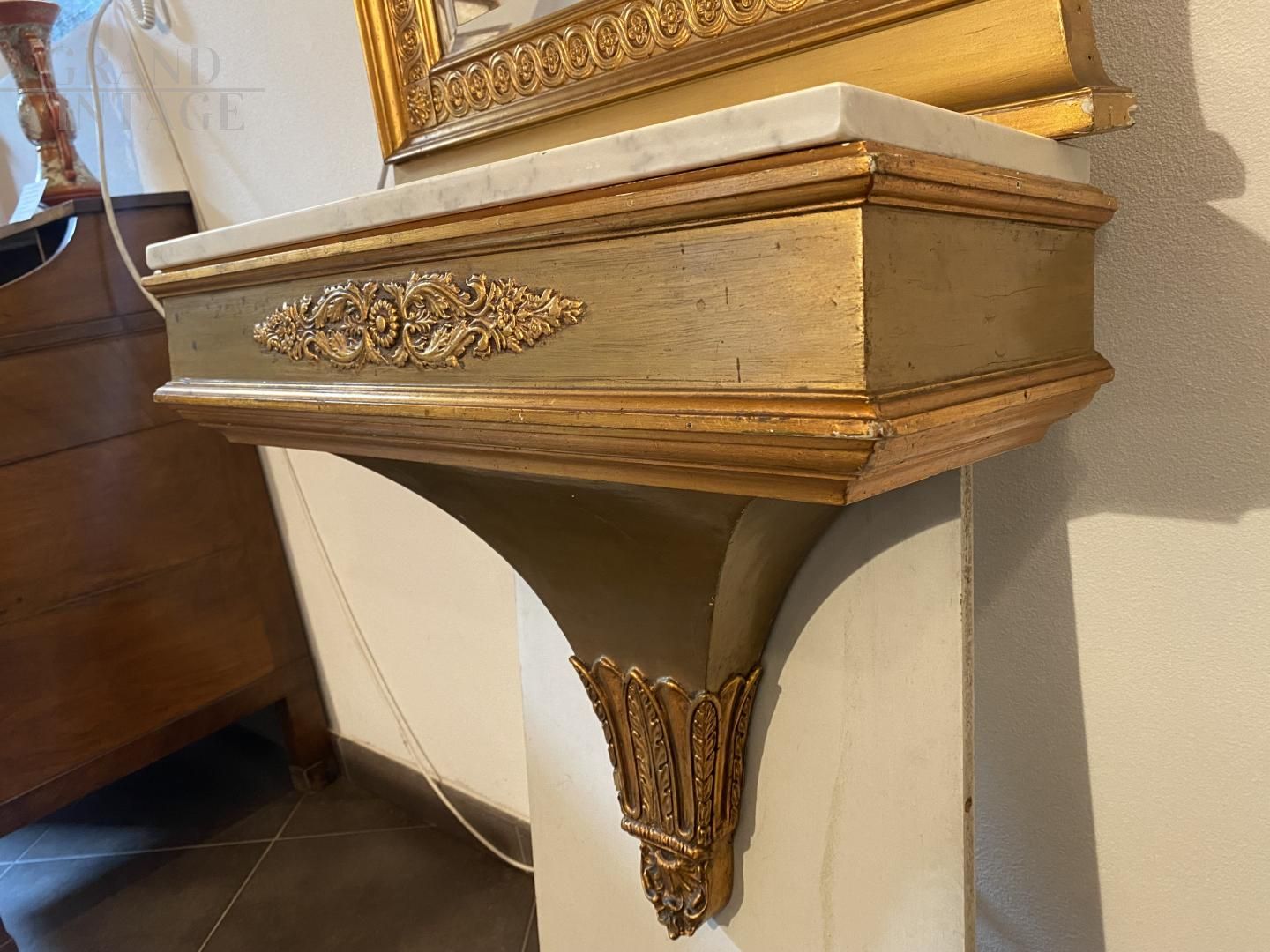 Small antique hanging console from the Empire era with mirror, made of gilded wood and finely carved with floral motifs, equipped with a Carrara marble top, coming from 19th century France.