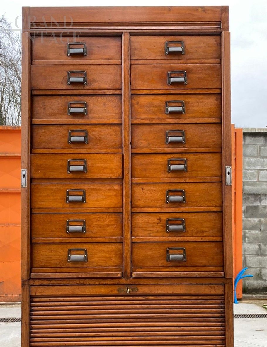 Vintage filing cabinet in oak wood, the upper part is characterized by 16 drawers with tilting front, the lower part is closed by a roller shutter.