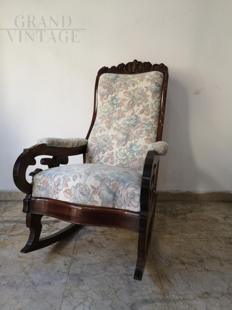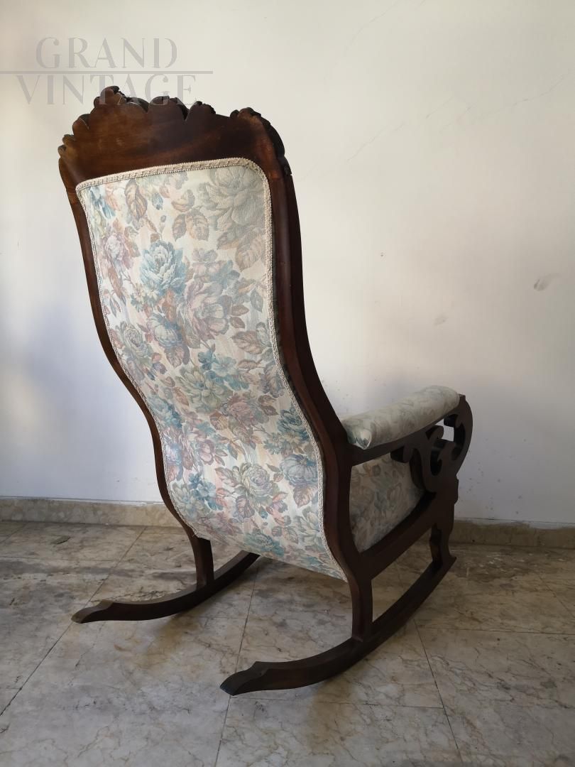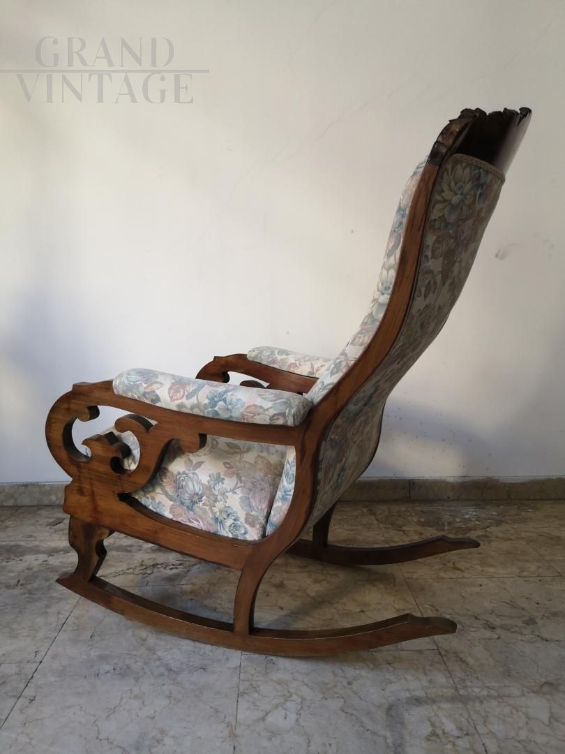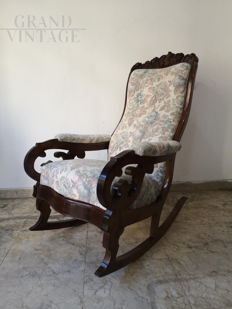 Antique rocking armchair from the Louis Philippe era in carved and sculpted walnut, padded and covered in floral fabric, Italy 1870s - 1880s, in good condition.