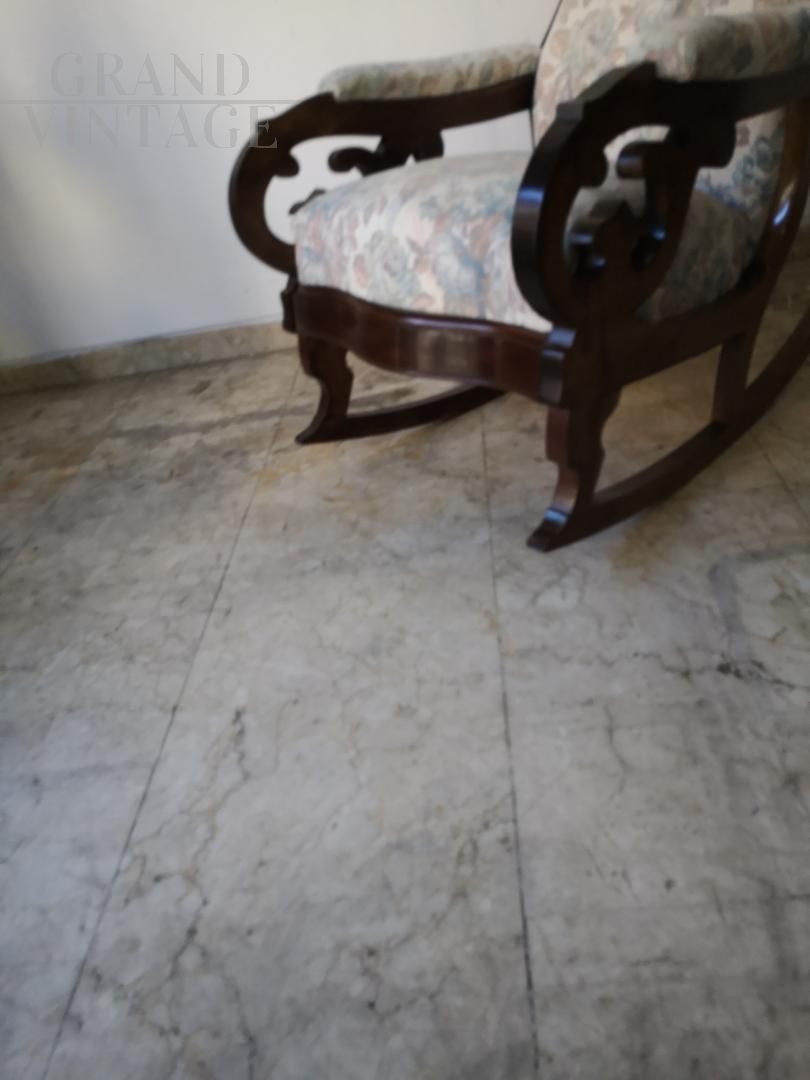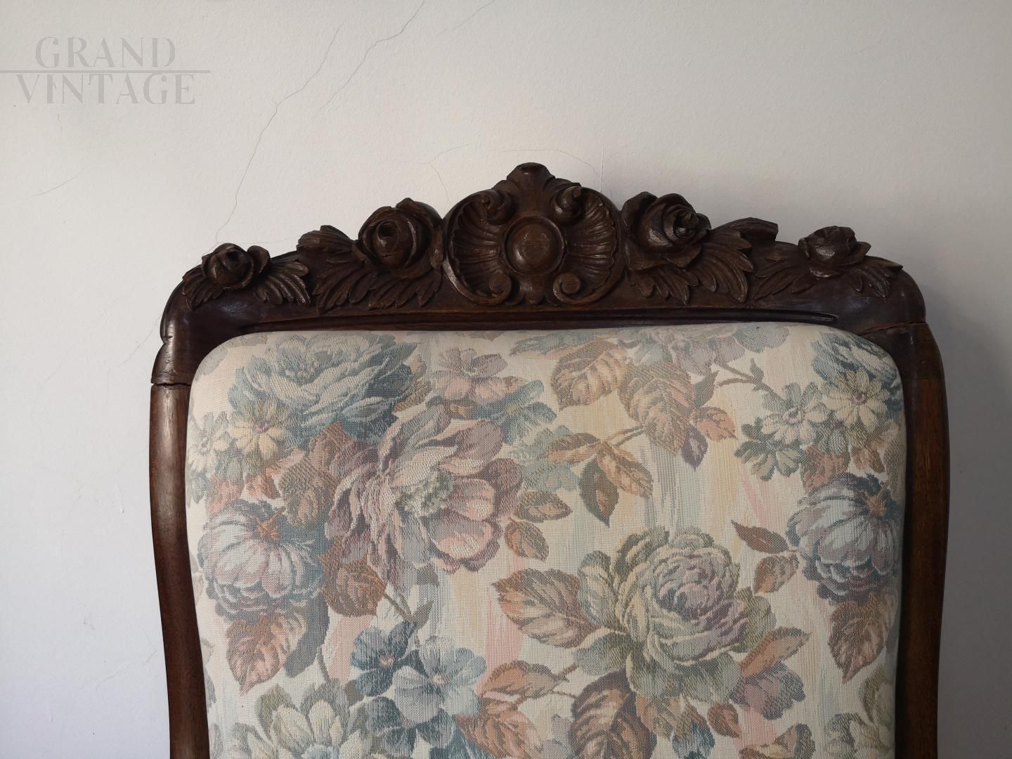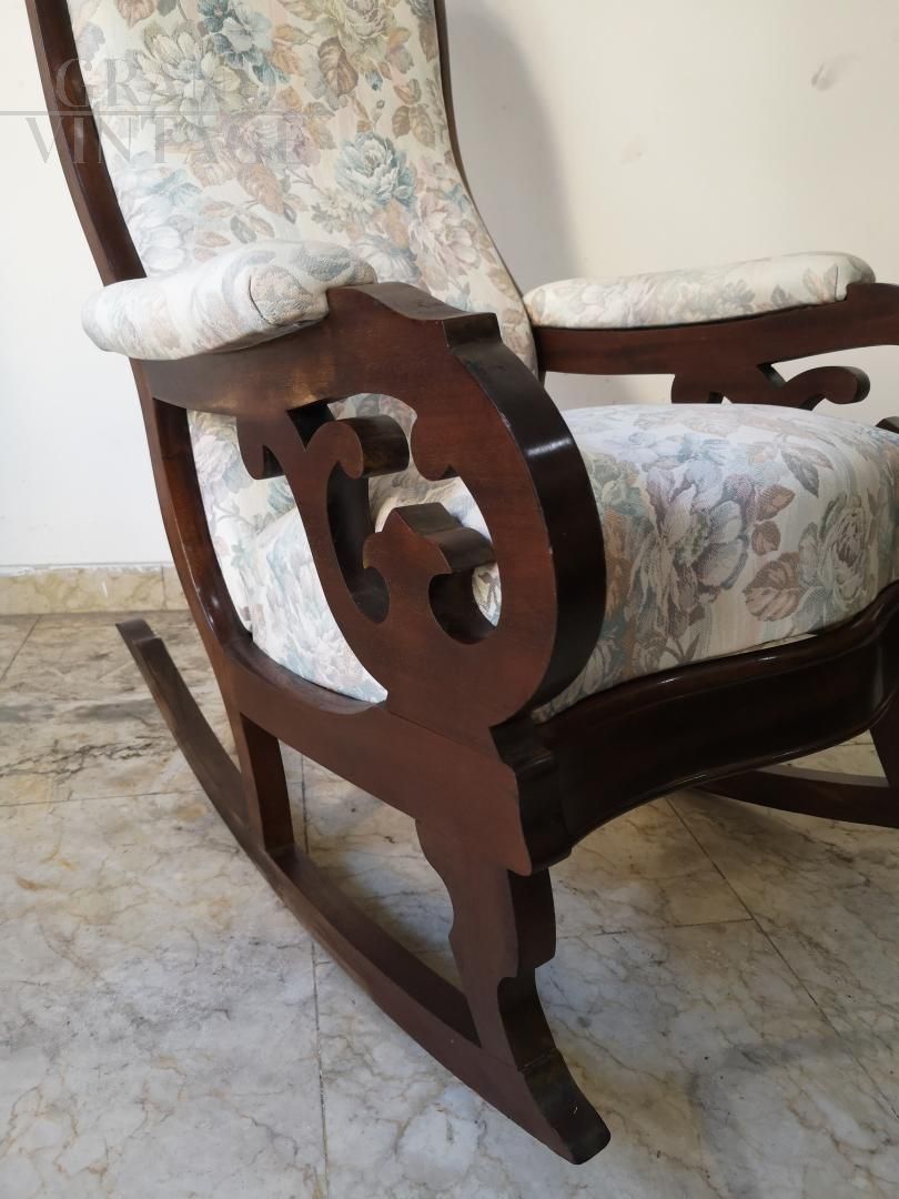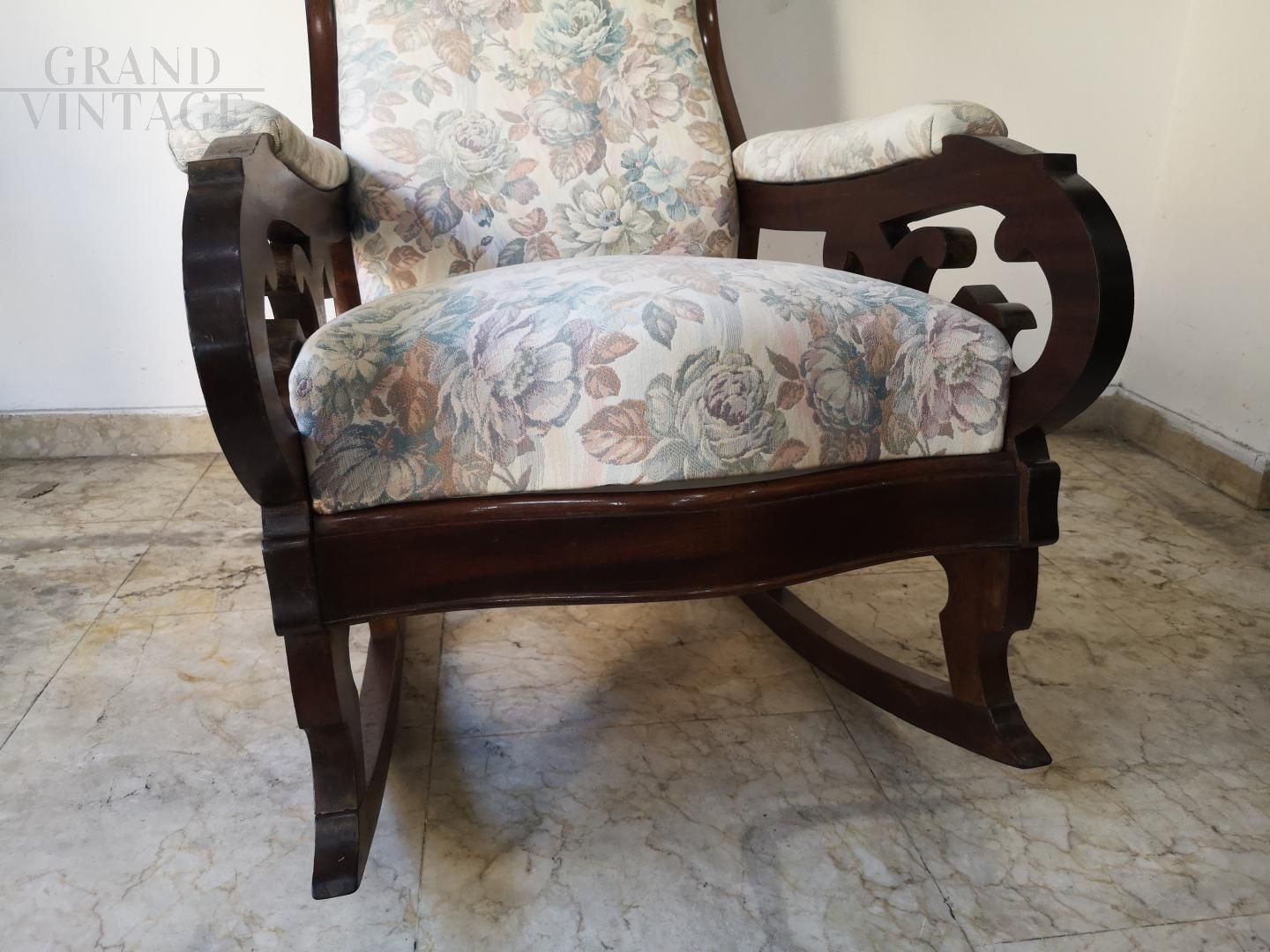 Antique rocking armchair from the Louis Philippe era in carved and sculpted walnut, padded and covered in floral fabric, Italy 1870s - 1880s, in good condition.