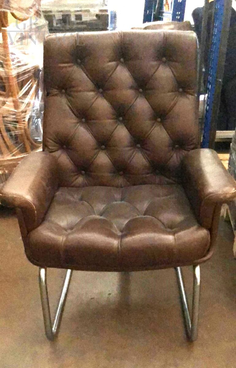 Armchair or executive chair in brown leather with capitonné work and tubular metal base, in excellent condition. Several pieces available, which were part of a meeting room around an executive table.