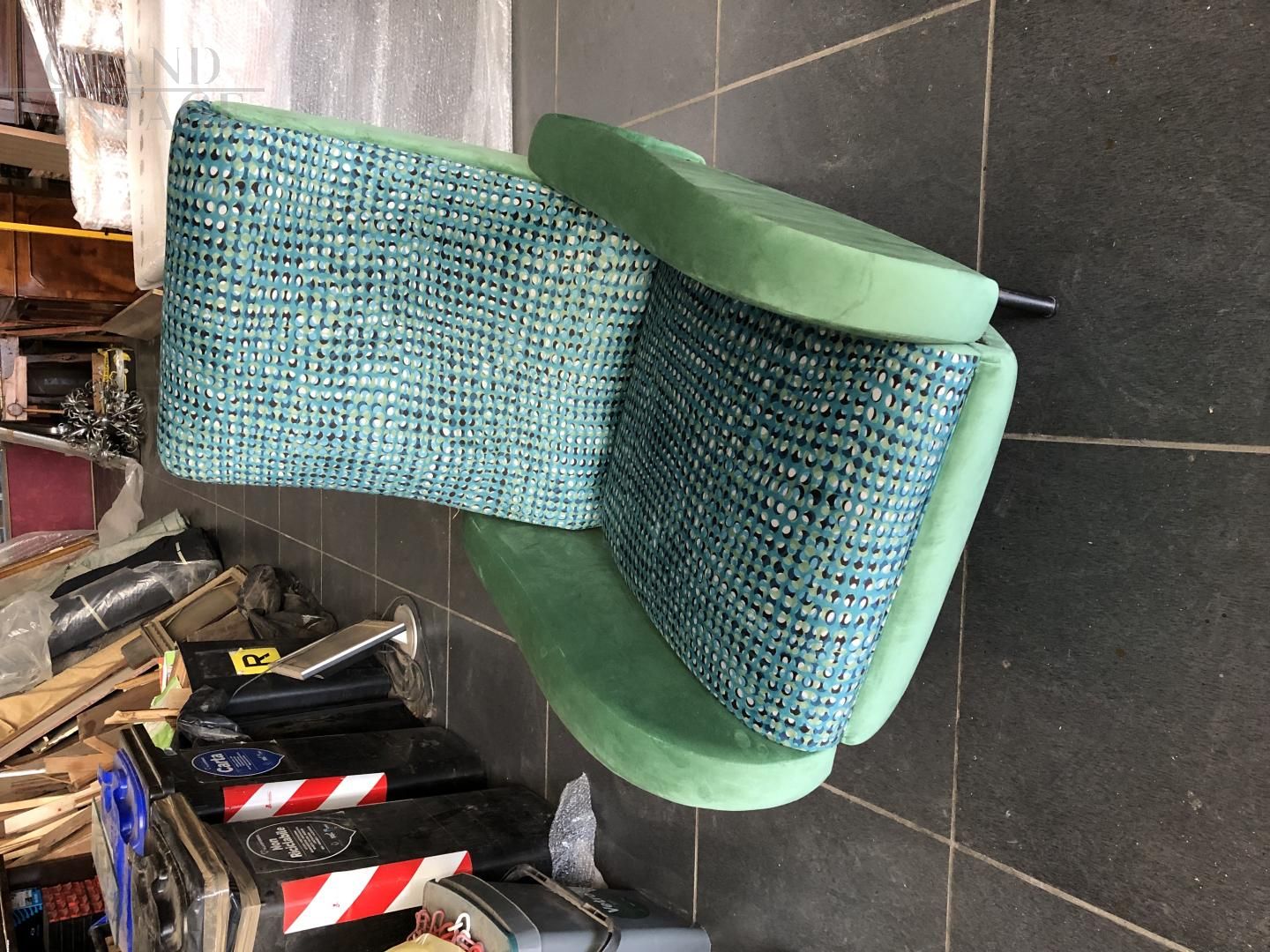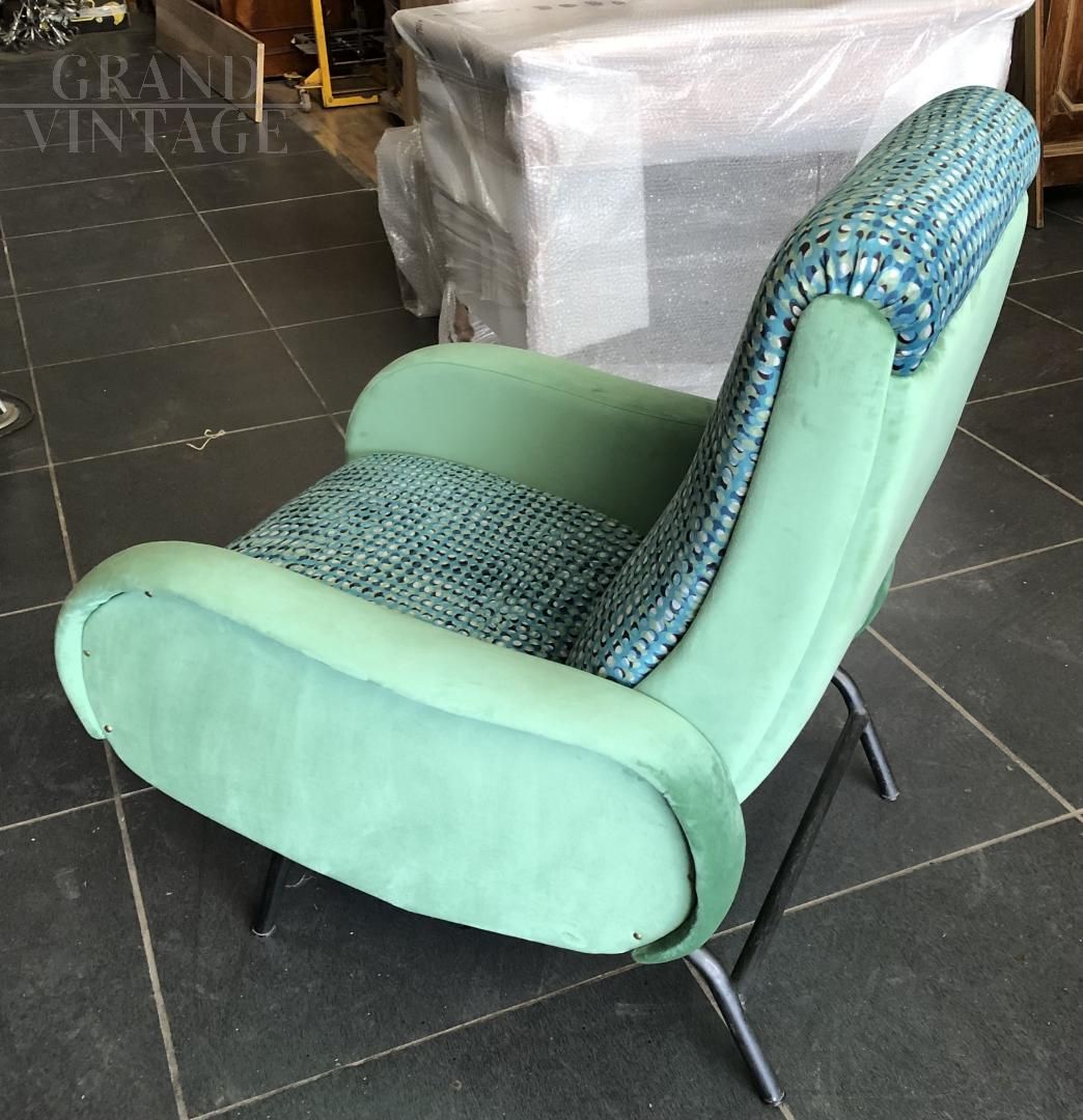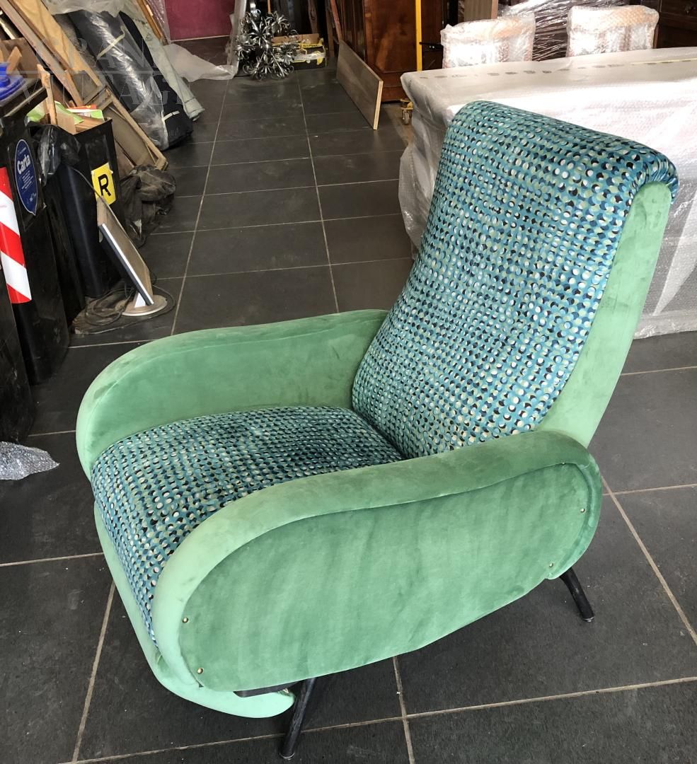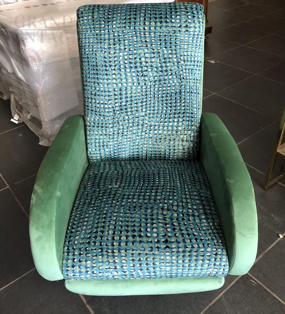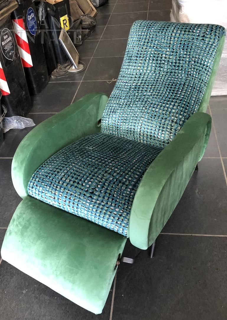Vintage 1950s design reclining armchair Lady Zanuso style, upholstered in green and patterned velvet. Very comfortable and enveloping, a classic of Italian mid-century design. Very good condition.