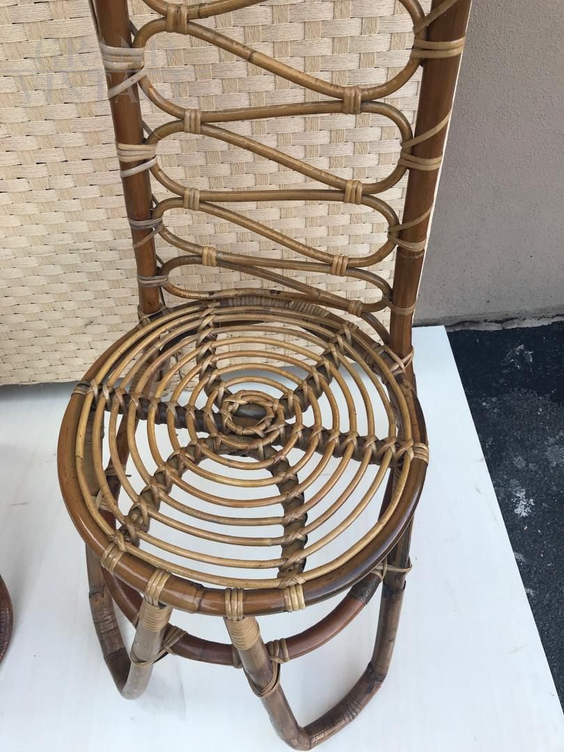 Pair of vintage wicker armchairs with high back, produced in the mid-60s, attributable to the production of the Bonacina company. The armchairs are in excellent condition, the cushions were created in the period.