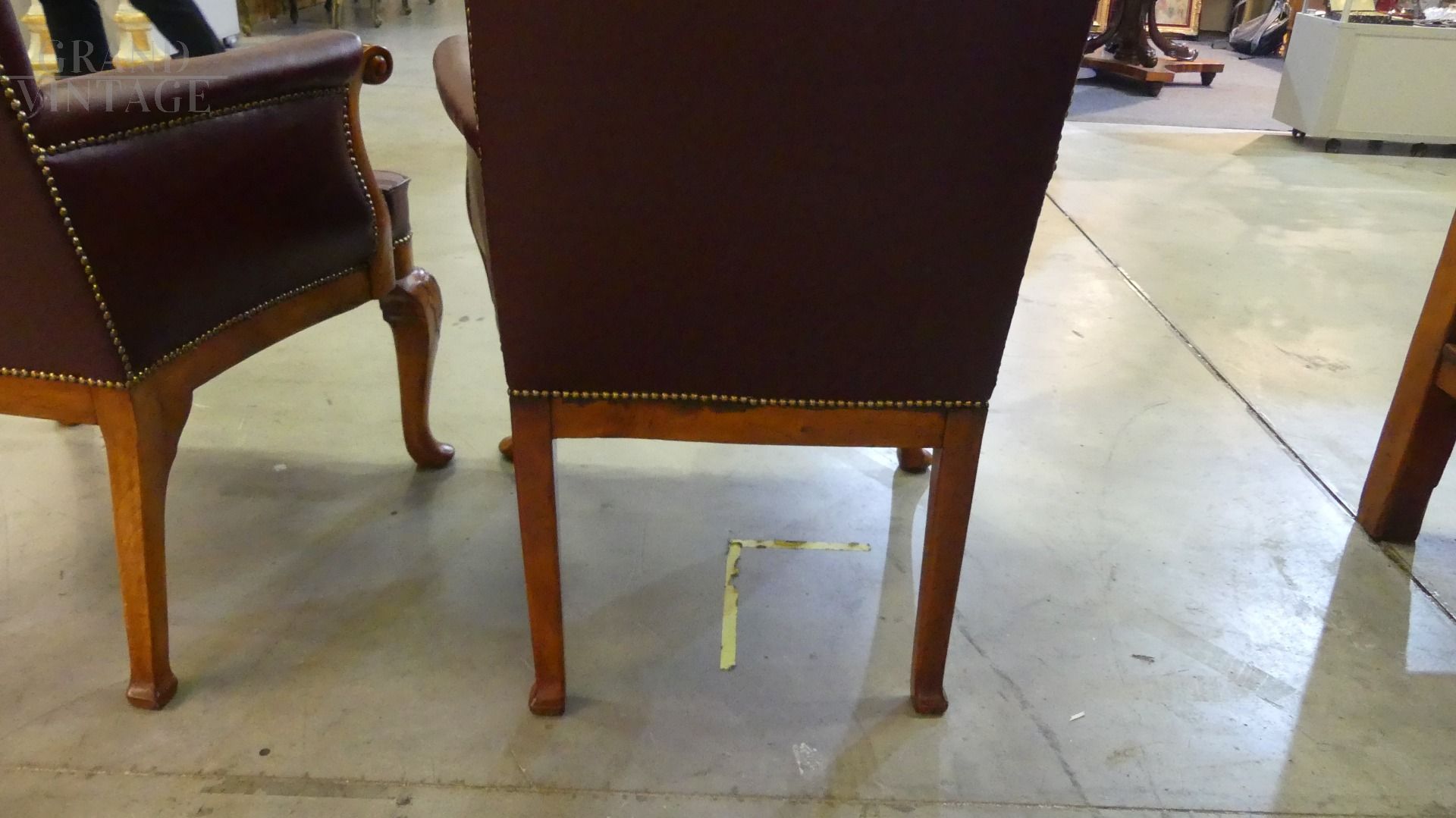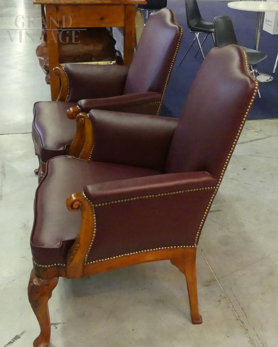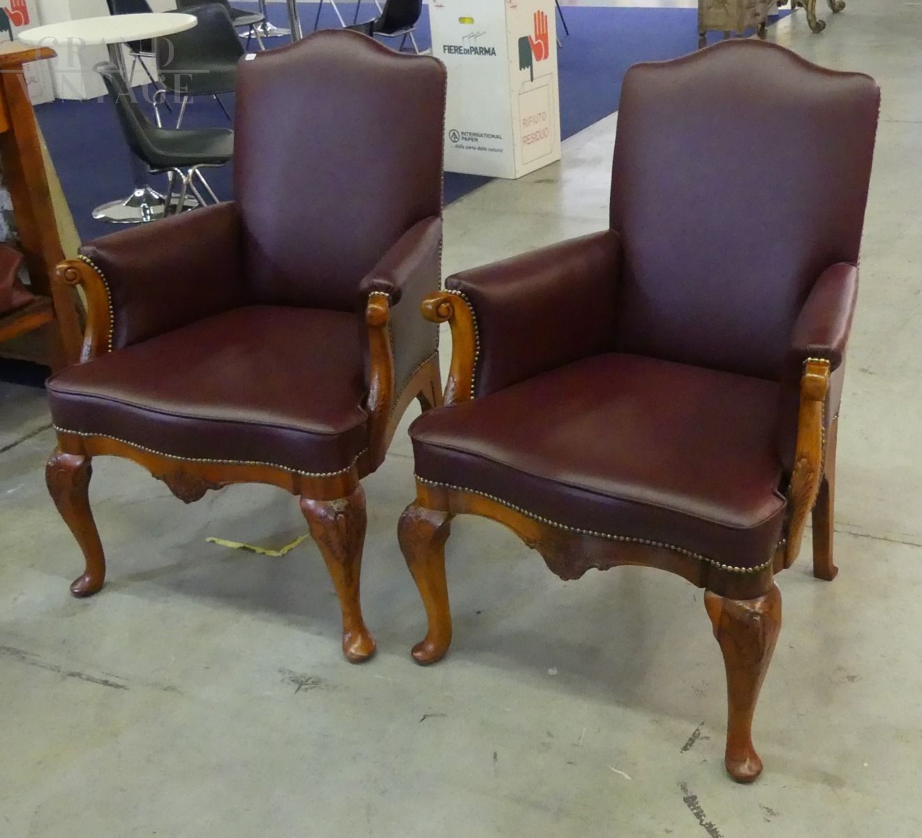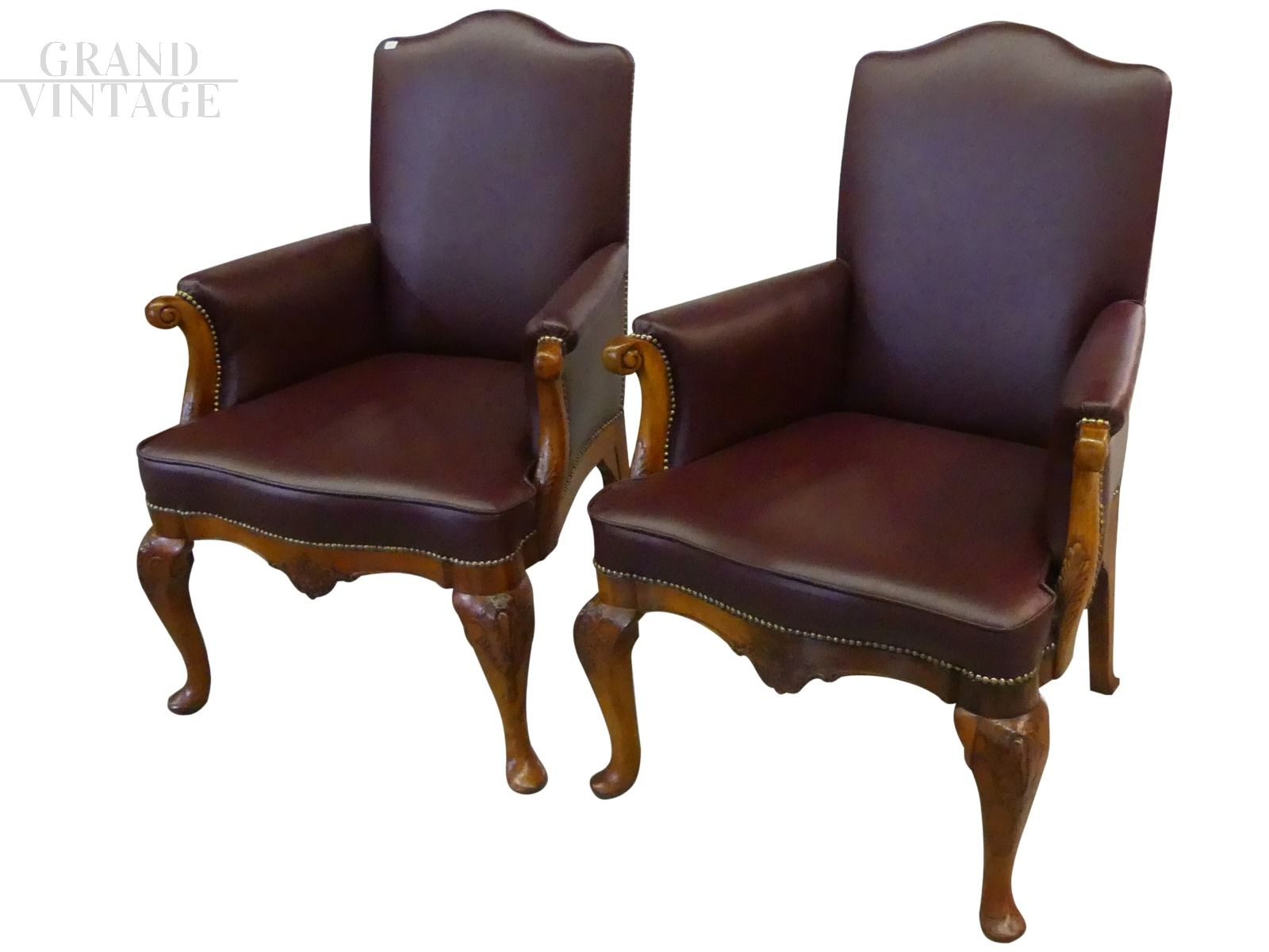 Pair of English Victorian period armchairs, 1870. They are made of walnut and burgundy leather.