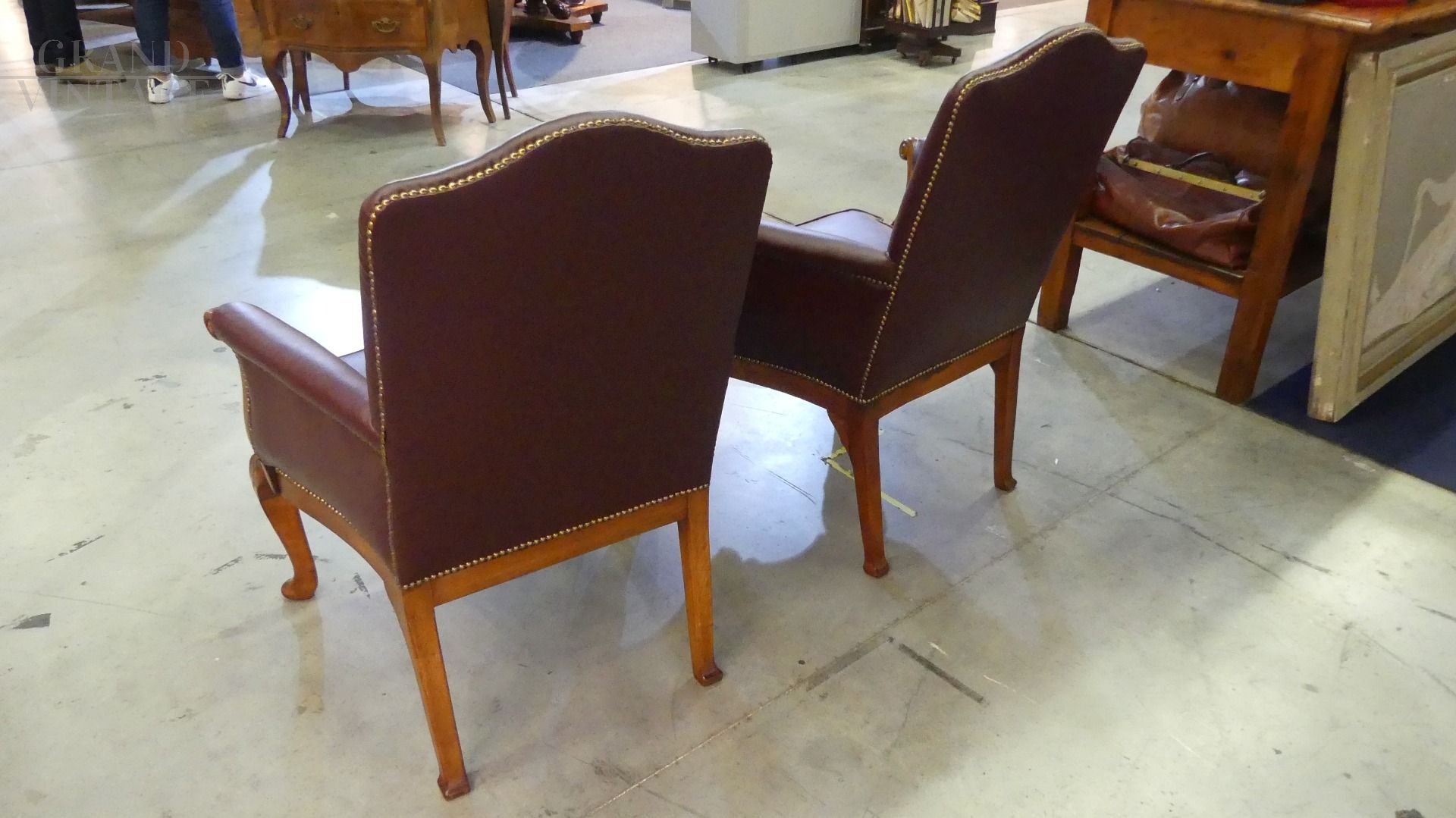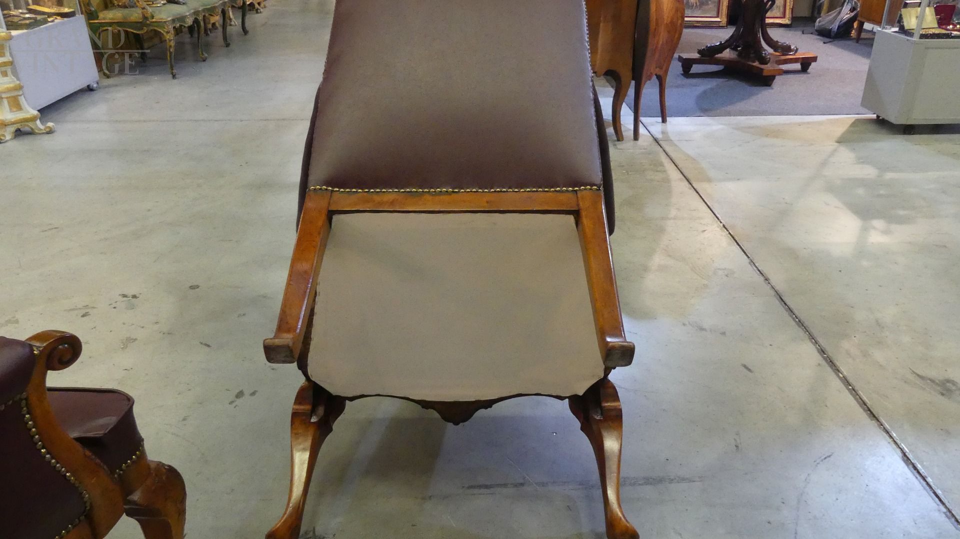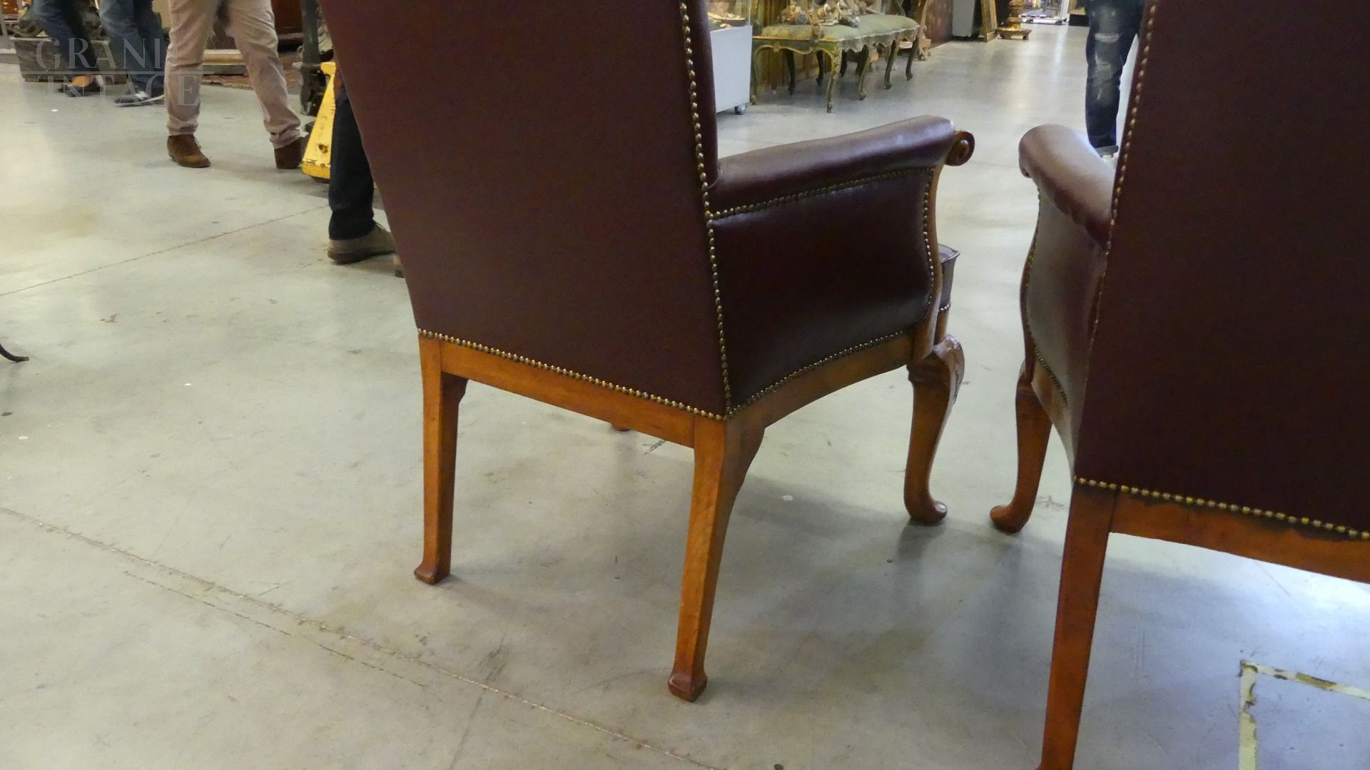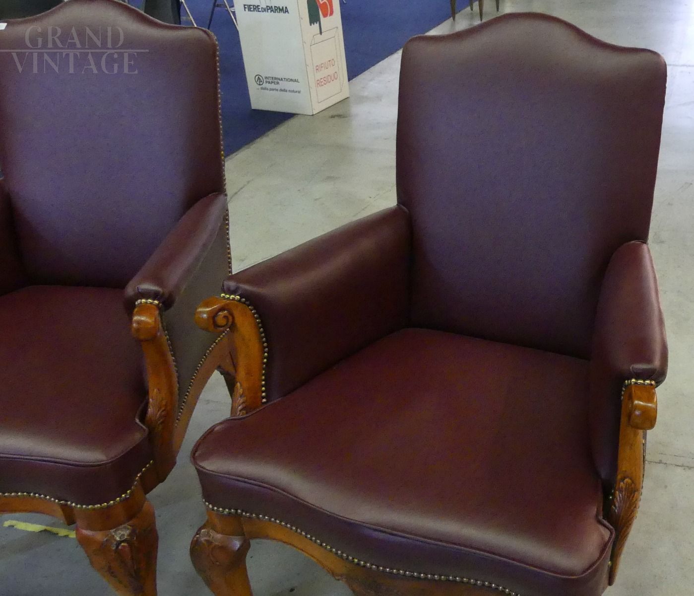 Pair of English Victorian period armchairs, 1870. They are made of walnut and burgundy leather.