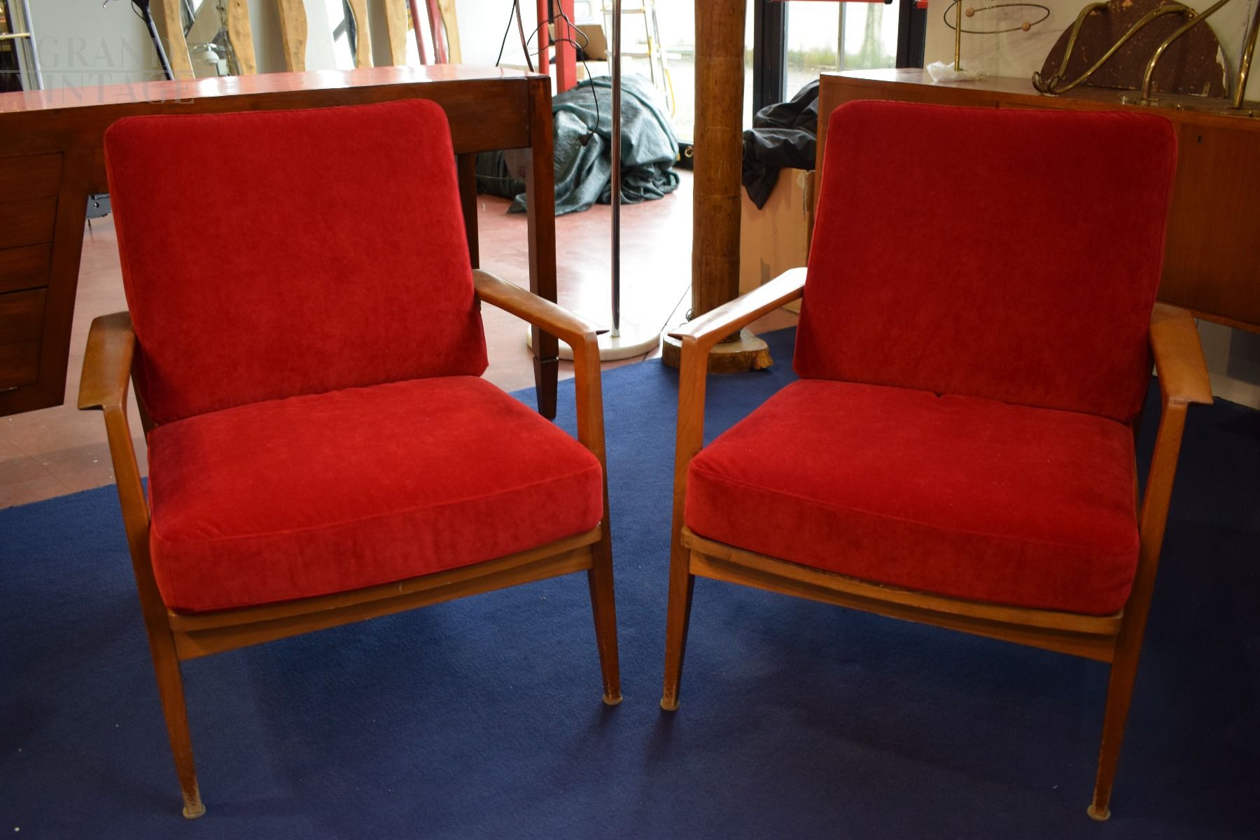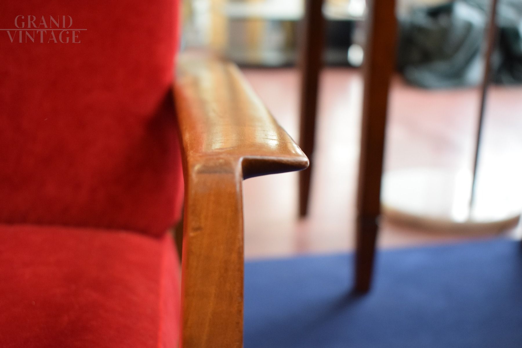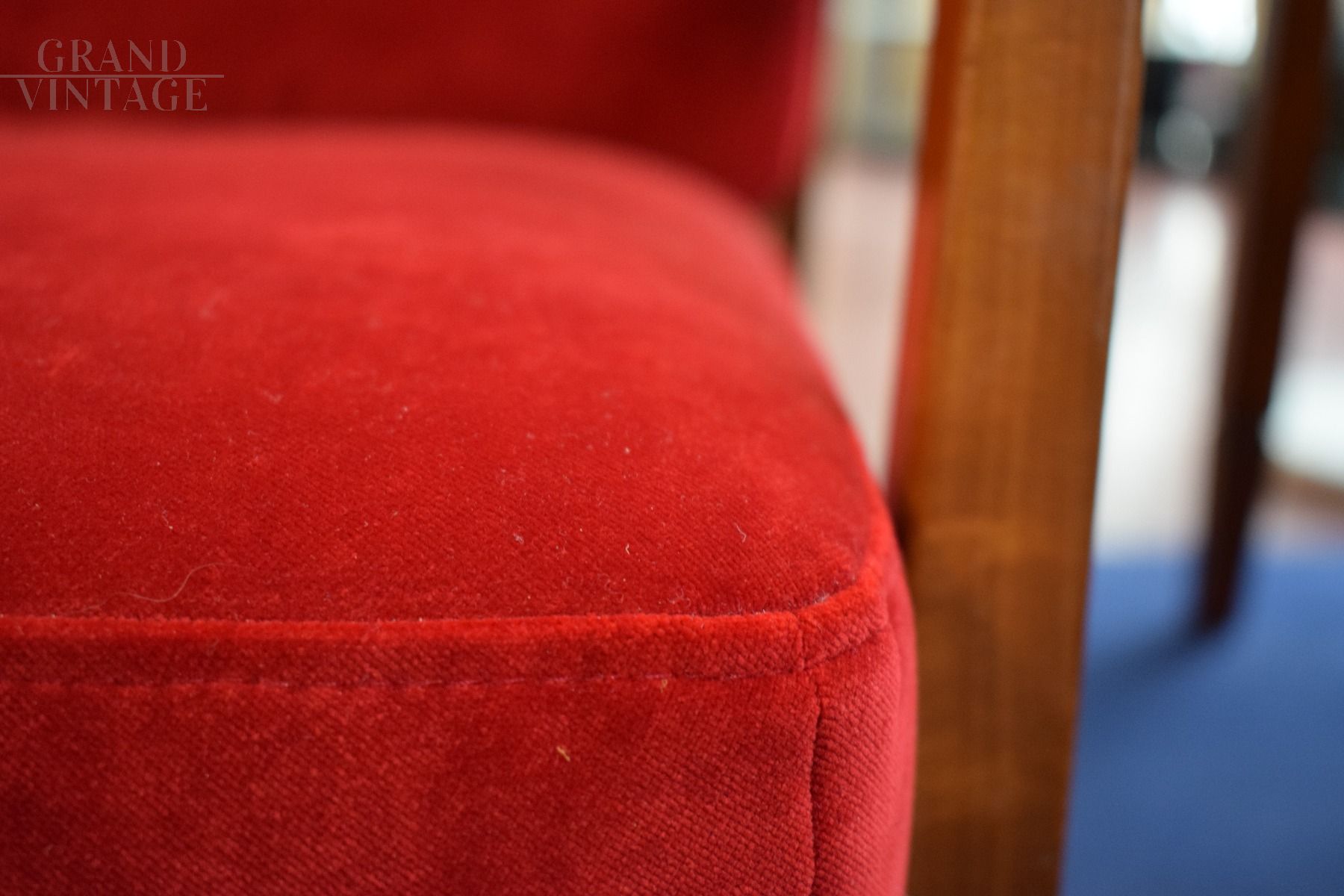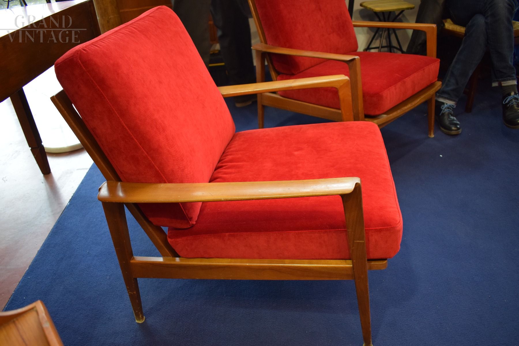 Pair of armchairs designed by KNOLL ANTIMOTT from the 50s produced in cherry wood. New red velvet and padding.