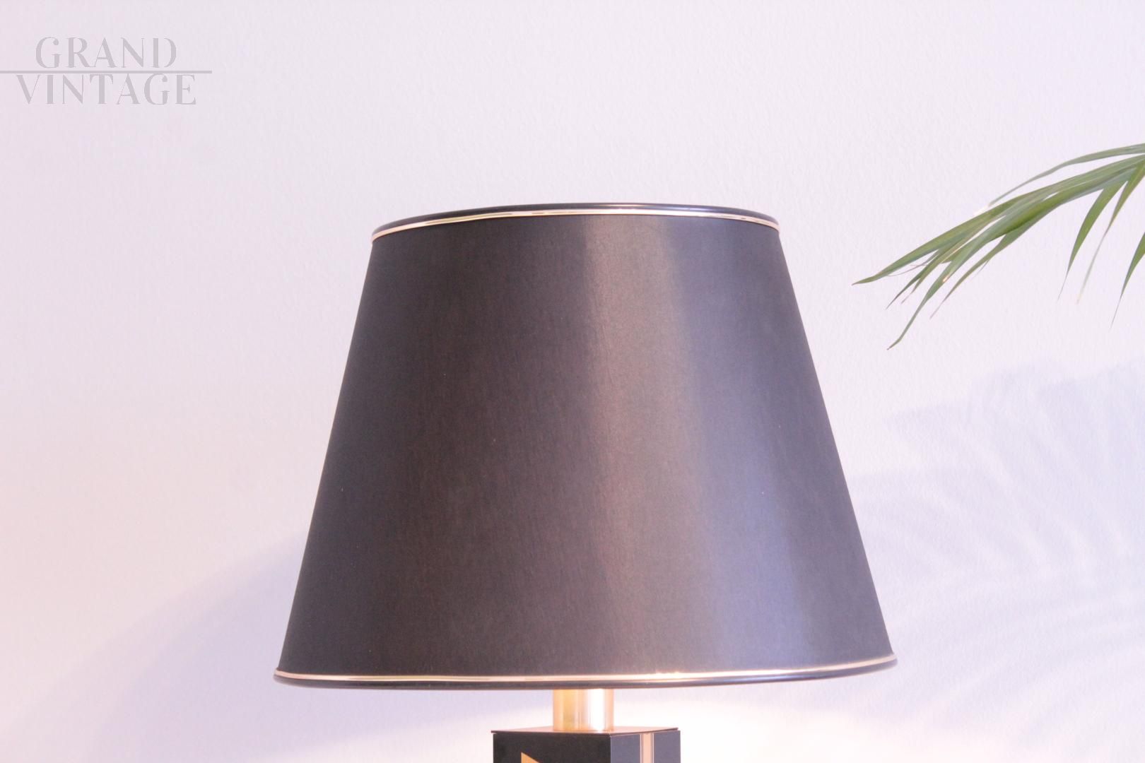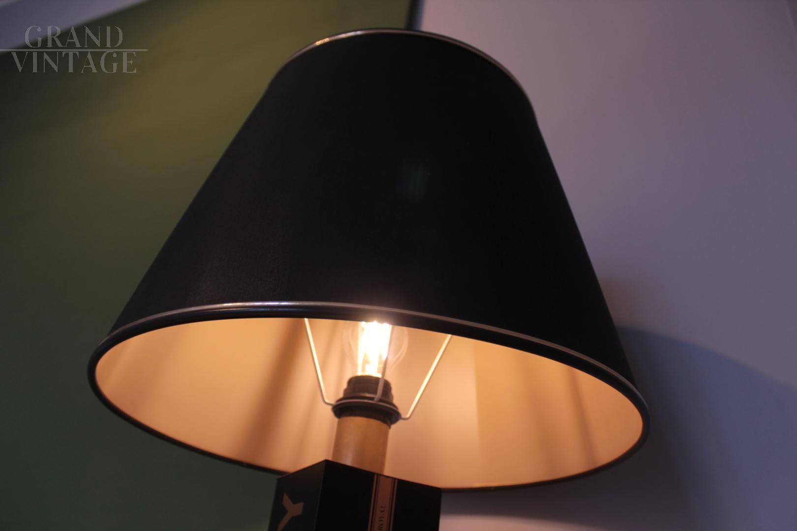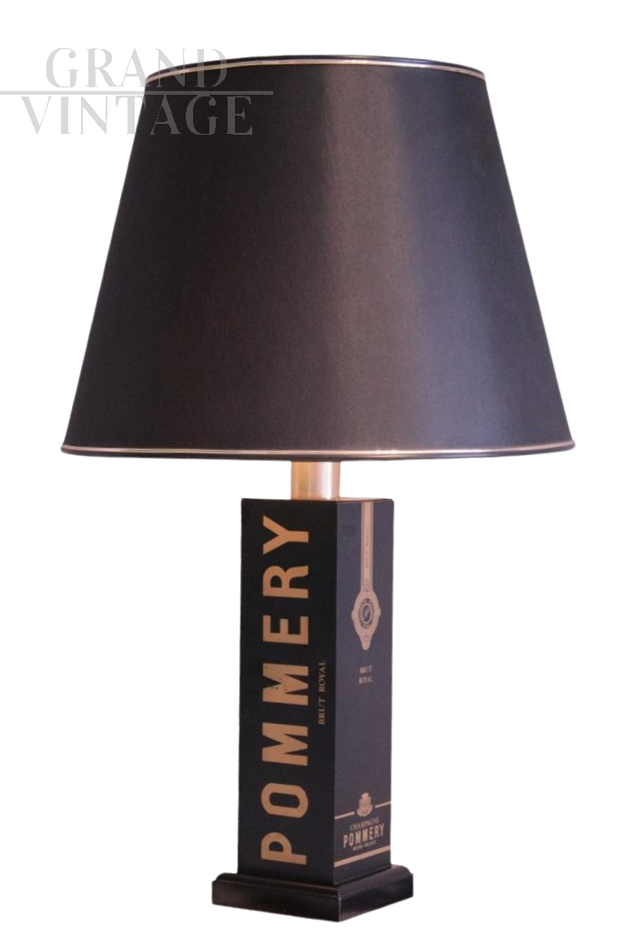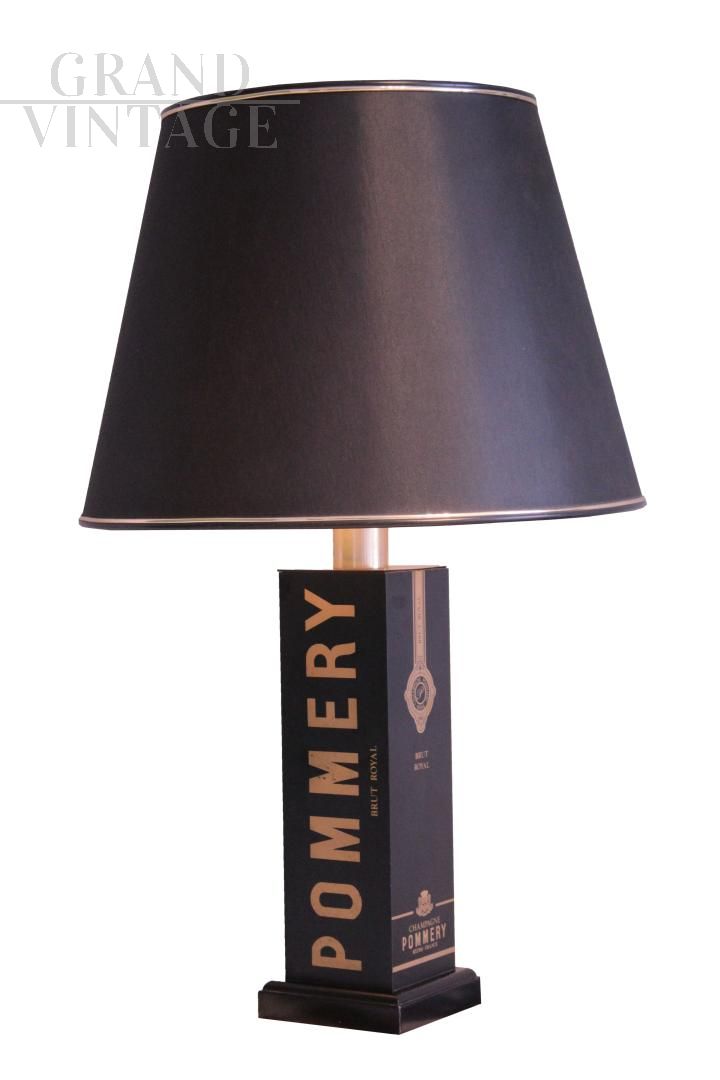 Lampada da tavolo design in stile Hollywood Regency ricavata da una bottiglia di Champagne Pommery, Francia anni '70, La base è in metallo laccato nero con scritte in oro, il paralume è in nero con finiture in oro.