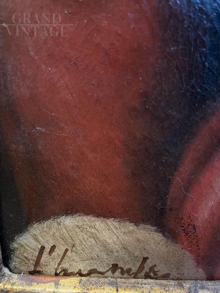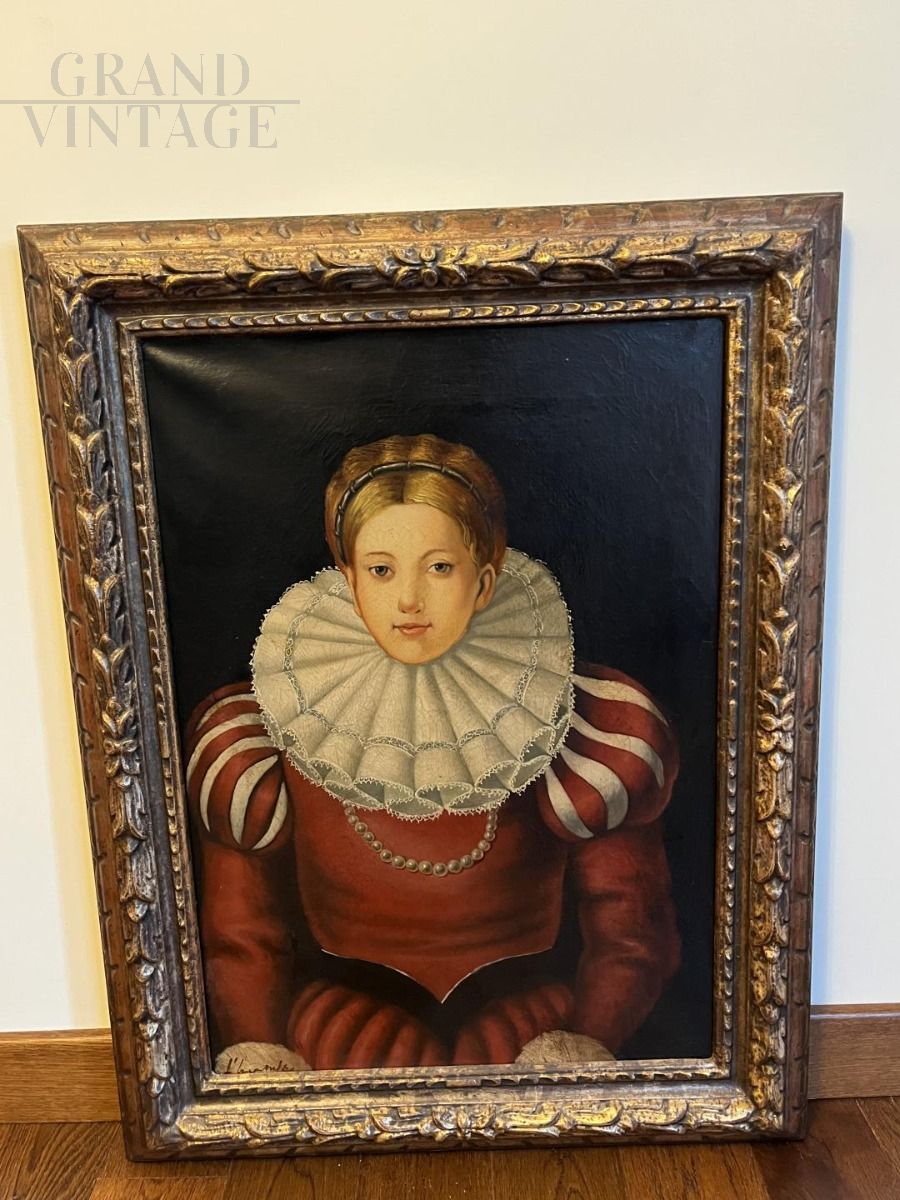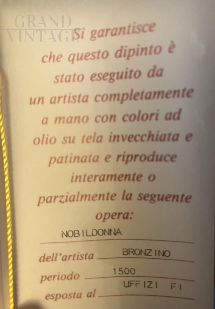 Important copy of the famous Portrait of a Lady painted by Agnolo Bronzino in the 16th century and now preserved in the Uffizi in Florence. An oil on canvas portraying a young noblewoman of the Medici court, dressed in Spanish fashion. A canvas enclosed within a valuable golden carved wooden frame that recalls the motifs of the time. Painting signed by the author lower left, with certificate of guarantee.