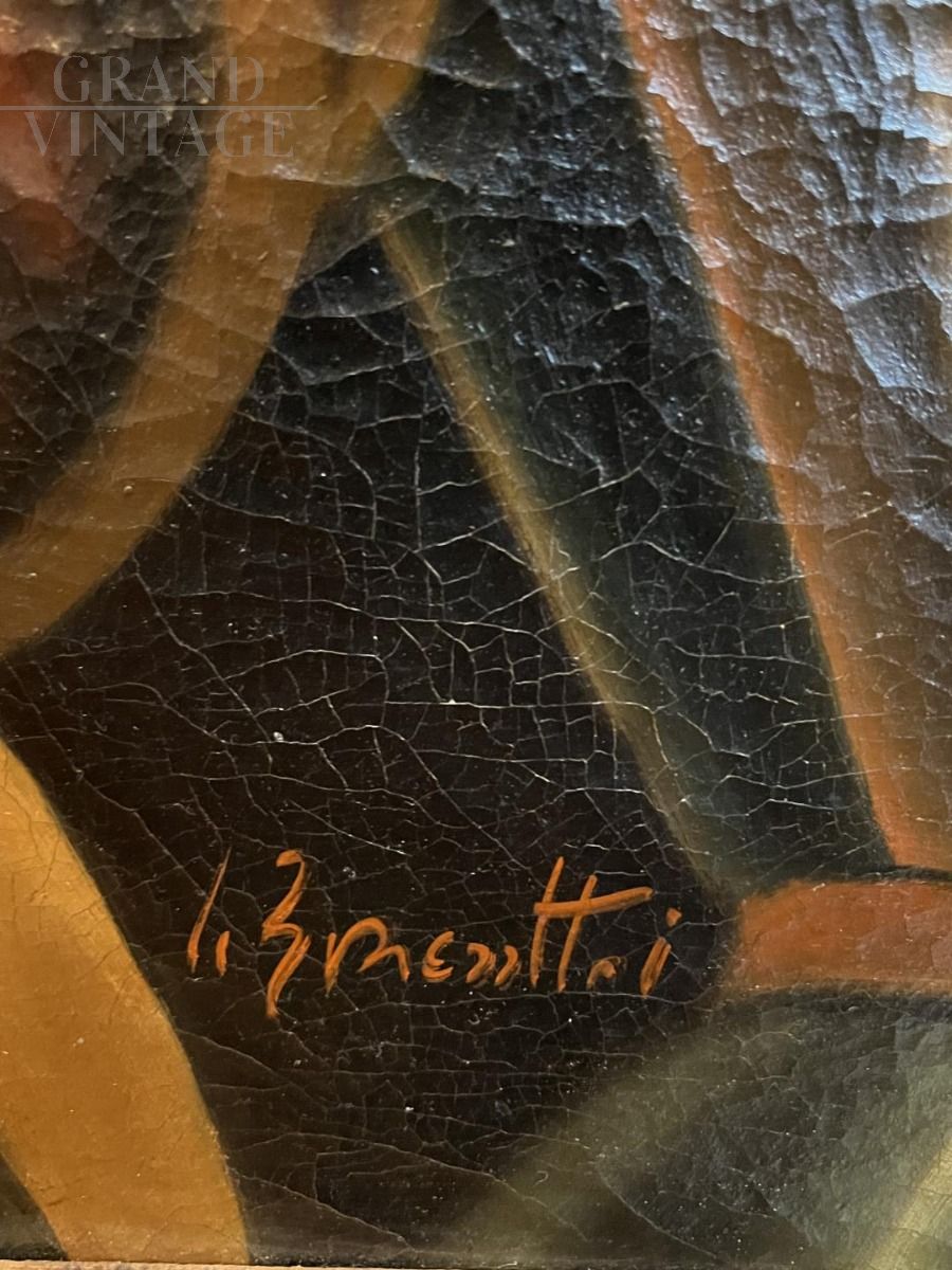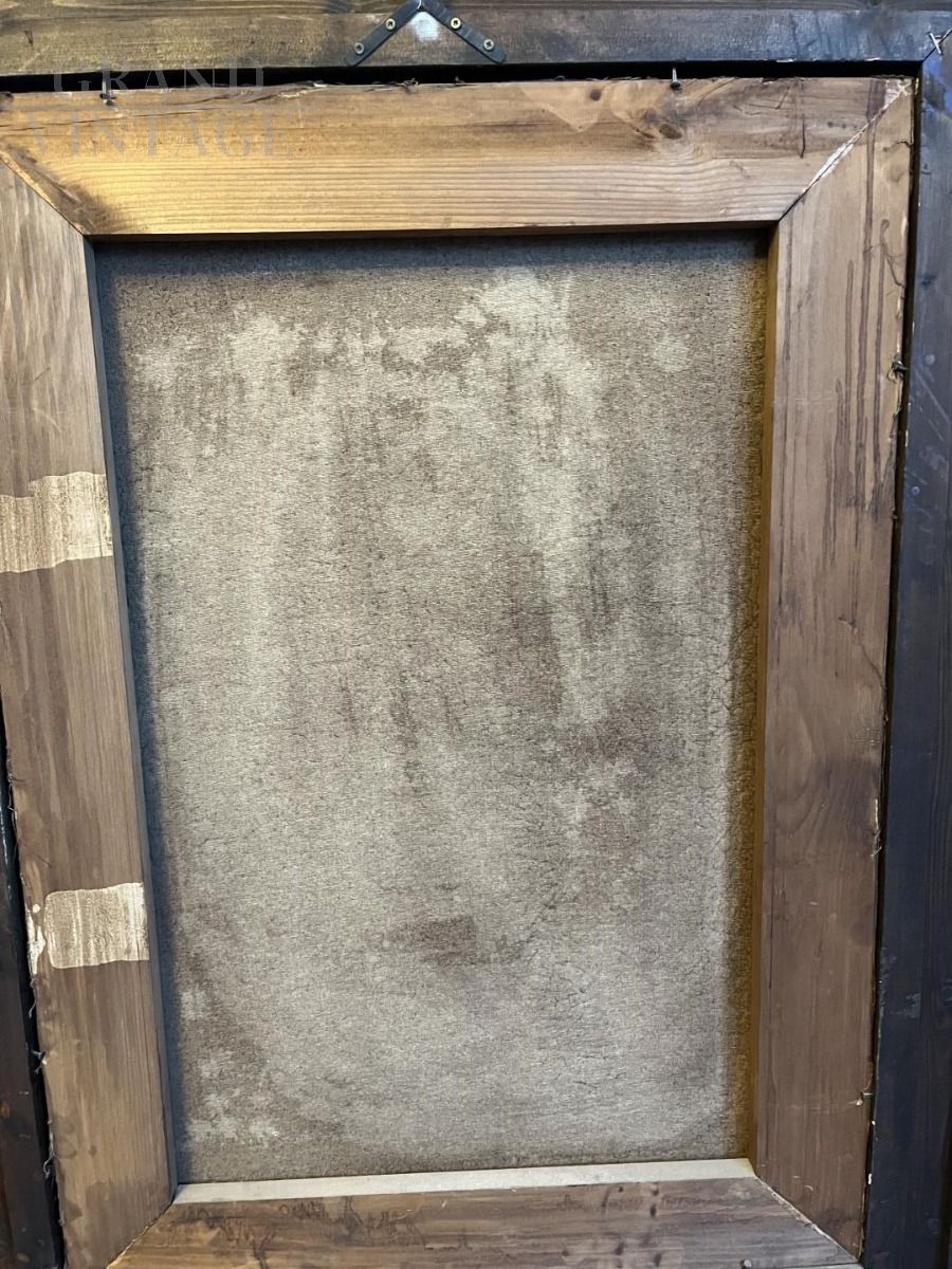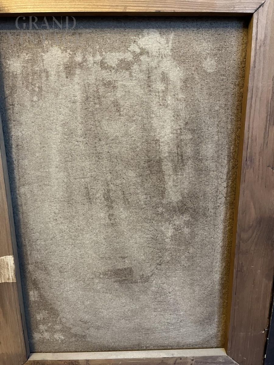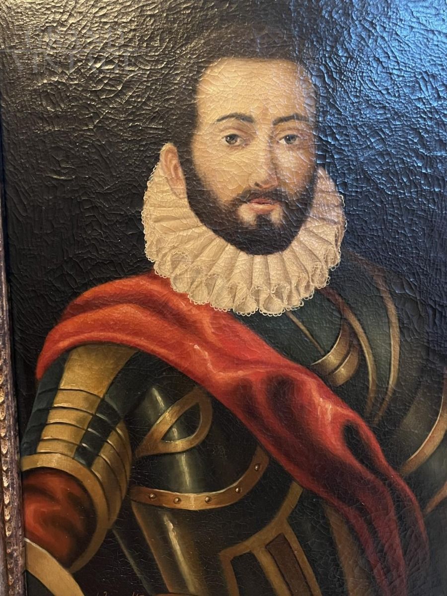 Important copy of the famous Portrait of Francesco Maria II della Rovere, Duke of Urbino, painted by Federico Barocci in 1572 and now preserved in the Uffizi in Florence. An oil on canvas that portrays the duke in his burnished armor topped by the ducal sash, the gorget worn around his neck according to Spanish fashion, his bearded and proud face, surrounded by a dark background. A canvas enclosed within a valuable golden carved wooden frame that recalls the motifs of the time. Painting signed by the author lower left.