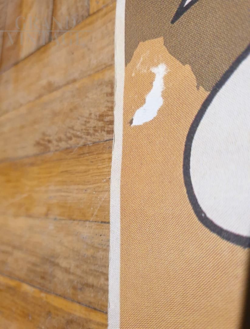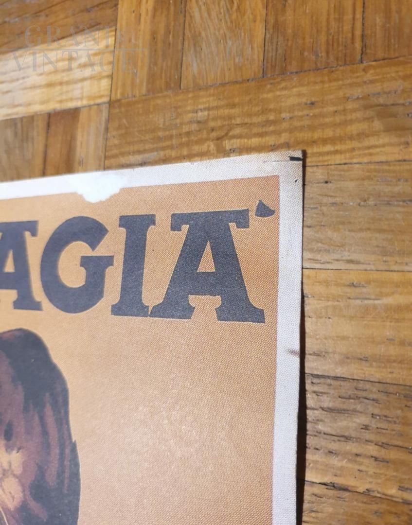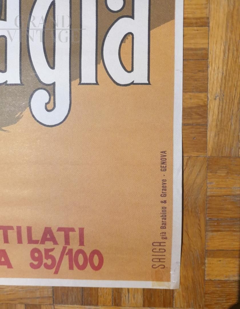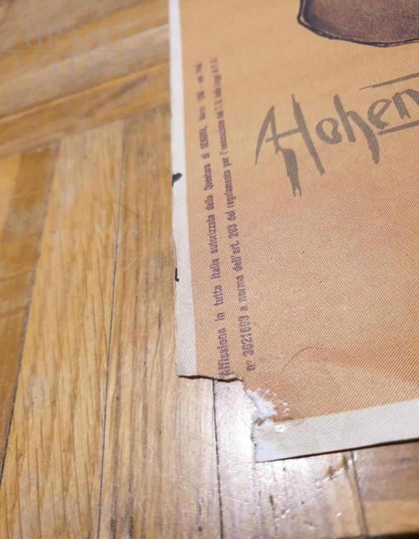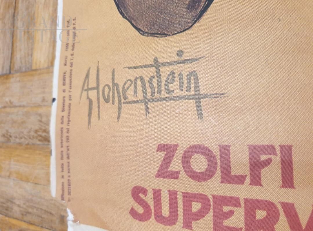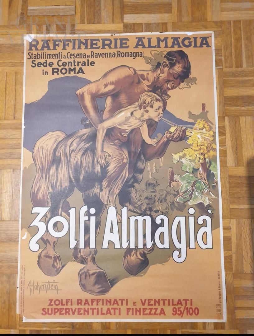 Famous and splendid illustration by the painter and poster artist Adolf Hohenstein, printed on stone by Saiga, Genoa in 1950. It measures 68 x 47 cm. It is an industrial advertisement for a sulphite refinery. It depicts a centaur holding a young faun while blowing sulfur dust over golden grapes, with a volcanic cliff in the background.