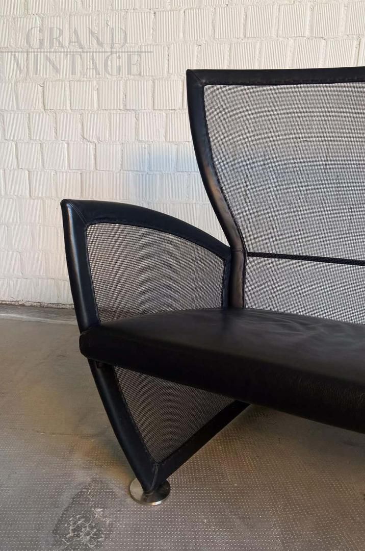 The Privé sofa by Paolo Nava for Arflex features a tubular aluminum mesh frame and black leather upholstery. Its captivating design fits well in modern or industrial settings. Paolo Nava is a design icon who has created and completed numerous projects for renowned national and international brands.