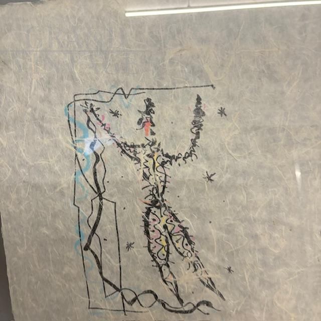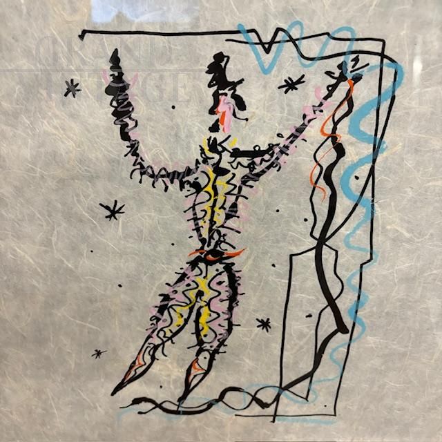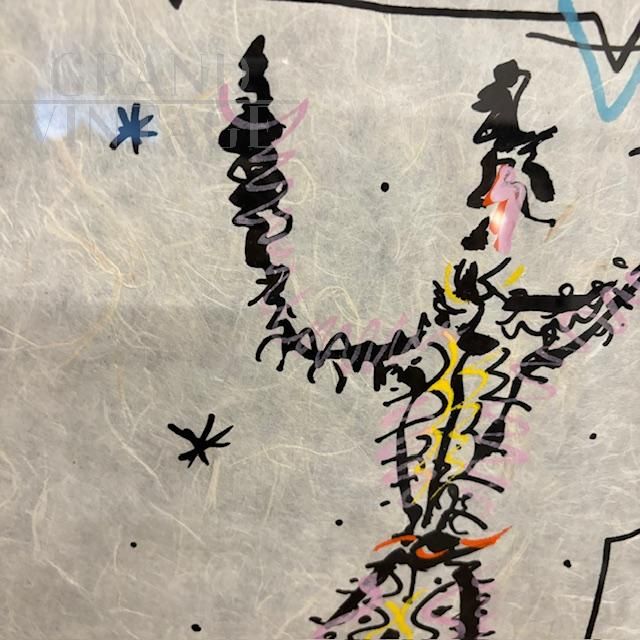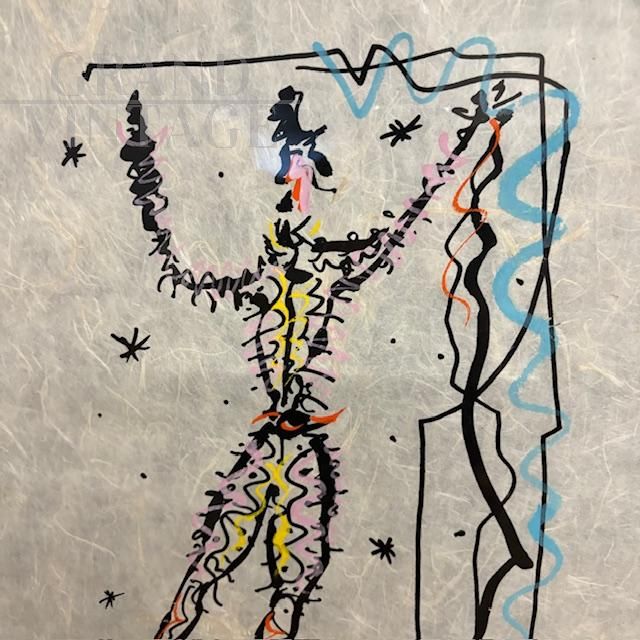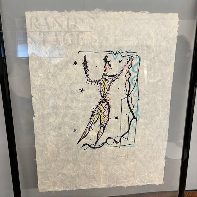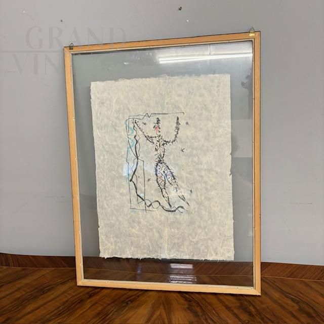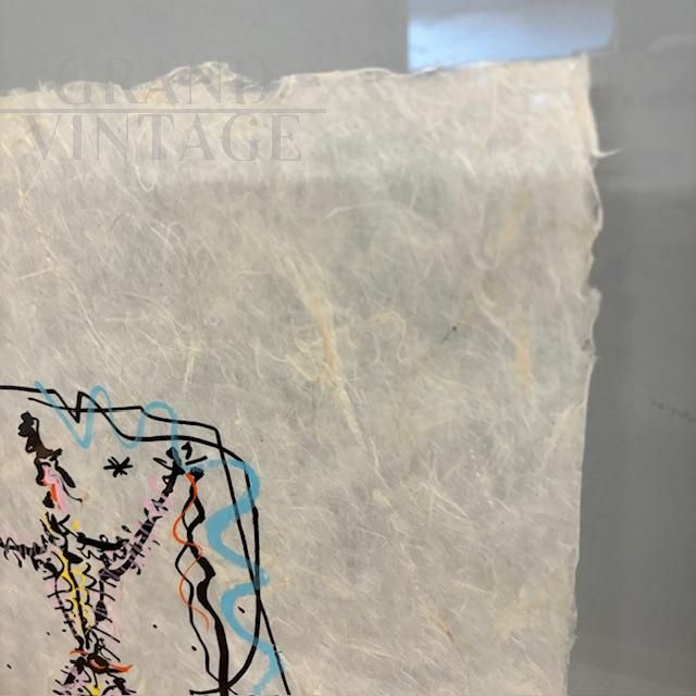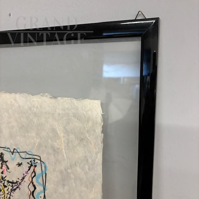 Exceptional mixed media painting on rice paper signed Rafael Alberti, depicting a carnival character, contemporary Italian art from the 1900s. The painting comes complete with protective glass and a black lacquered wooden frame. Thanks to the execution technique and the double-sided glass, the painting can be admired from both sides of the picture.