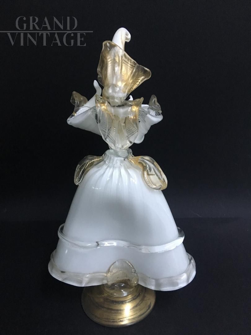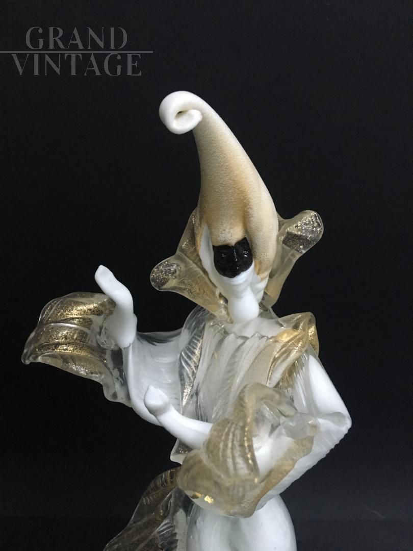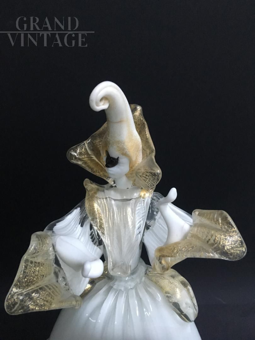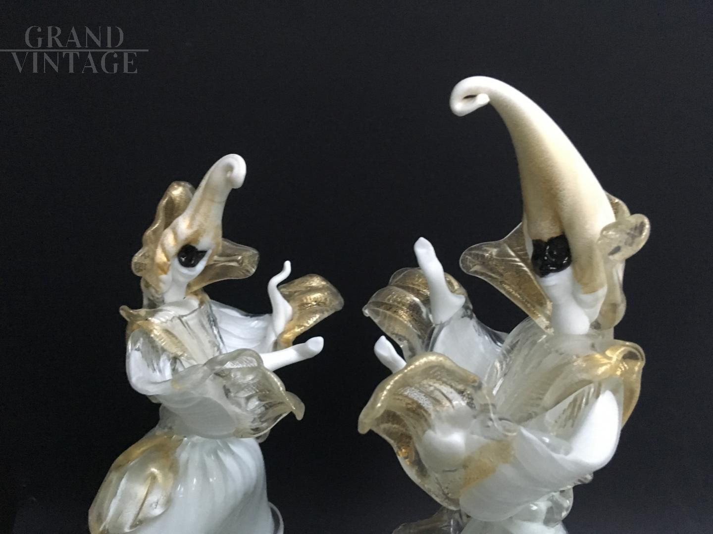 These 2 wonderful delicate and rare works of art symbolize a couple of masked dancers, male and female, dancing. Note the master's skills in composition, they are so dynamic that they seem alive and vibrant in their movements. Precious gold leaf has also been included in the processing. The statues are perfect, not cracked and not chipped. Rare piece, for real collectors of Murano glass art.
