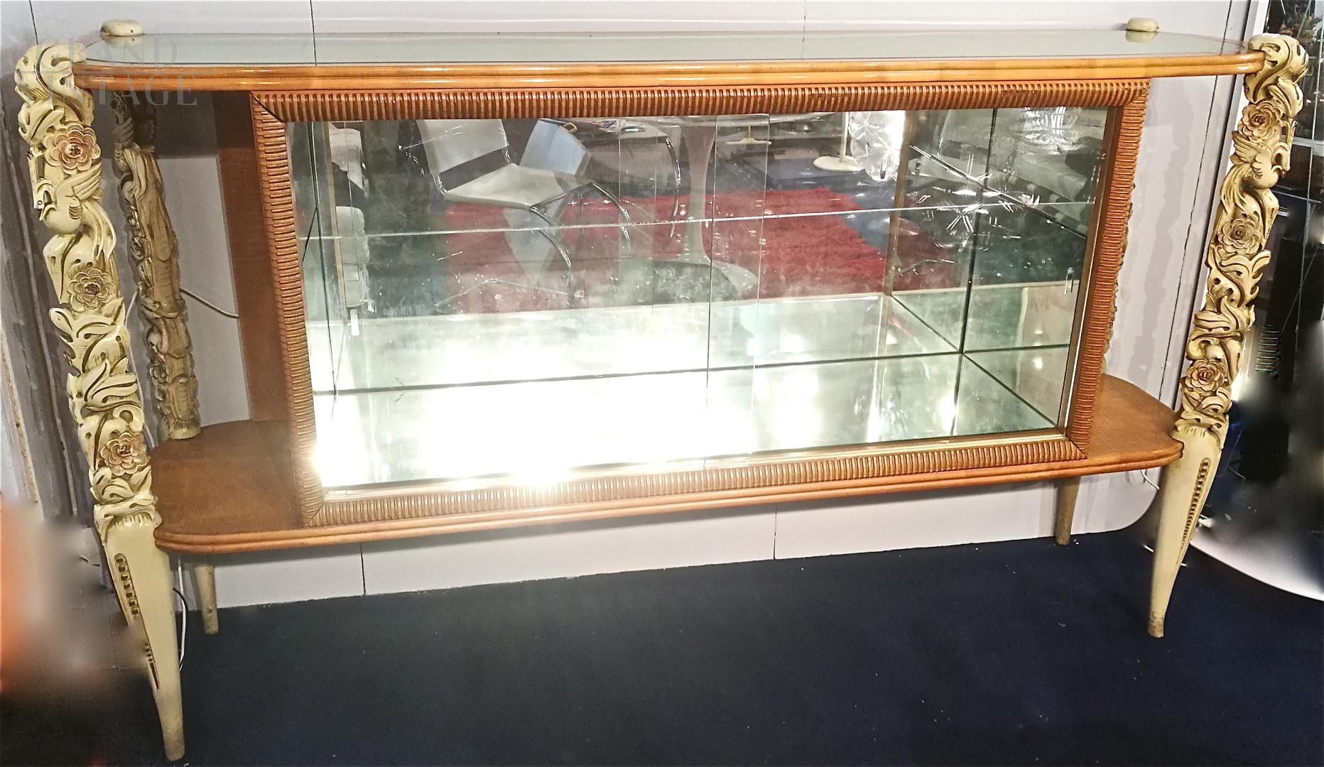 Rare showcase by La Permanente Mobili di Cantù ideal for displaying glass or porcelain collection, Como, Italian mid-century 40s / 50s, with glass doors, mirrored interiors and finely carved legs.