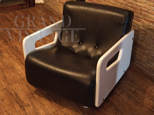Space Age 60s armchair of rare shape, with lacquered wood structure and black leather seat, in excellent condition, has some natural features of the time.