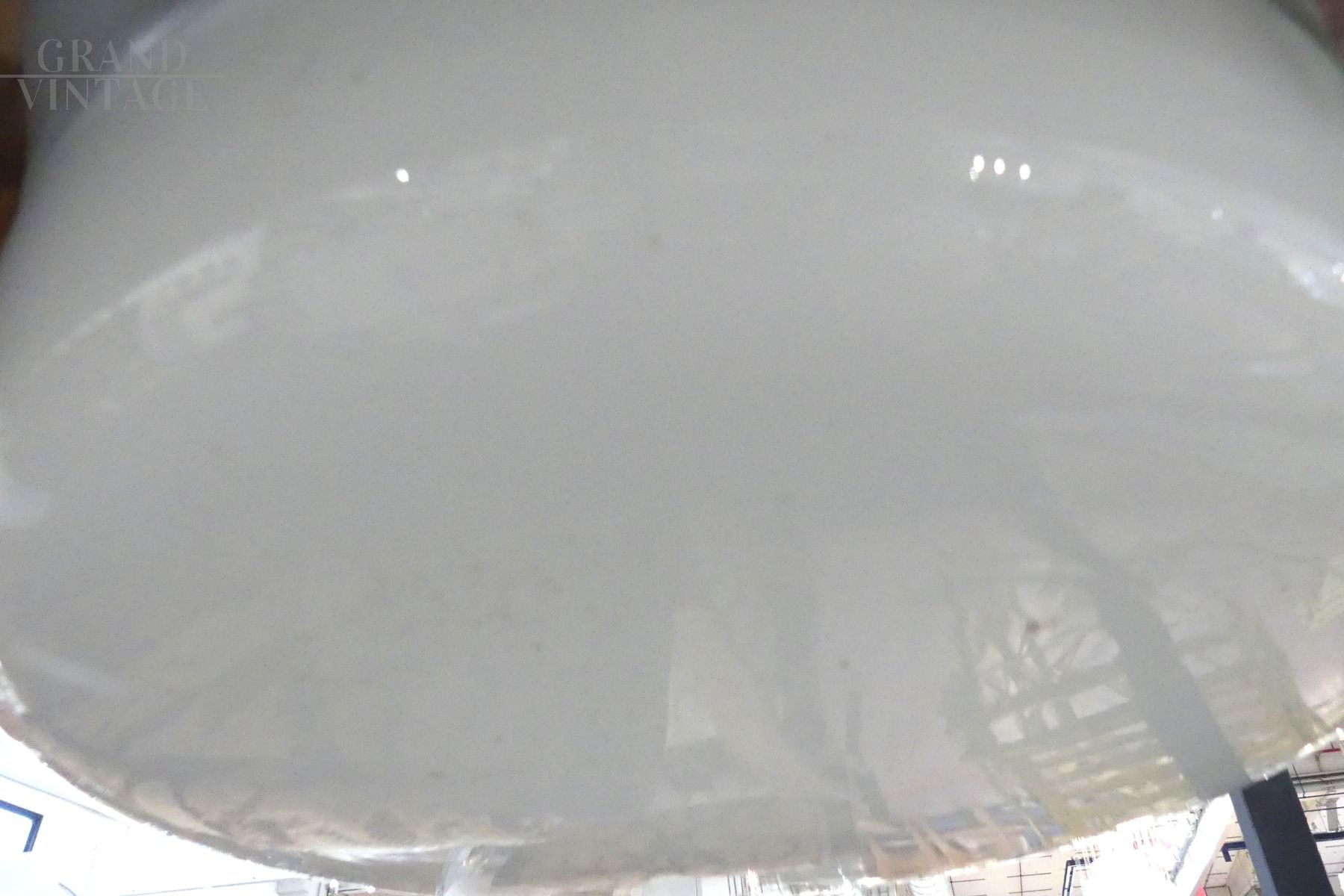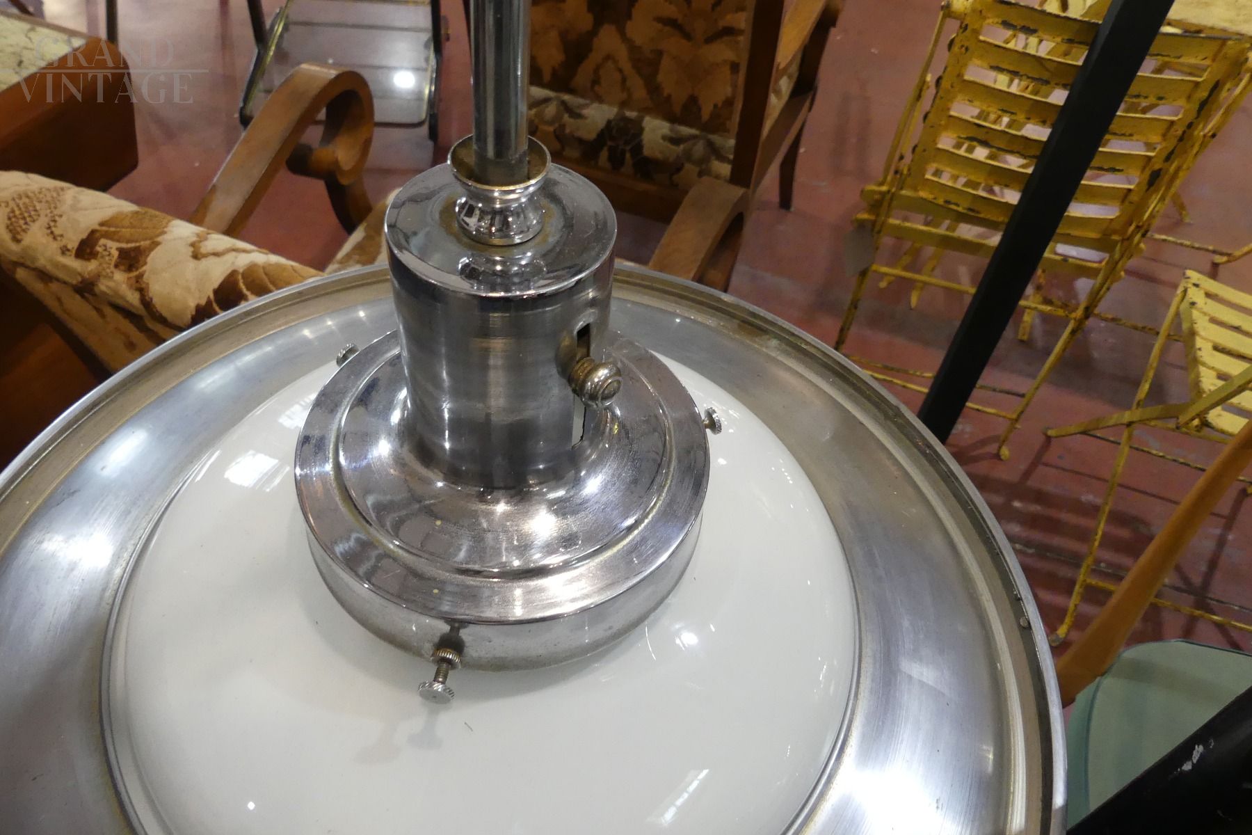 Large rationalist suspension lamp chandelier from the 1940s in chromed brass and white opaline glass, with one light point, working.