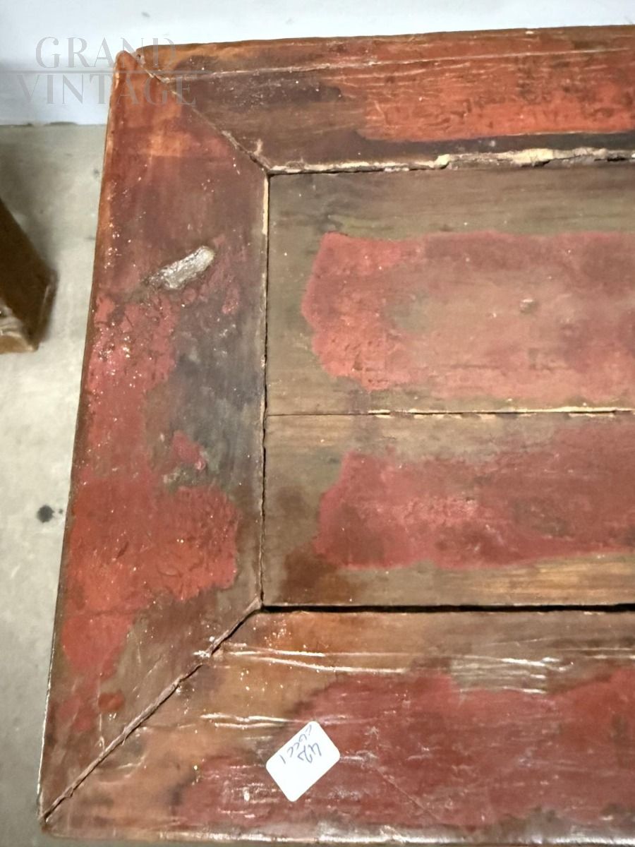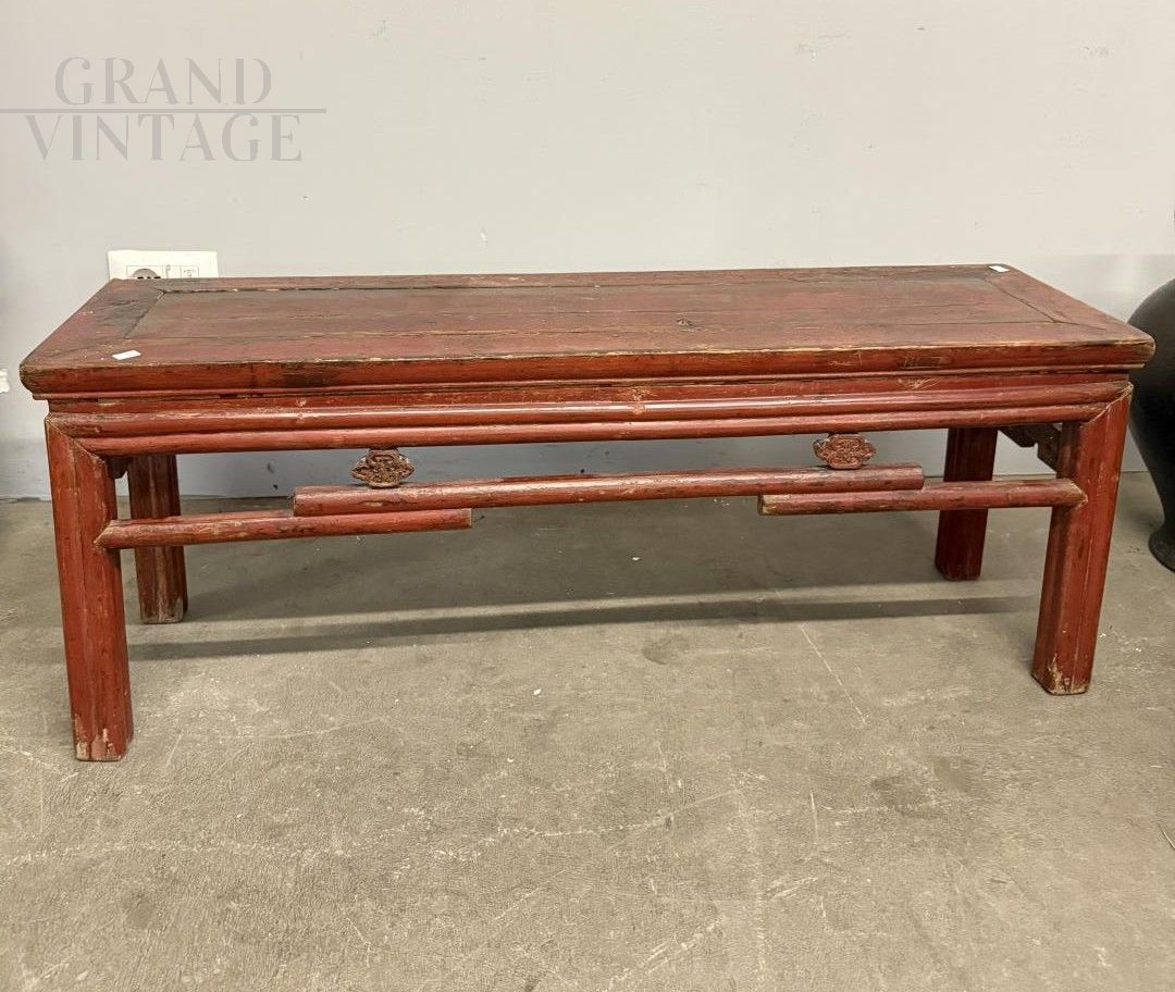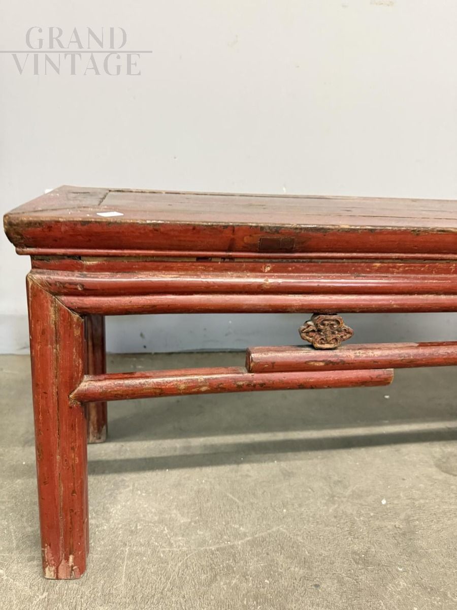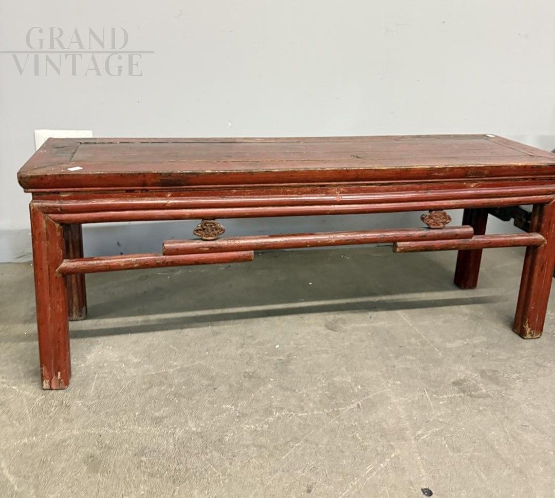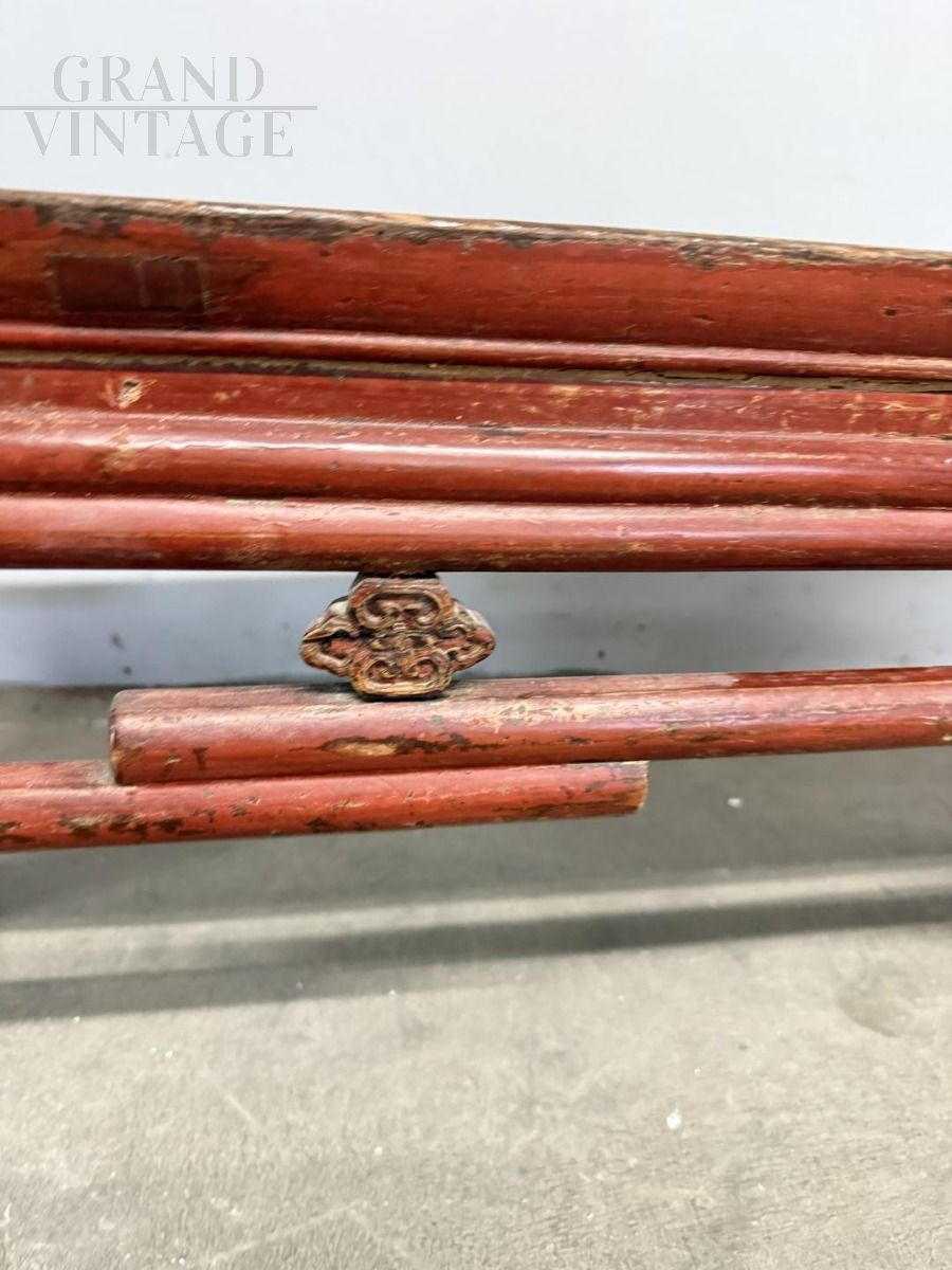 Early 20th-century Chinese bamboo-effect wood bench with red paint, showing natural signs of wear and tear, in very good condition.