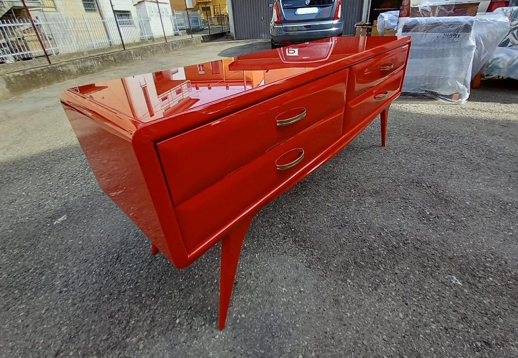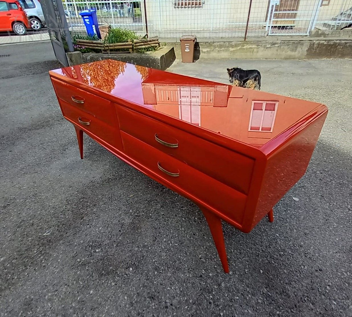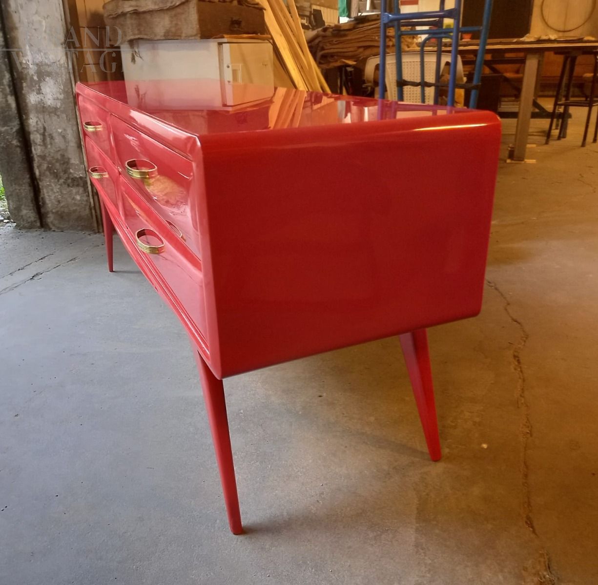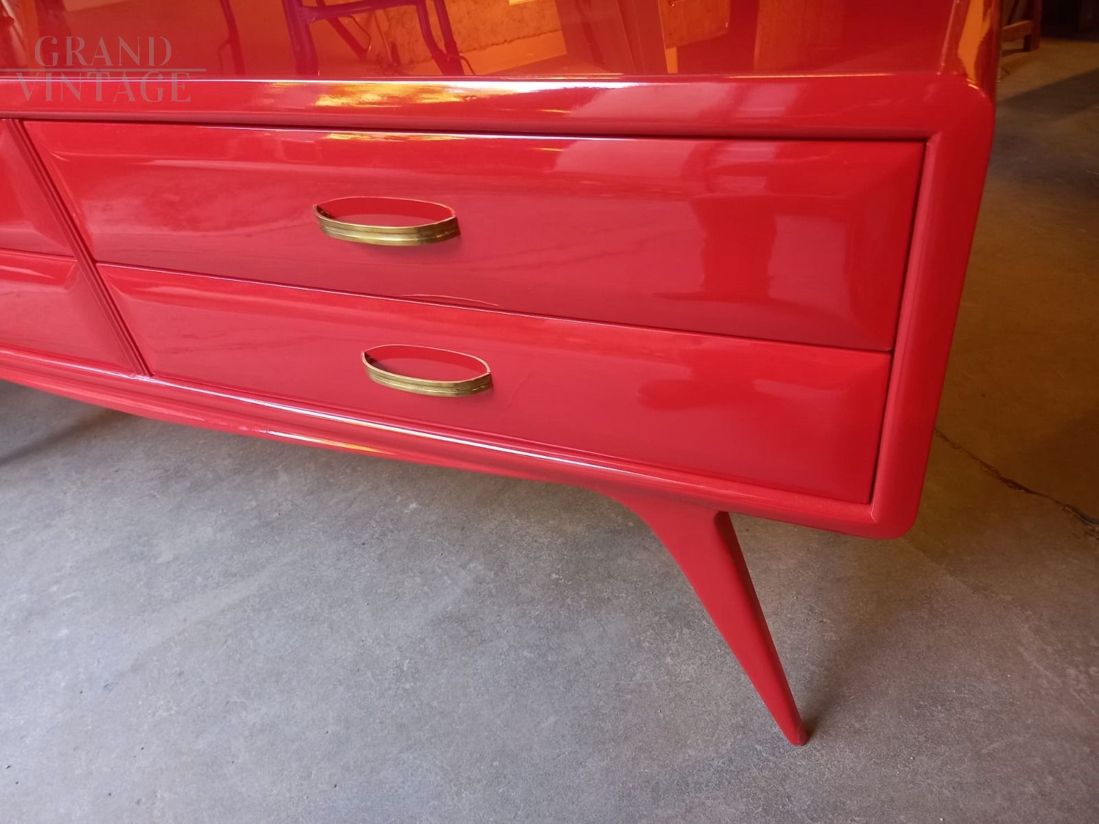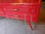 1950s mid century Italian vintage chest of drawers in Ico Parisi style, red lacquered, with red back lacquered glass top, original handles.