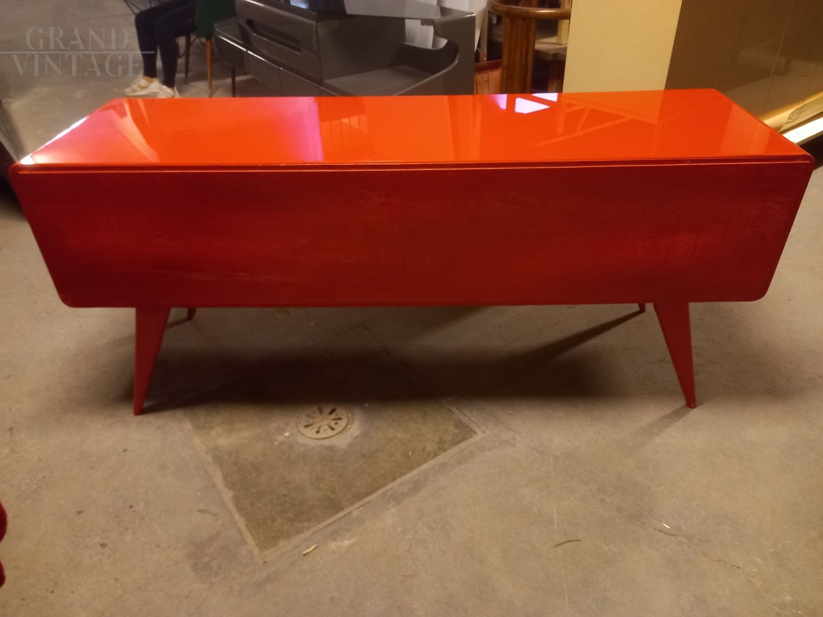 Red lacquered Ico Parisi style vintage chest of drawers with glass top
