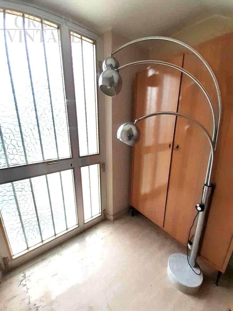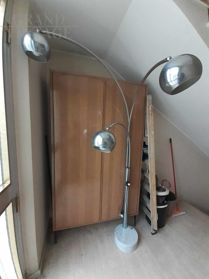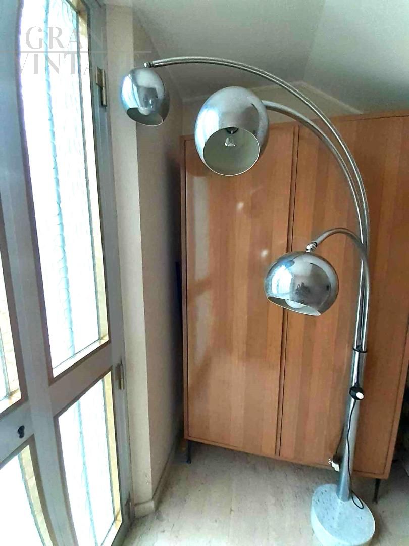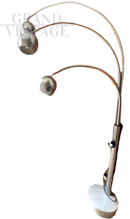 Beautiful arched Reggiani floor lamp from the early 1970s in chromed steel with marble base, it has always been part of the furnishings of a living room. The three arms move in all directions and the movement of the three lamps almost 360 degrees: up/down left/right. The lamp works perfectly, there are normal points of wear on the chromed steel due to the passage of time but which can be easily eliminated with suitable treatments.