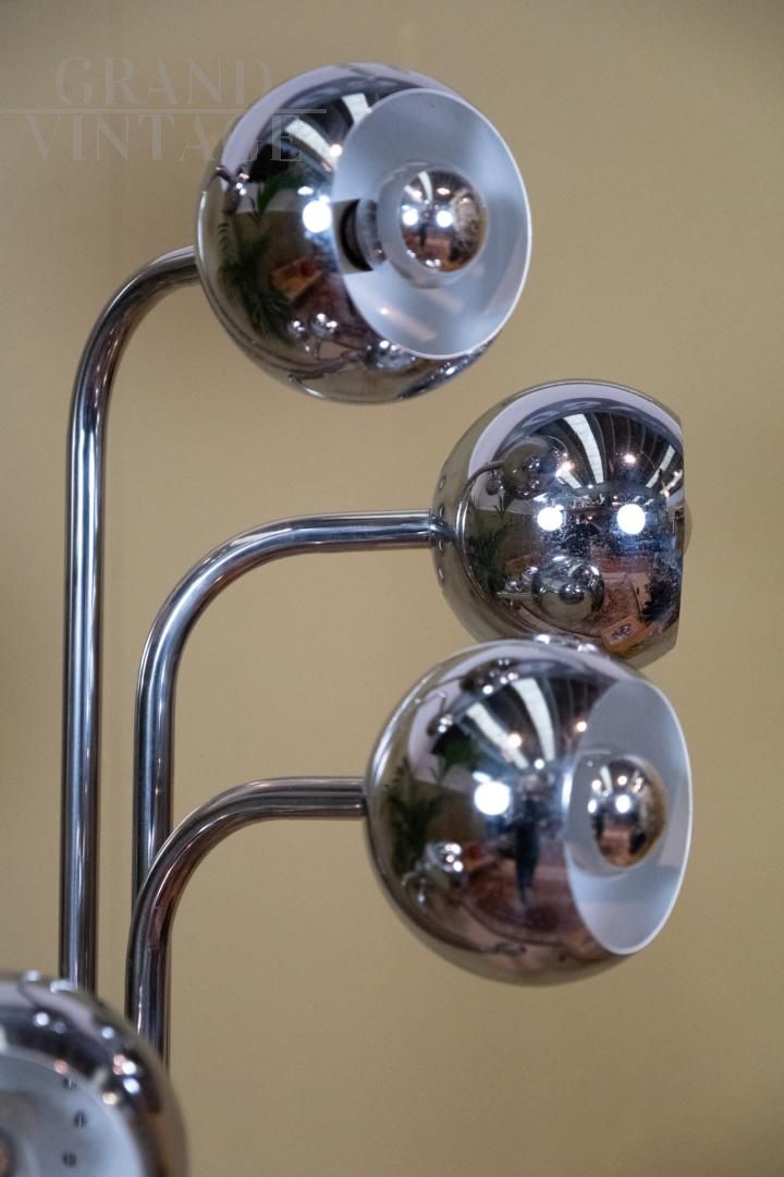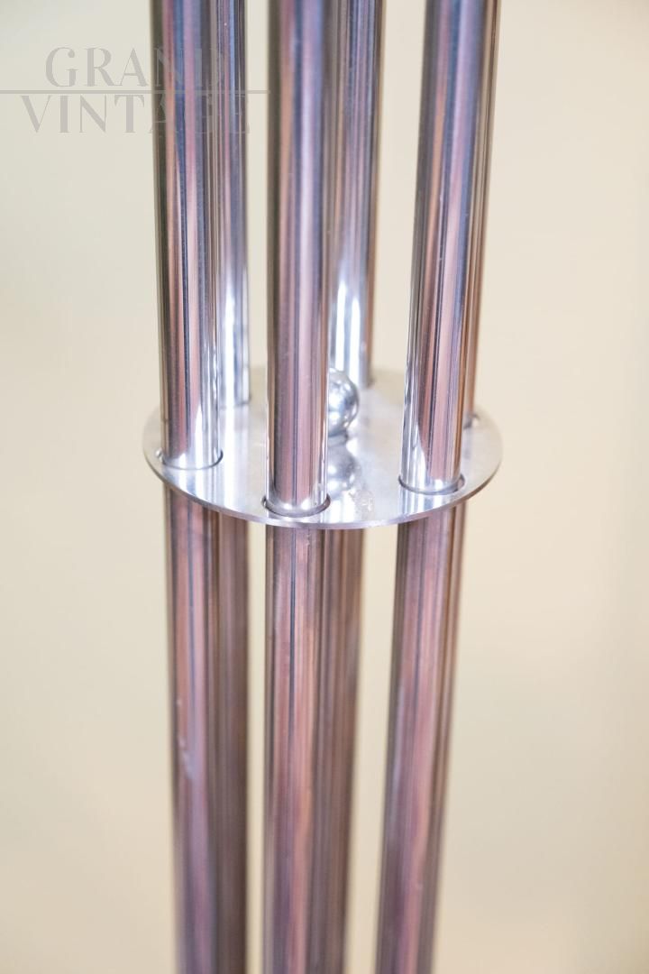 Floor lamp with six chrome lights in the style of Reggiani, with an iconic design and a strong stage presence. A furnishing element that recalls the modernist and glam style of the 70s, ideal for sophisticated settings, photo shoots, exclusive events or video productions with a retro and brilliant taste.