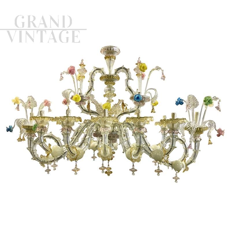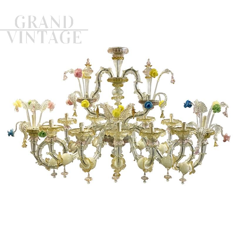 Large and sumptuous artistic Murano glass chandelier in the Rezzonico style, a beautiful boat model with elements in Murano glass blown and handcrafted with ancient technique. On each chromed metal arm are inserted, piece by piece, the glass called "bossole" made in "rigadin" (longitudinal or spiral striations) that make up the chandelier. This model is characterized by fine Gold Crystal decorations and embellished with refined details of golden leaves, cups and curls and multicolored flowers. The chandelier is made up of 12 light points that support E14 type bulbs, and is compatible with LED bulbs.