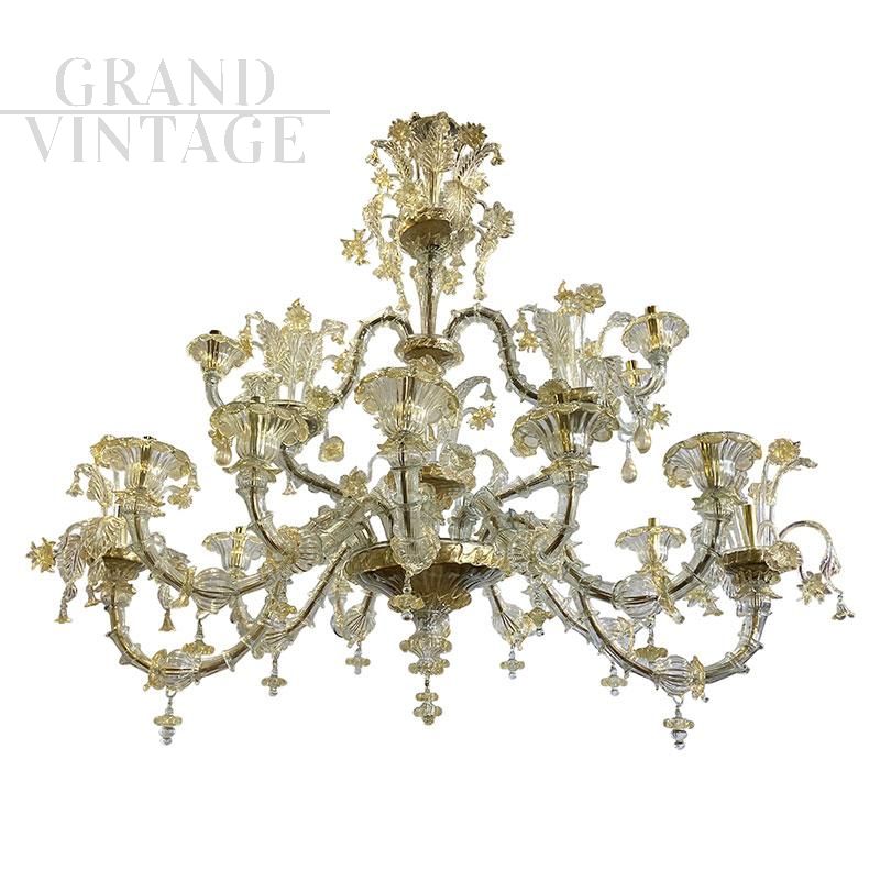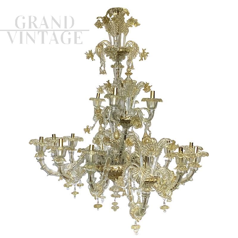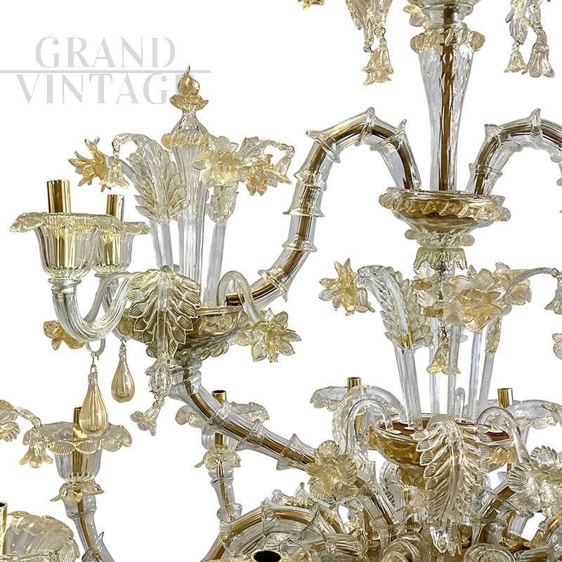 Large and sumptuous artistic Murano glass chandelier in the Rezzonico style in Murano glass blown and handcrafted with an ancient technique, very bright thanks to its 16 light points, Italy 1930s - 1940s. On each golden metal arm are inserted, piece by piece, the glass called "bossole" made in "rigadin" (longitudinal or spiral striations) that make up the chandelier. It stands out for its fine Gold Crystal decoration and the precious details of flowers and leaves hand-finished by Murano glass masters. The chandelier in question, completely restored and rewired, presents a system composed of 16 lights organized on two orders (12 lower, 4 upper divided on two castles) suitable for containing bulbs with E14 socket.