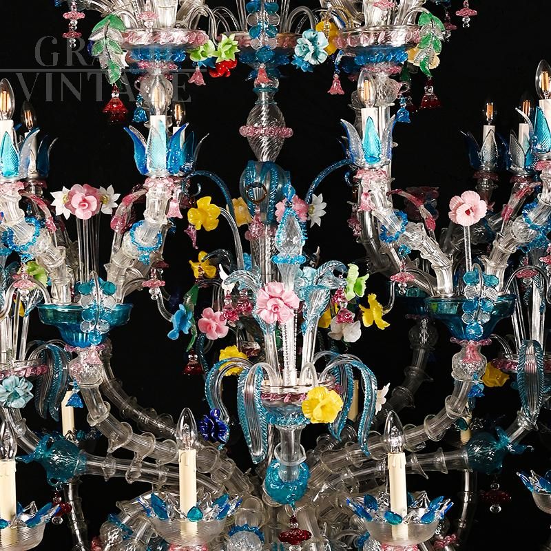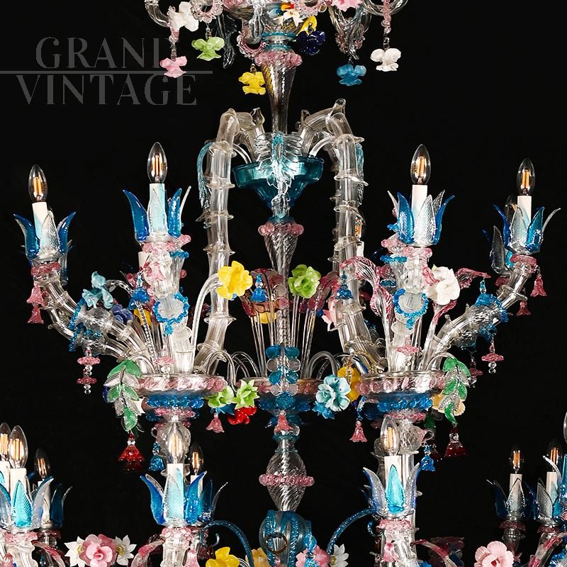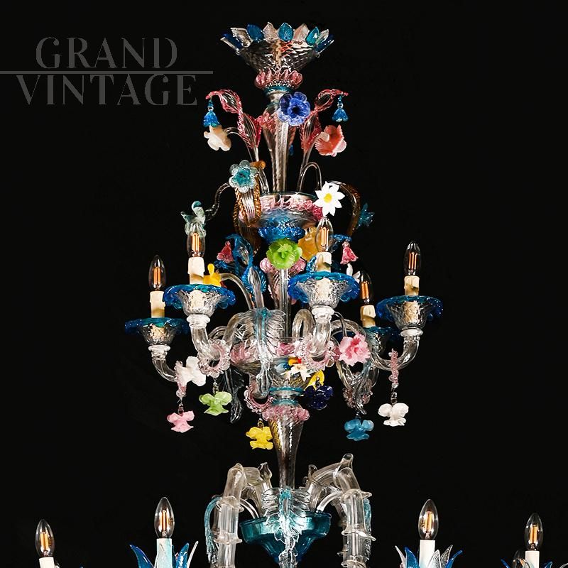 Large and sumptuous artistic Murano glass chandelier in the Rezzonico style from the first half of the 20th century (1930s-40s) with elements in Murano glass blown and handcrafted using an ancient technique. It stands out for its fine multicolored crystal decoration and the precious details of flowers and leaves hand-finished by Murano glass masters.
