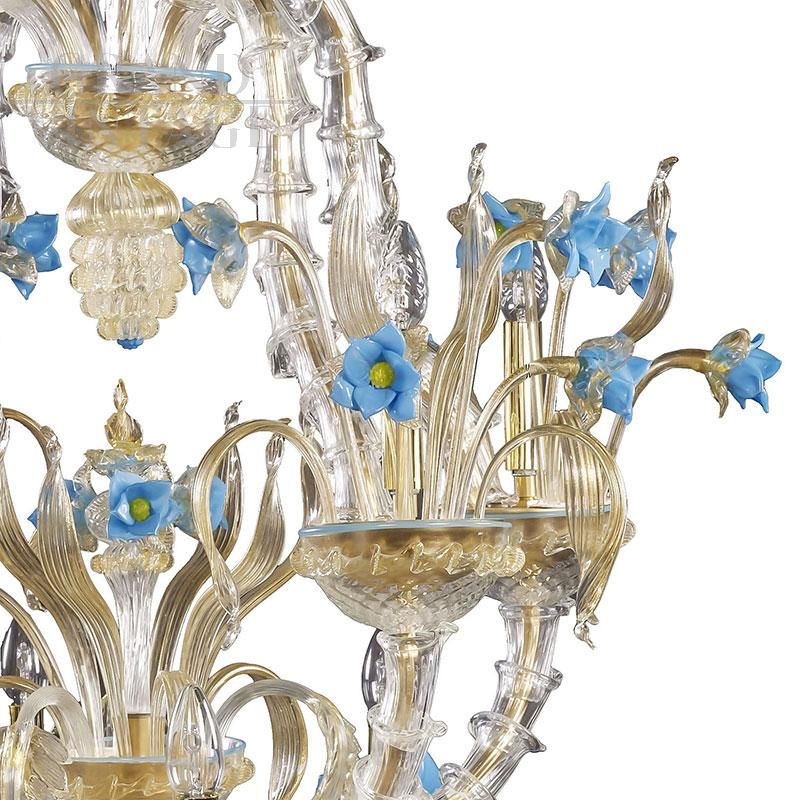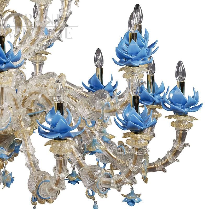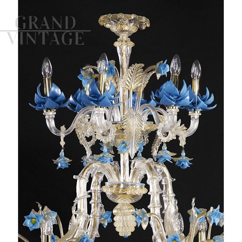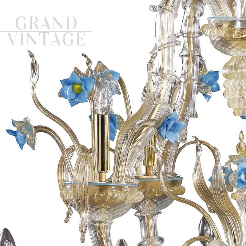 Rezzonico style chandelier in Murano glass with light blue flowers