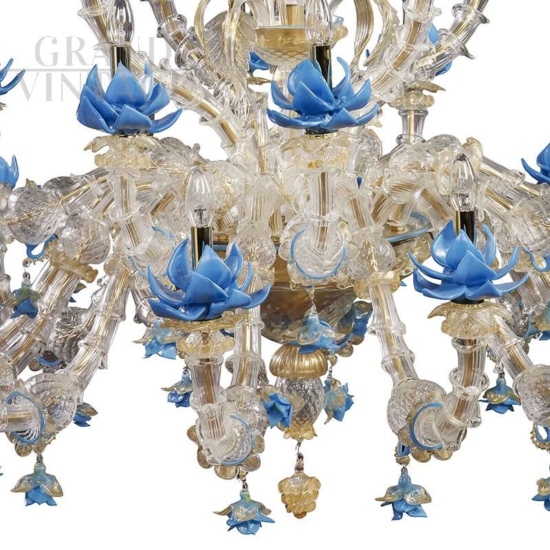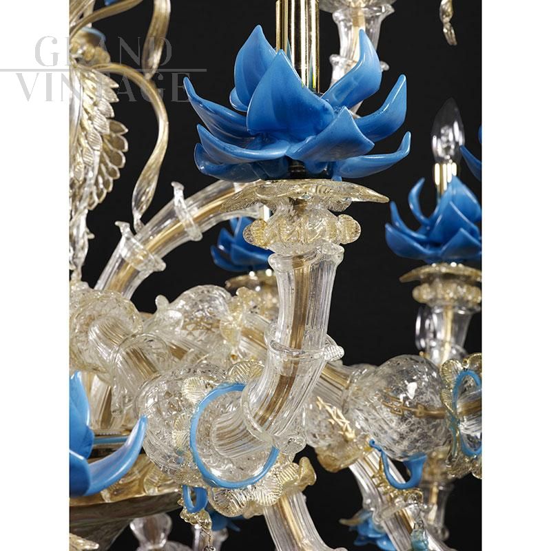 Chandelier in transparent, white and gold Murano glass, forged with ancient lace workmanship and gold details with beautiful blue flowers. System with 30 lights organized in three orders.