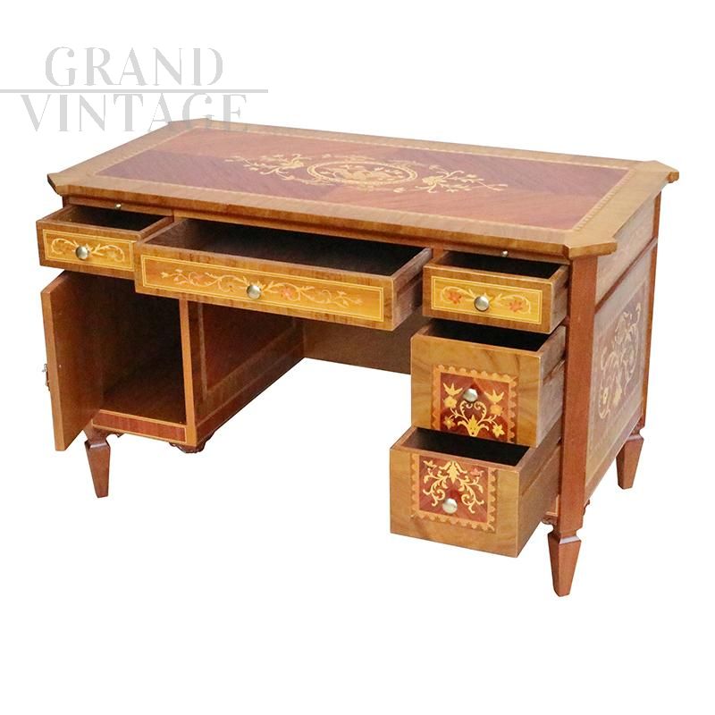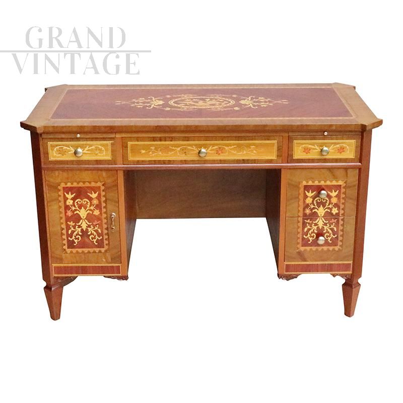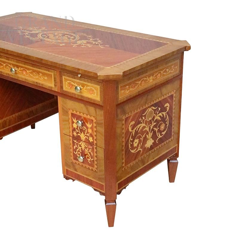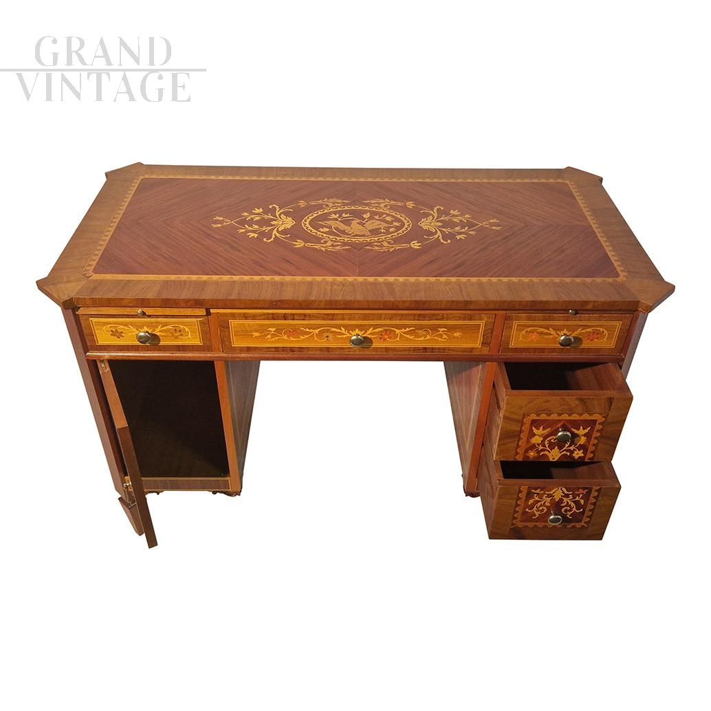 Lombard center desk in antique style, rich in inlays on the entire surface in different types of wood, equipped with 5 convenient drawers of various sizes and a closed compartment with a door (left side).