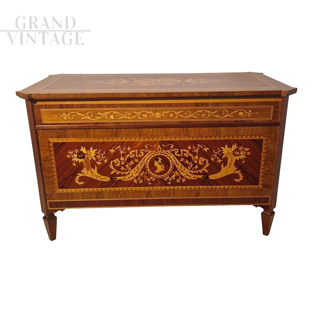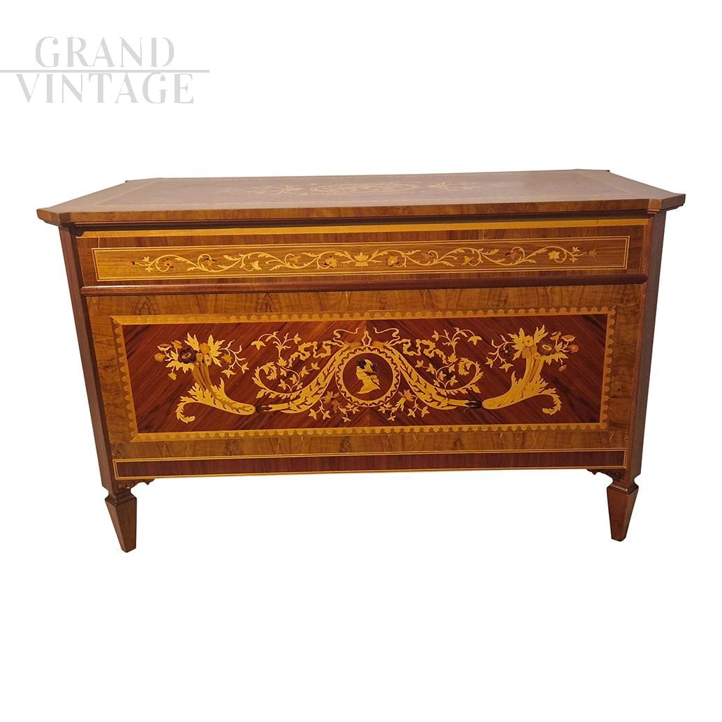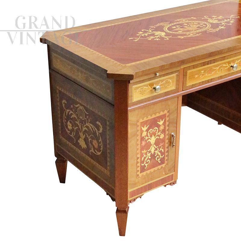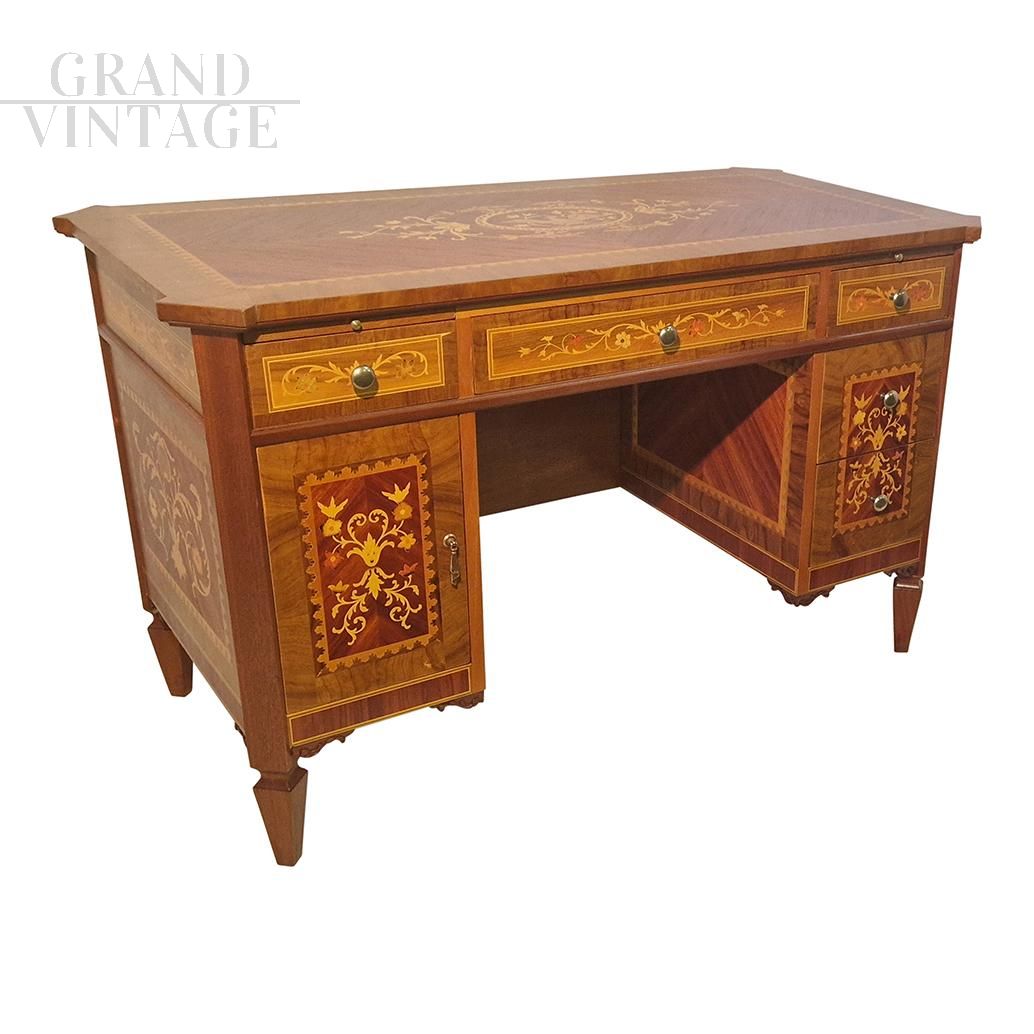 Lombard center desk in antique style, rich in inlays on the entire surface in different types of wood, equipped with 5 convenient drawers of various sizes and a closed compartment with a door (left side).
