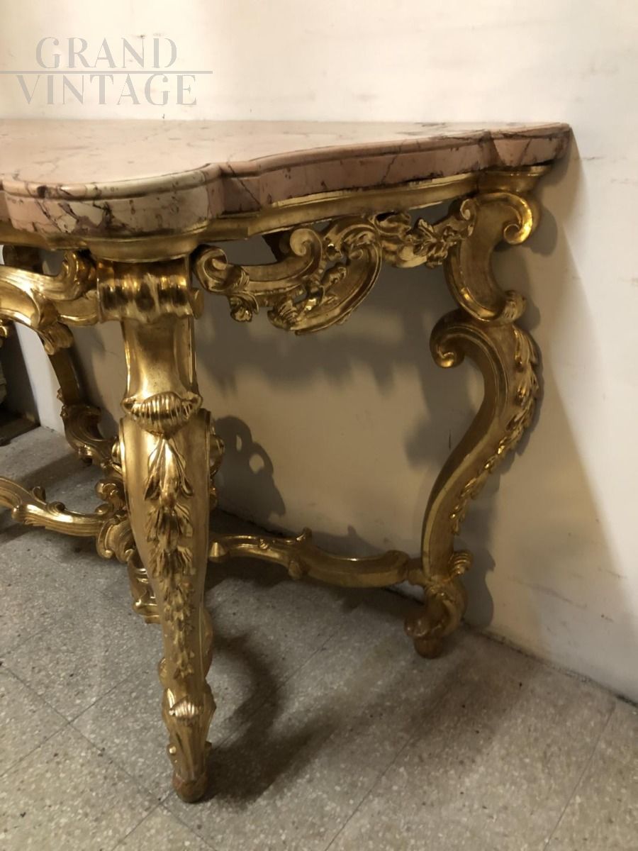 Antique Roman console from the Louis XV era from the 18th century in carved and gilded wood, with a 5 cm thick antique pink marble top.