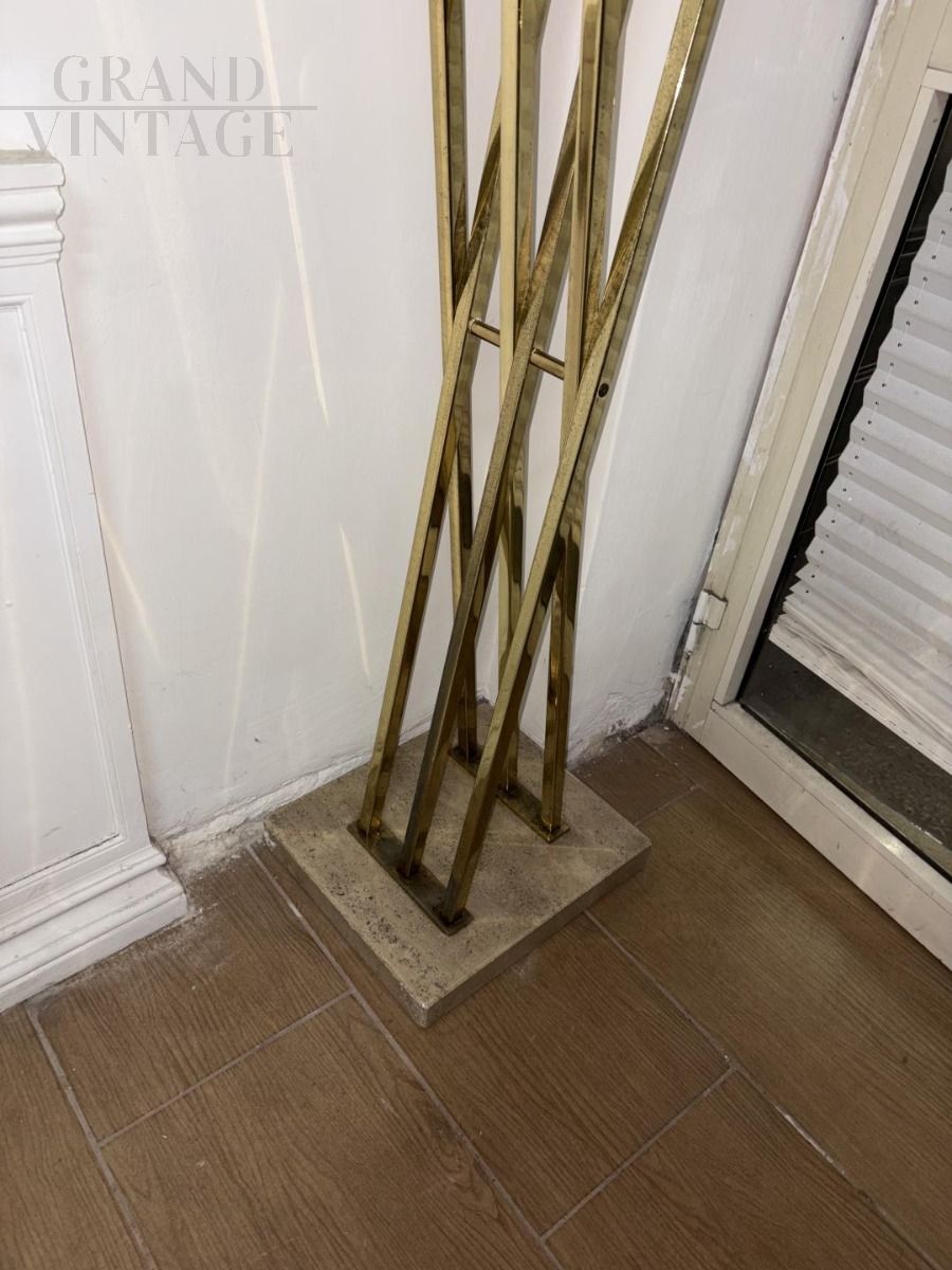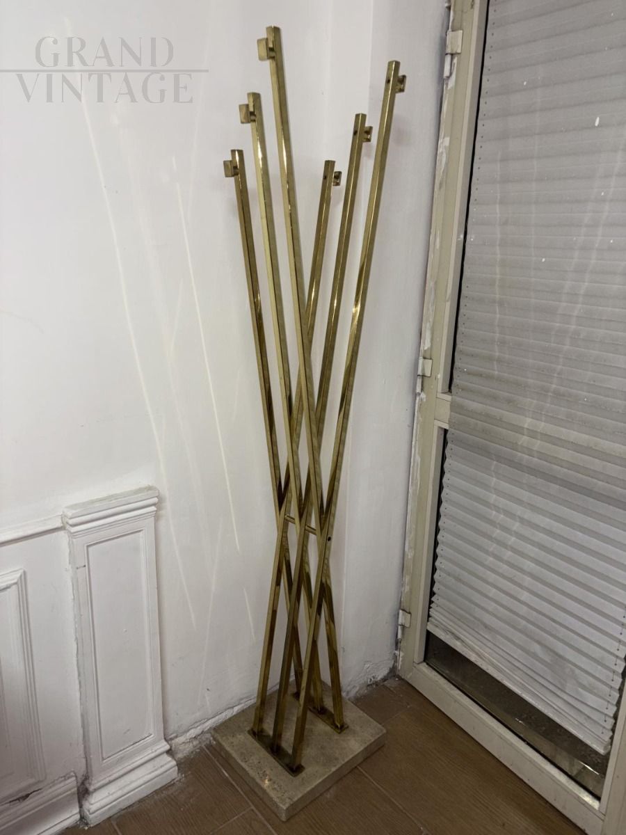 Mid-century design coat stand by Romeo Rega in splendid gilded brass with travertine marble base.