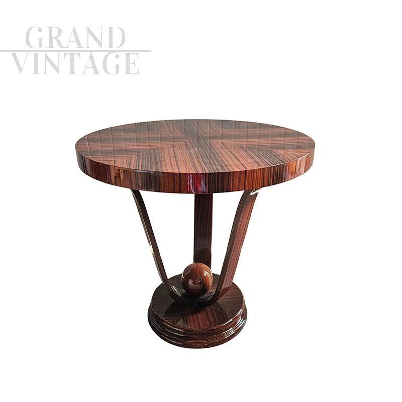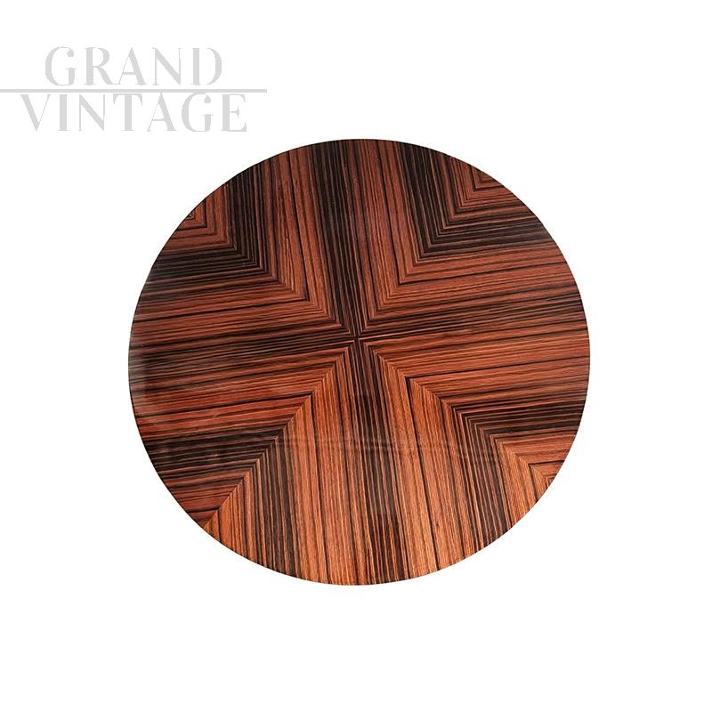 Tavolino da caffè rotondo in stile Art Déco realizzato in vari legni pregiati con geometrie sul piano, posto su quattro gambe curve con una sfera al centro, anni '80-'90.