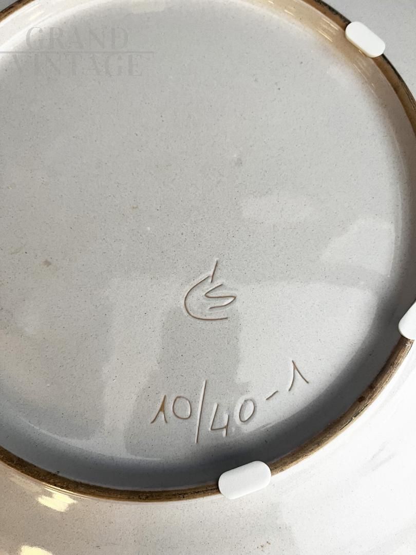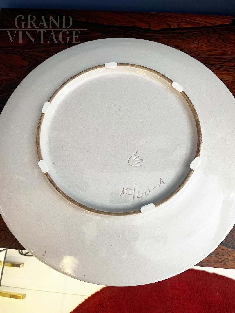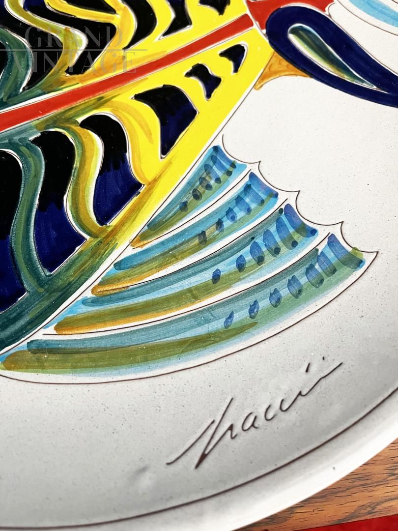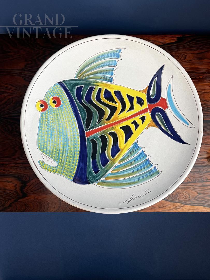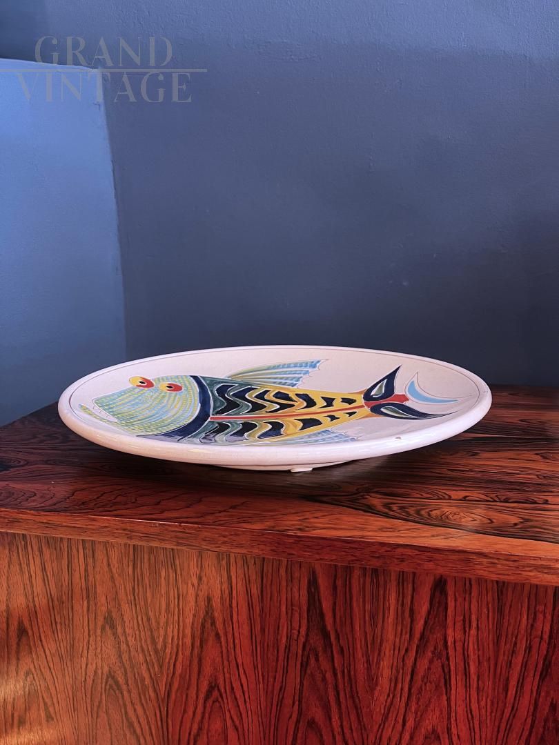Vintage hand-painted ceramic centerpiece or wall plate depicting a colorful fish, 1990s. A beautiful decorative piece, perfect for a beach house, complete with signature, unfortunately illegible.