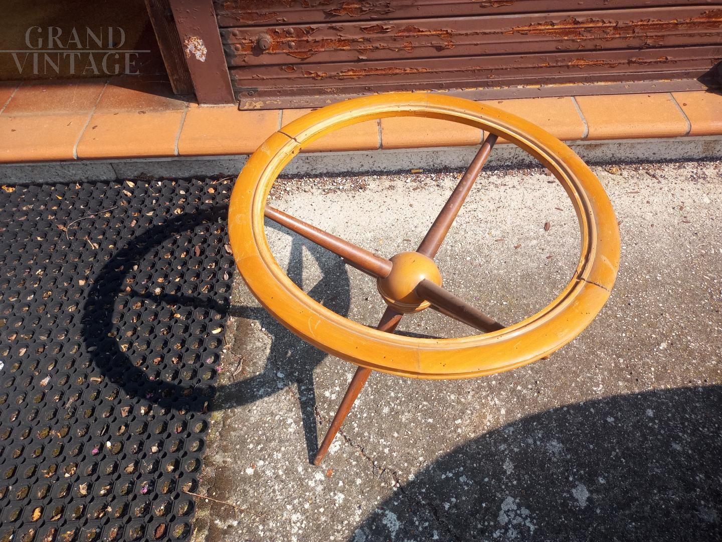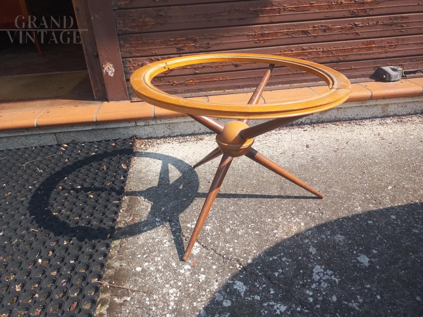 Vintage Ico Parisi style coffee table made of light wood with round glass top, the legs meet in the center collected by a beautiful wooden sphere, Italian mid-century modern design.