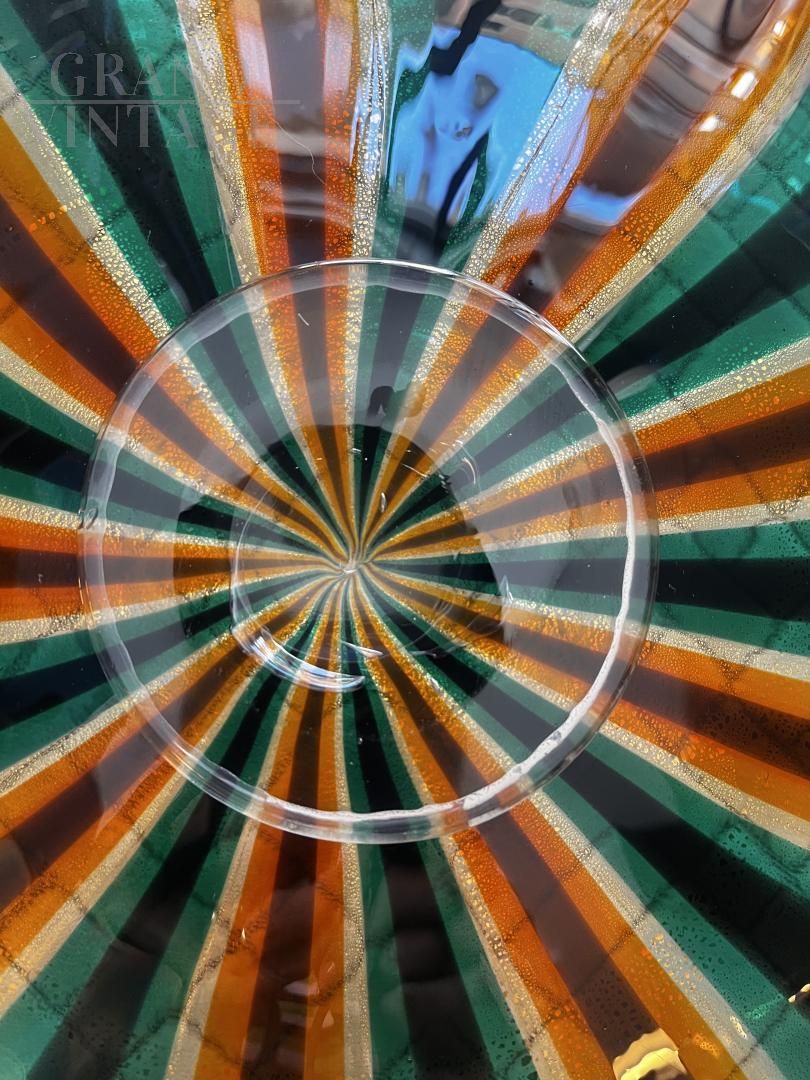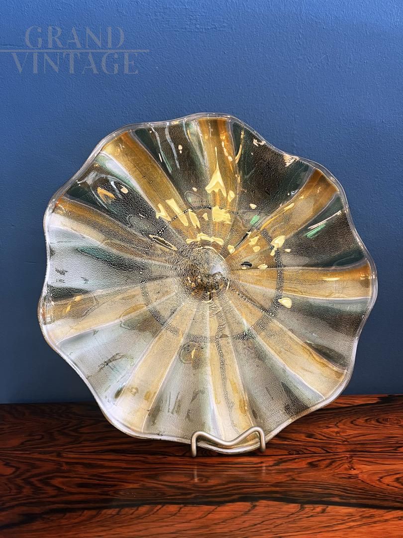 Round Murano glass centerpiece plate with gold dust. In excellent condition, with no flaws. The gold accents create a beautiful color effect. The front and back have different effects, see photo. Stand not included.