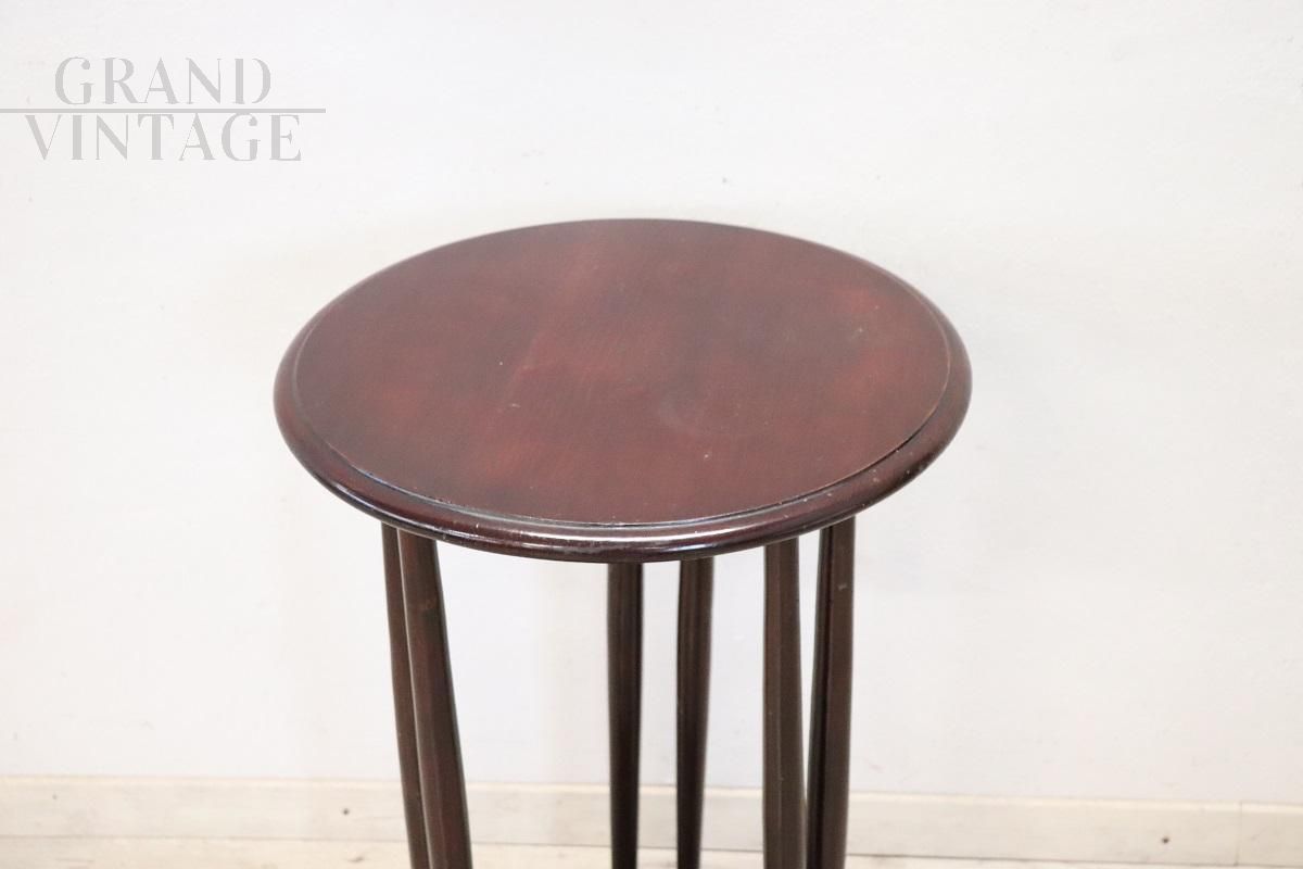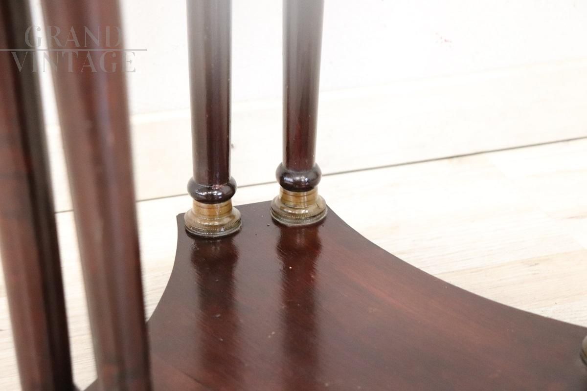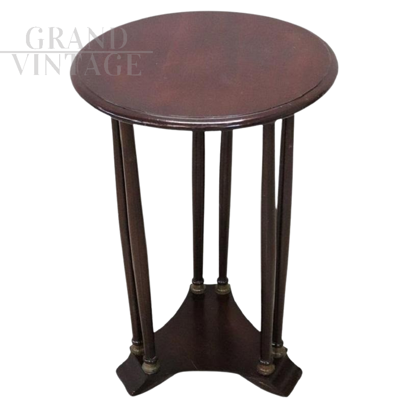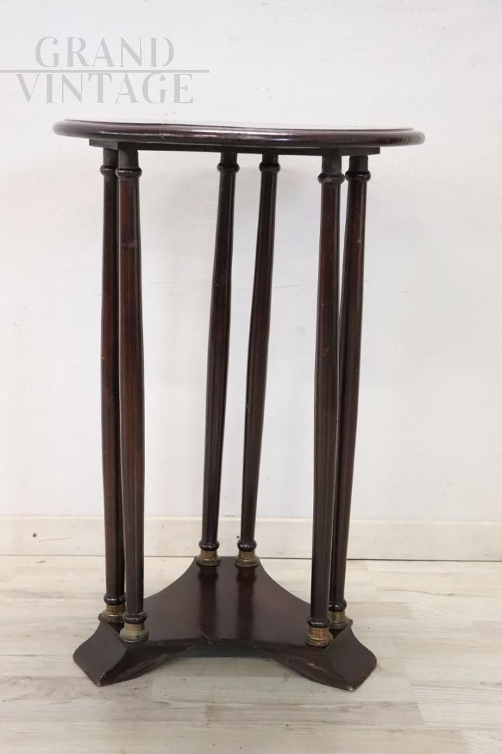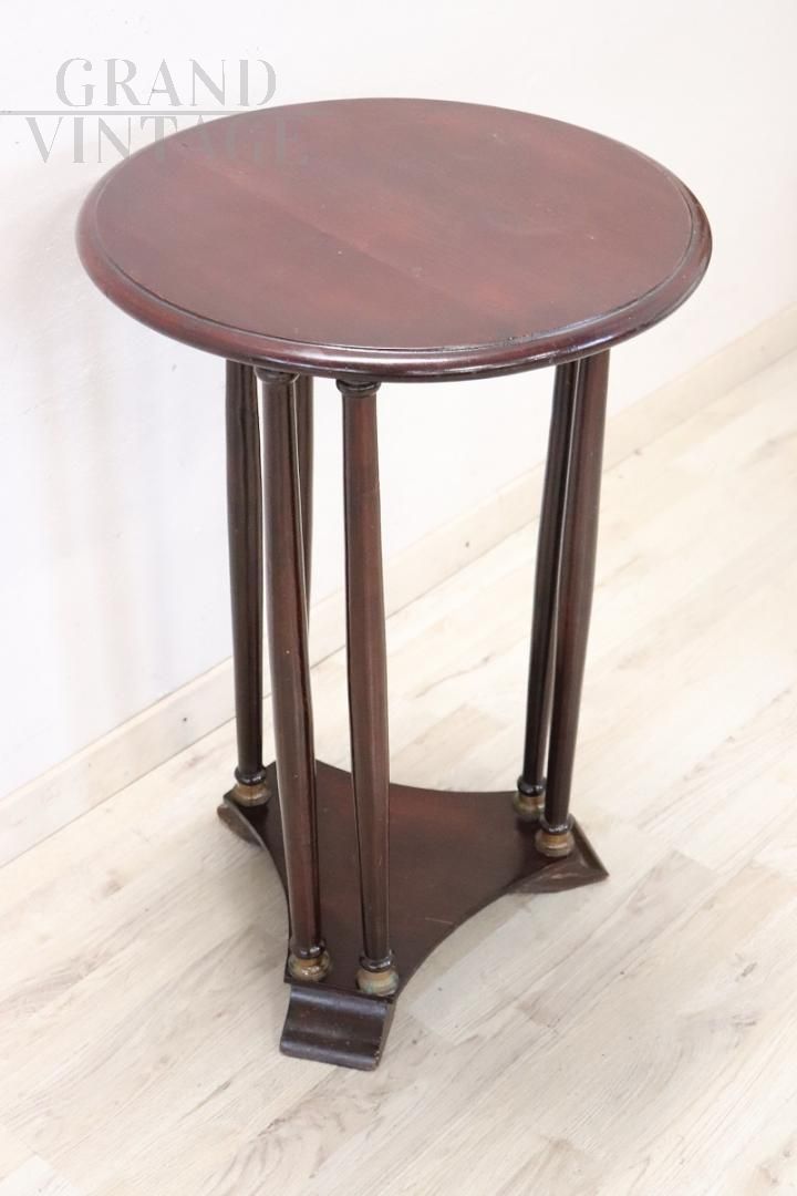 Gueridon round side table in antique Empire style made of beech wood, dating back to the second half of the 20th century. The top is supported by three pairs of refined columns. In the lower part the columns end with a delightful bronze decoration. Perfect for supporting a vase or a light decorative object. In good condition, it shows natural signs of aging, as shown in the photos. Price negotiable.