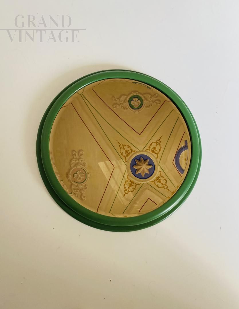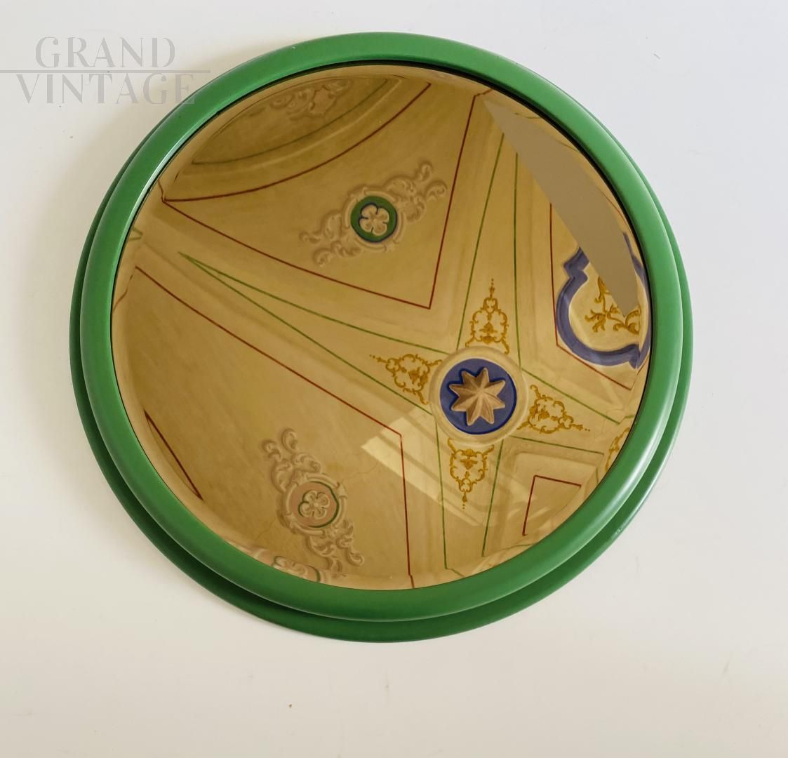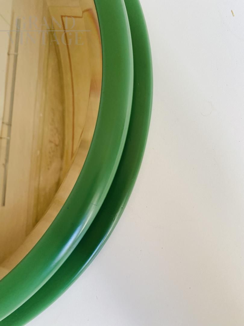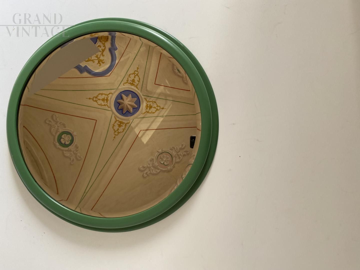 Round vintage mirror with sturdy and elegant solid green lacquered wooden frame, beveled and intact glass. In excellent condition.