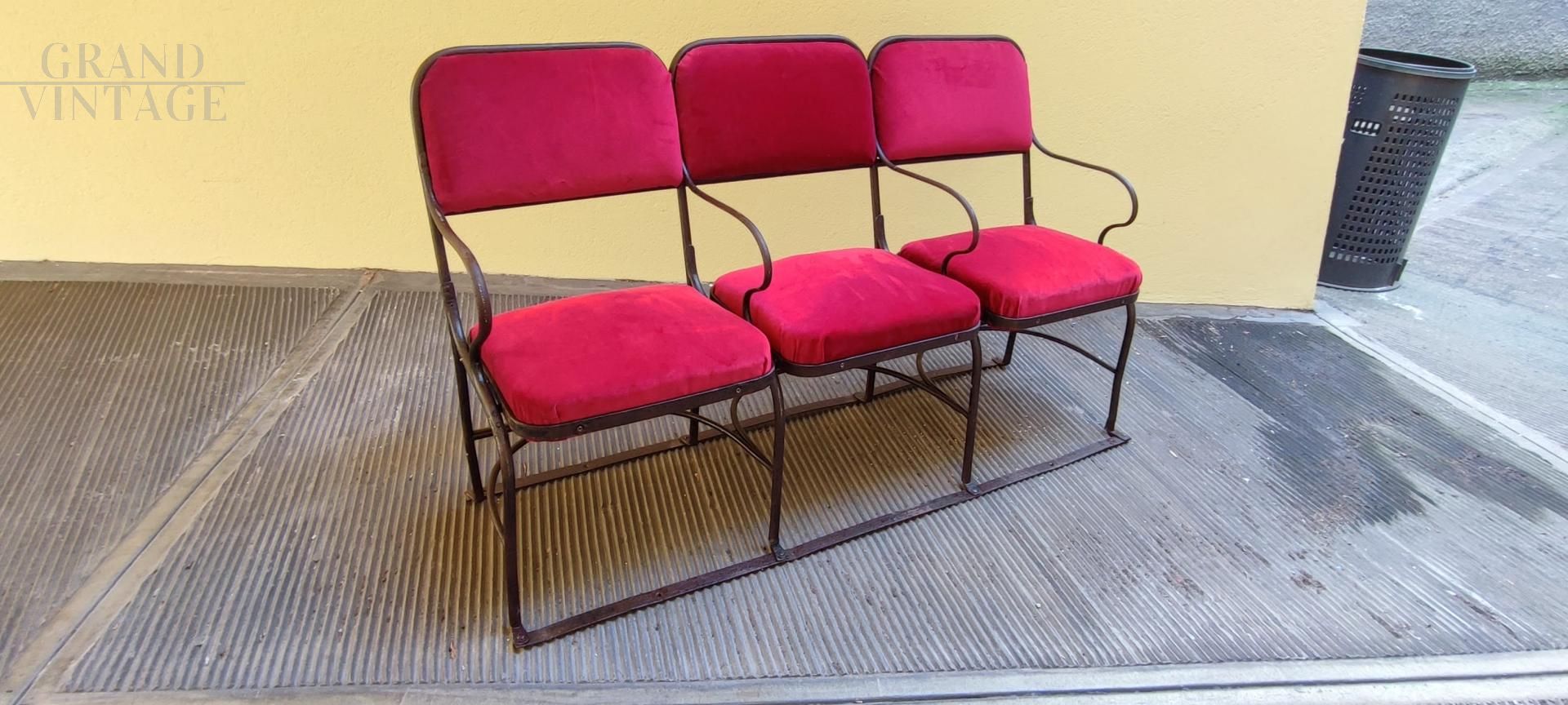 Row of 3 red velvet Italian theater chairs from the 1930s