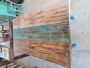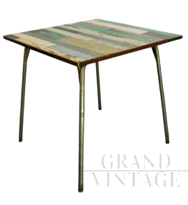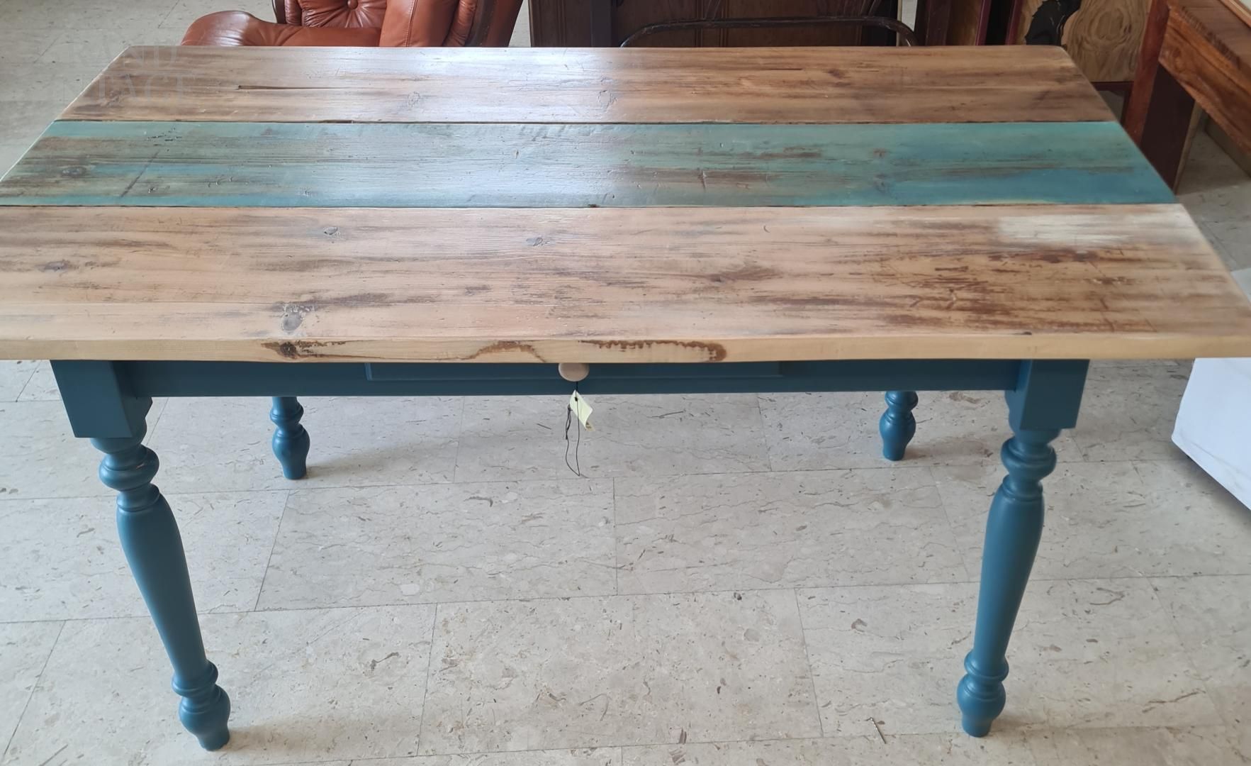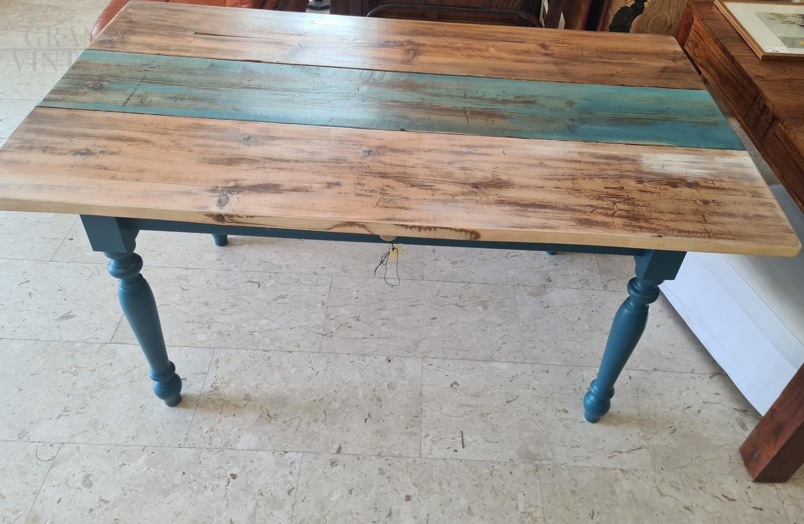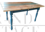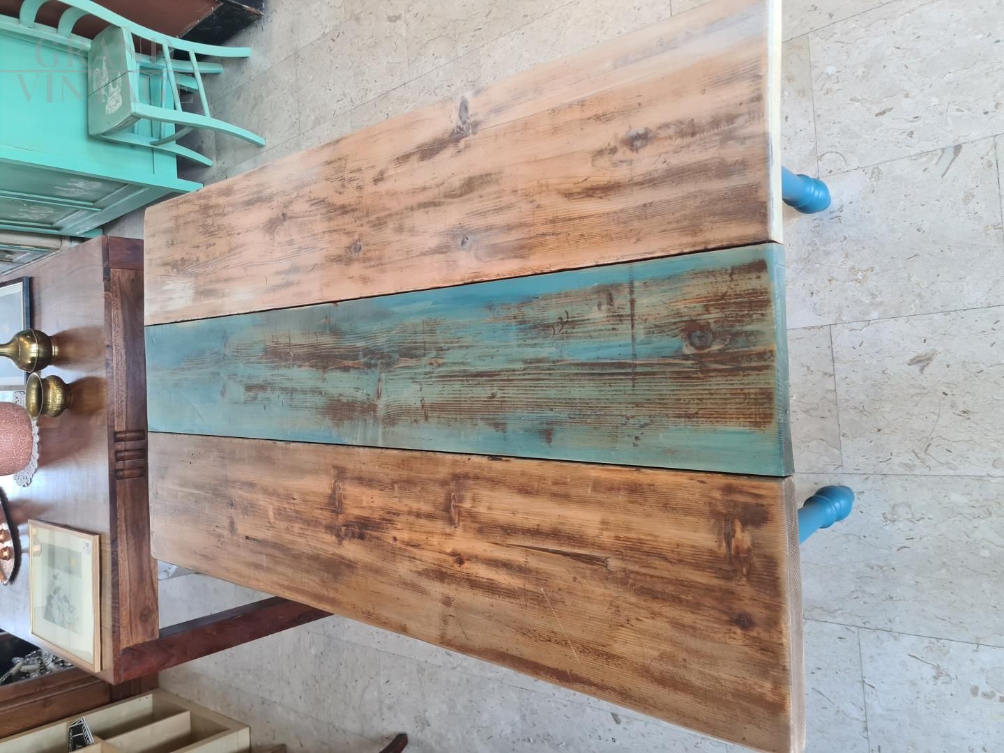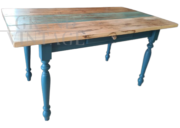Rustic country style dining table with wooden top with old recovered plank repainted in blue, and blue wooden structure with drawer and turned legs.