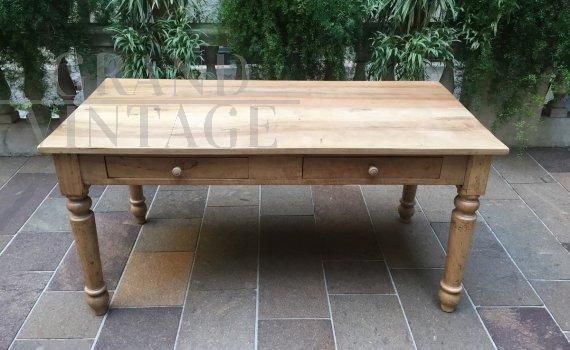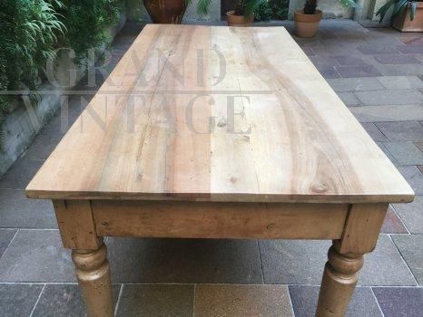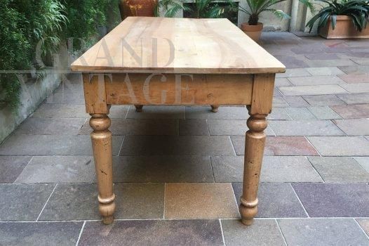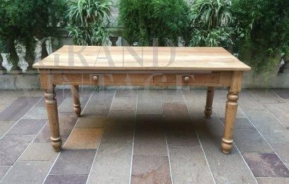 Country style dining or kitchen table in natural color wood with turned legs and drawers.