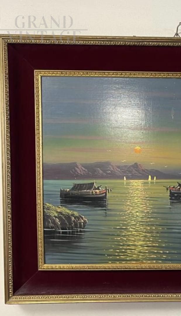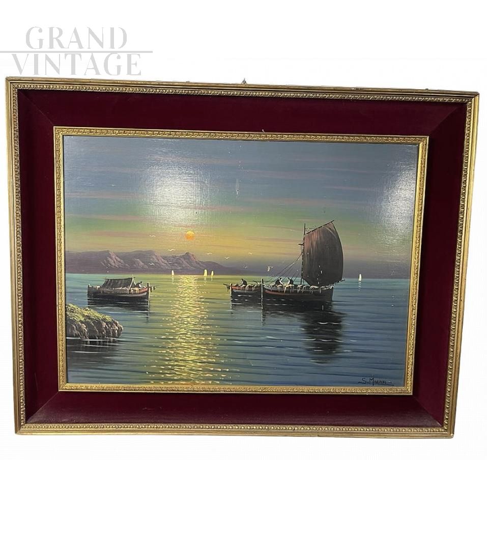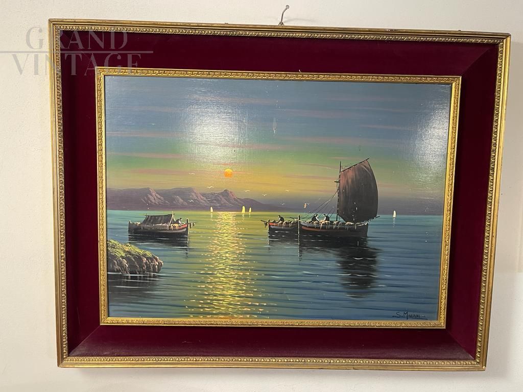 Oil painting on canvas signed S. Mariani depicting fishing boats offshore under the sunlight, from Italy mid-1900s.