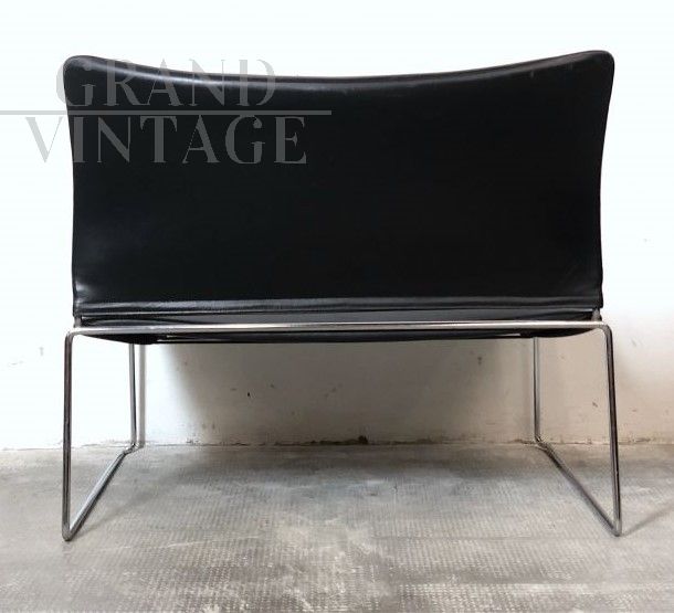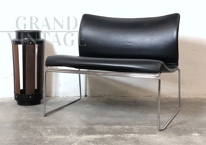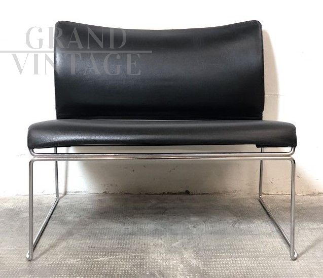 Beautiful Saghi armchair by Kazuhide Takahama for Simon Gavina, Made in Italy, with stackable structure in bent metal rod and electro-induction welded, with chrome finish in perfect condition, and seat and back padded with expanded material and covered in black leather. In perfect condition. Measurements: Height 63 cm, Width 74 cm, Depth 57 cm, Seat height 40 cm.