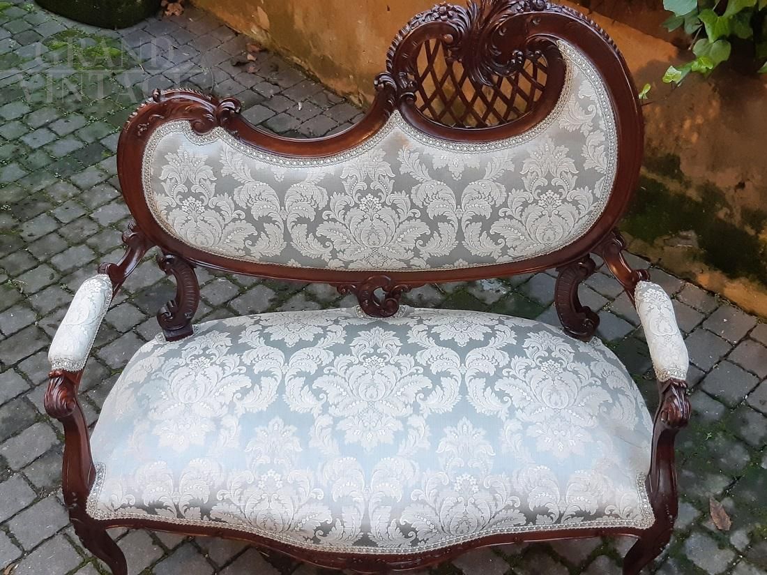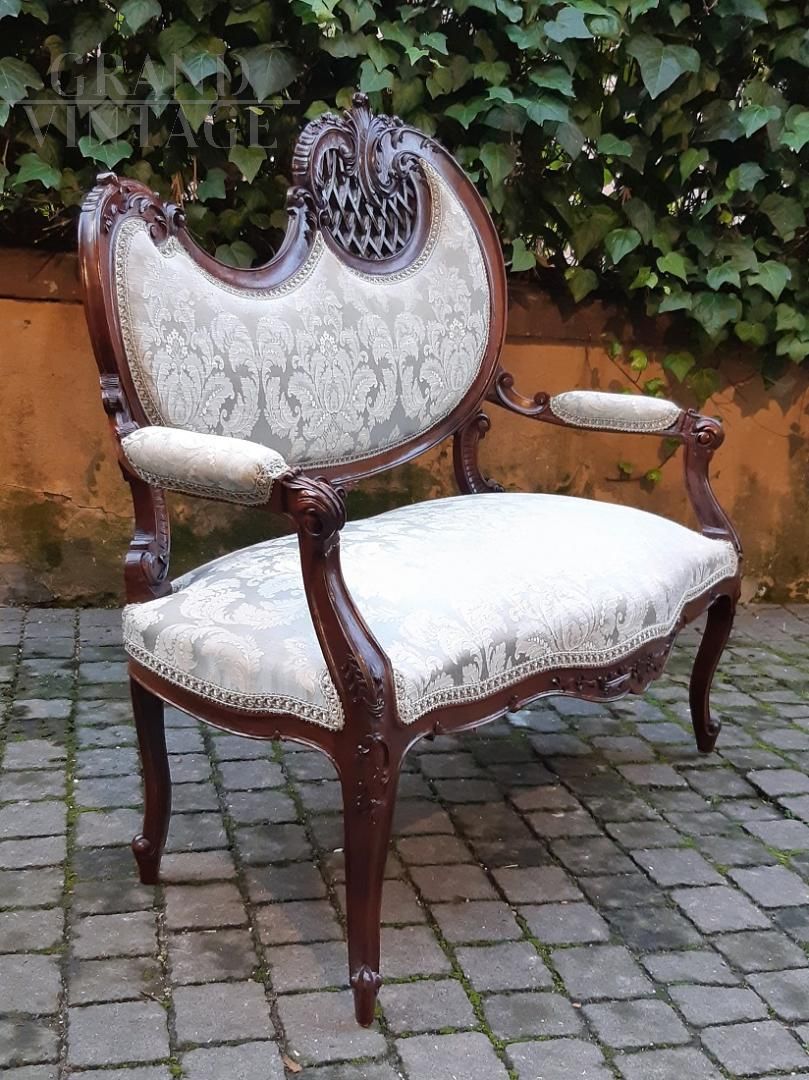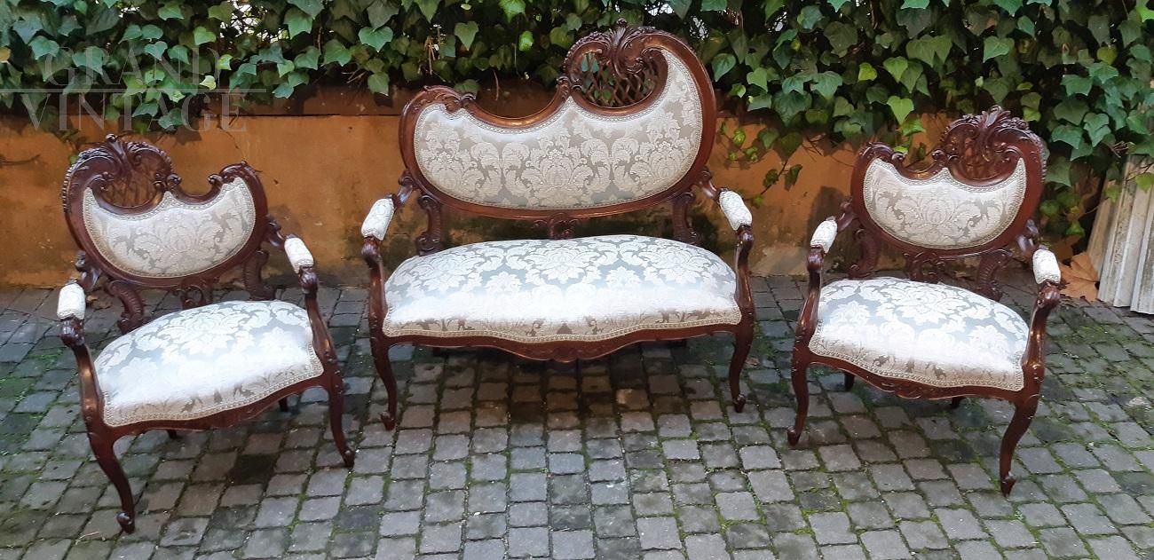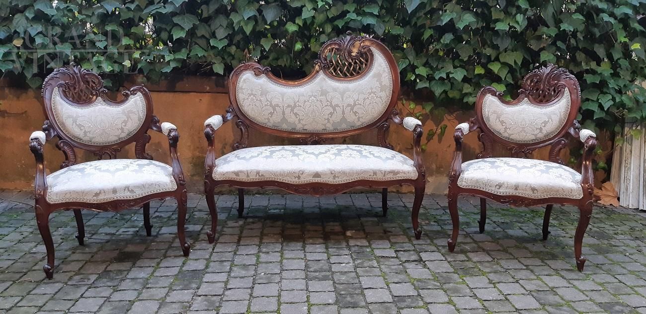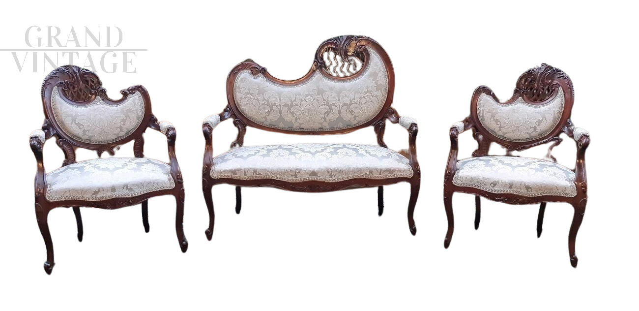 Refined small Liberty Art Nouveau lounge composed of a sofa and two armchairs. We are in the early 1900s and the design is among the most sought after in the style, the so-called gondola, so named because of the highly sought-after shape of the backrest. The wood is finely carved and perforated mahogany. These sets of characters give the triptych flavor and versatility.