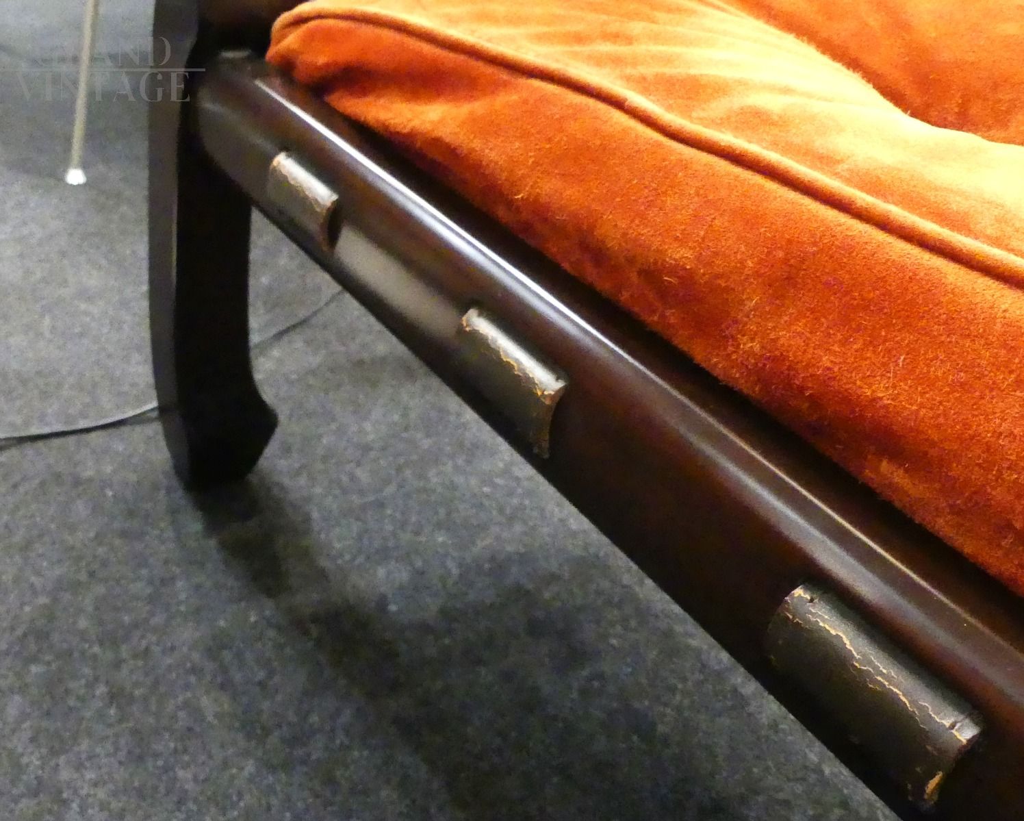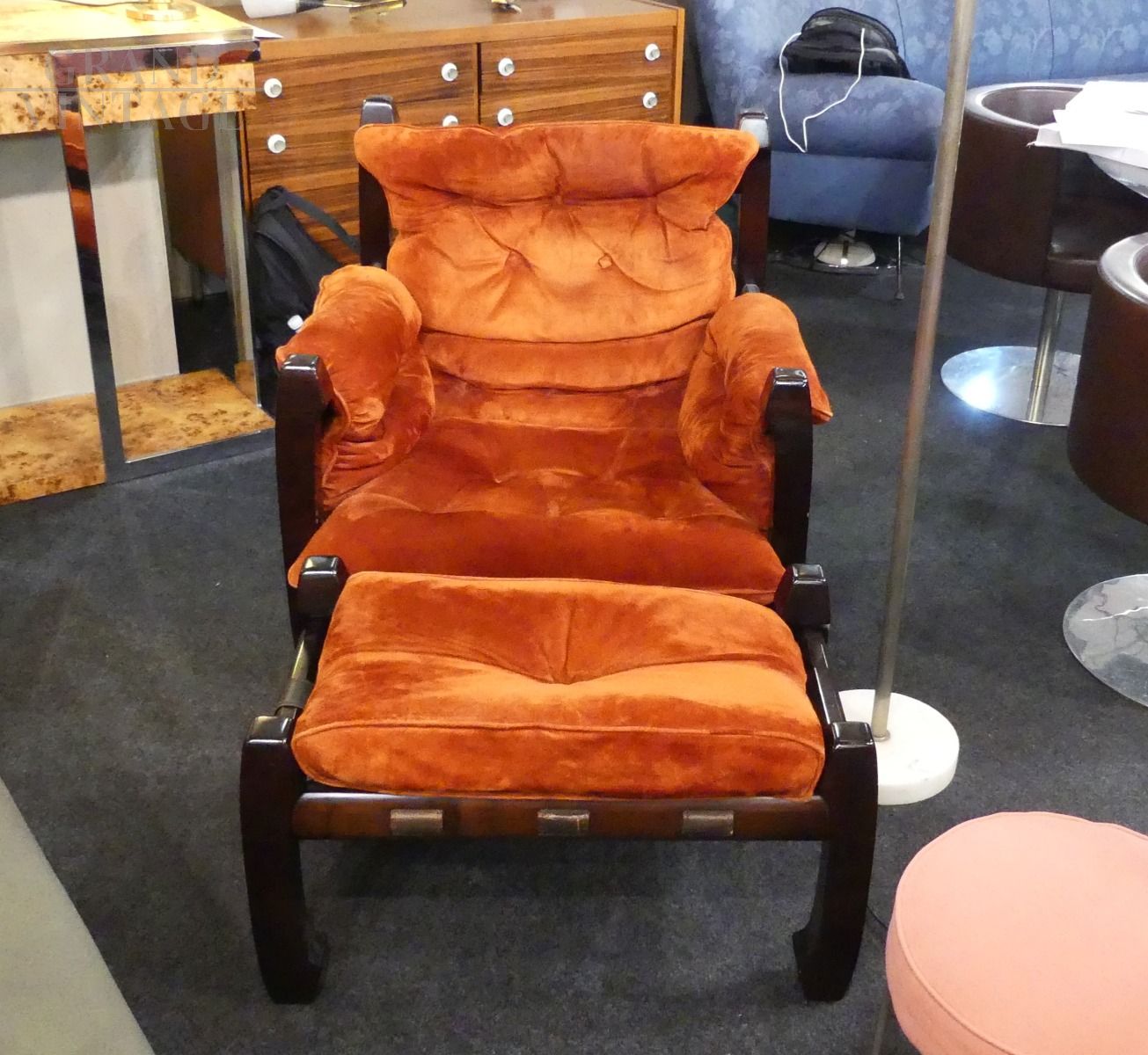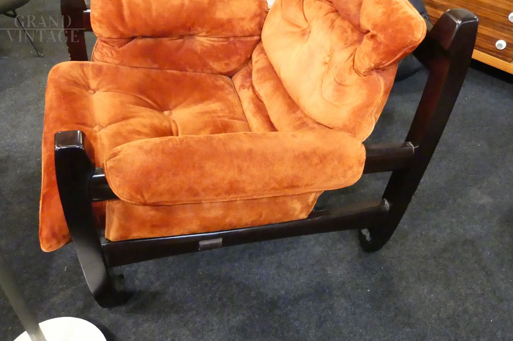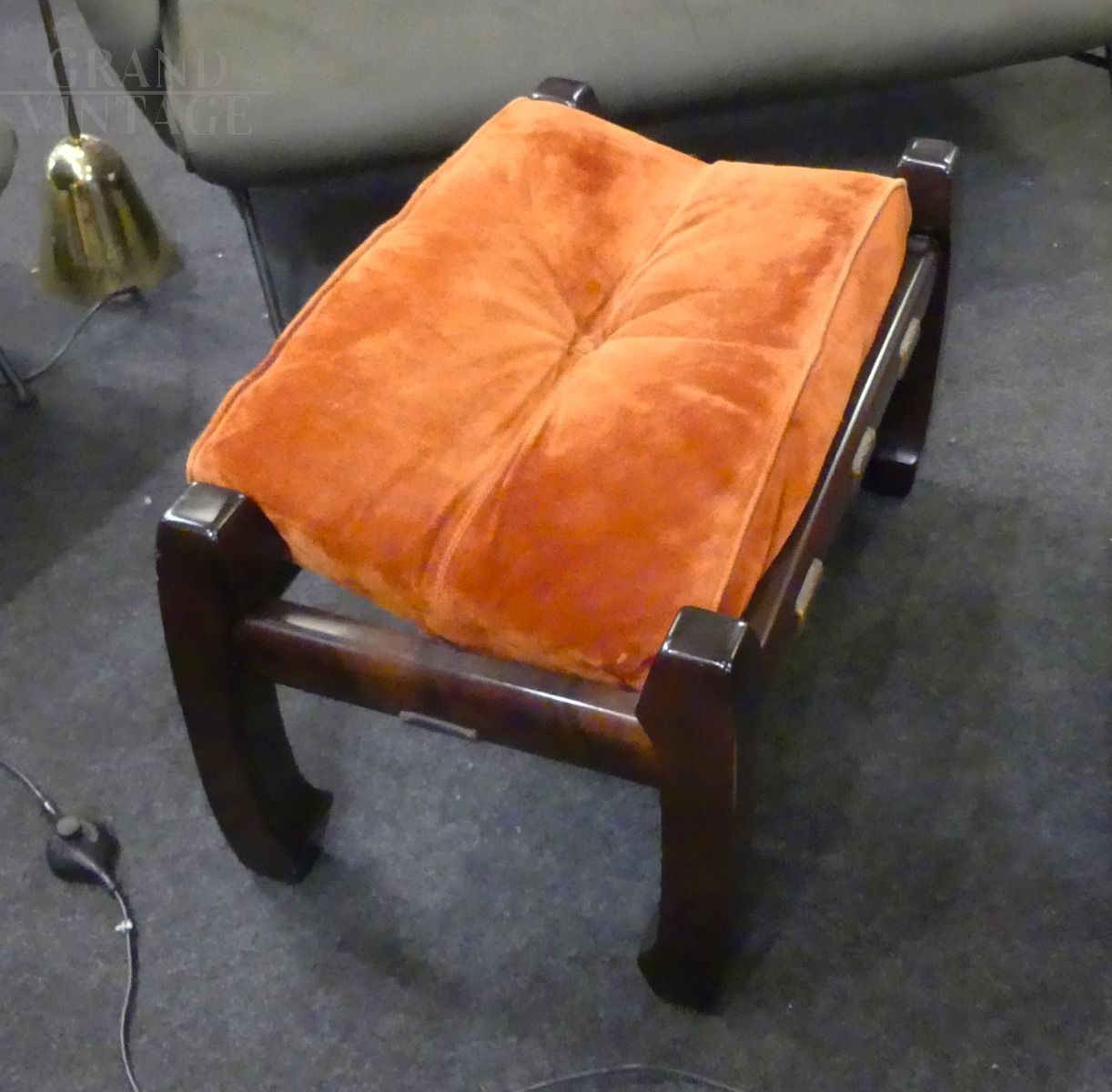 Beautiful Samurai model armchair with pouf by Luciano Frigerio, 1960s, covered in original orange alcantara, in excellent condition. The name of this set and its line, particularly accentuated in the shape of the feet, are inspired by the swords of Japanese fighters, and by the shapes of the ideograms typical of the language.